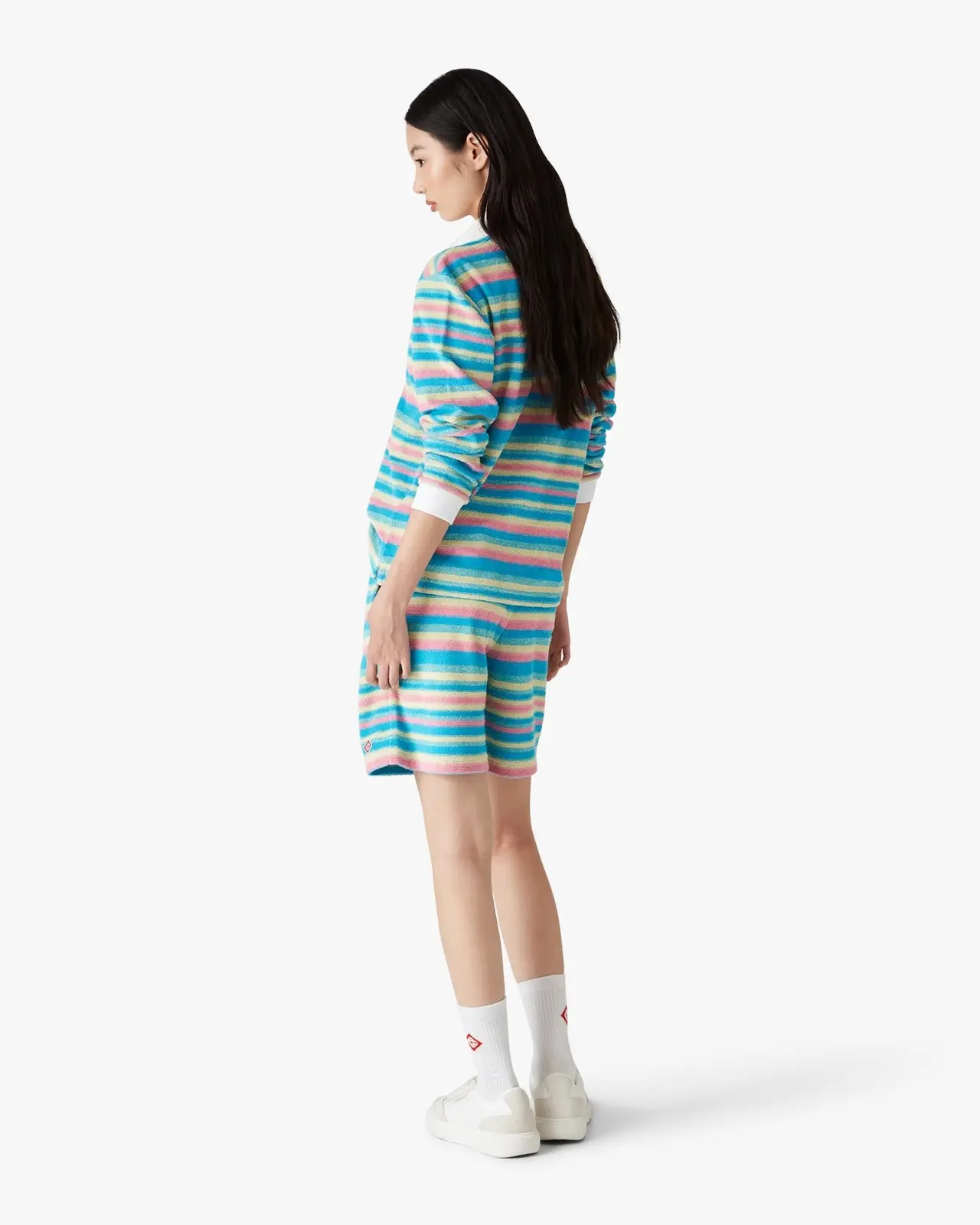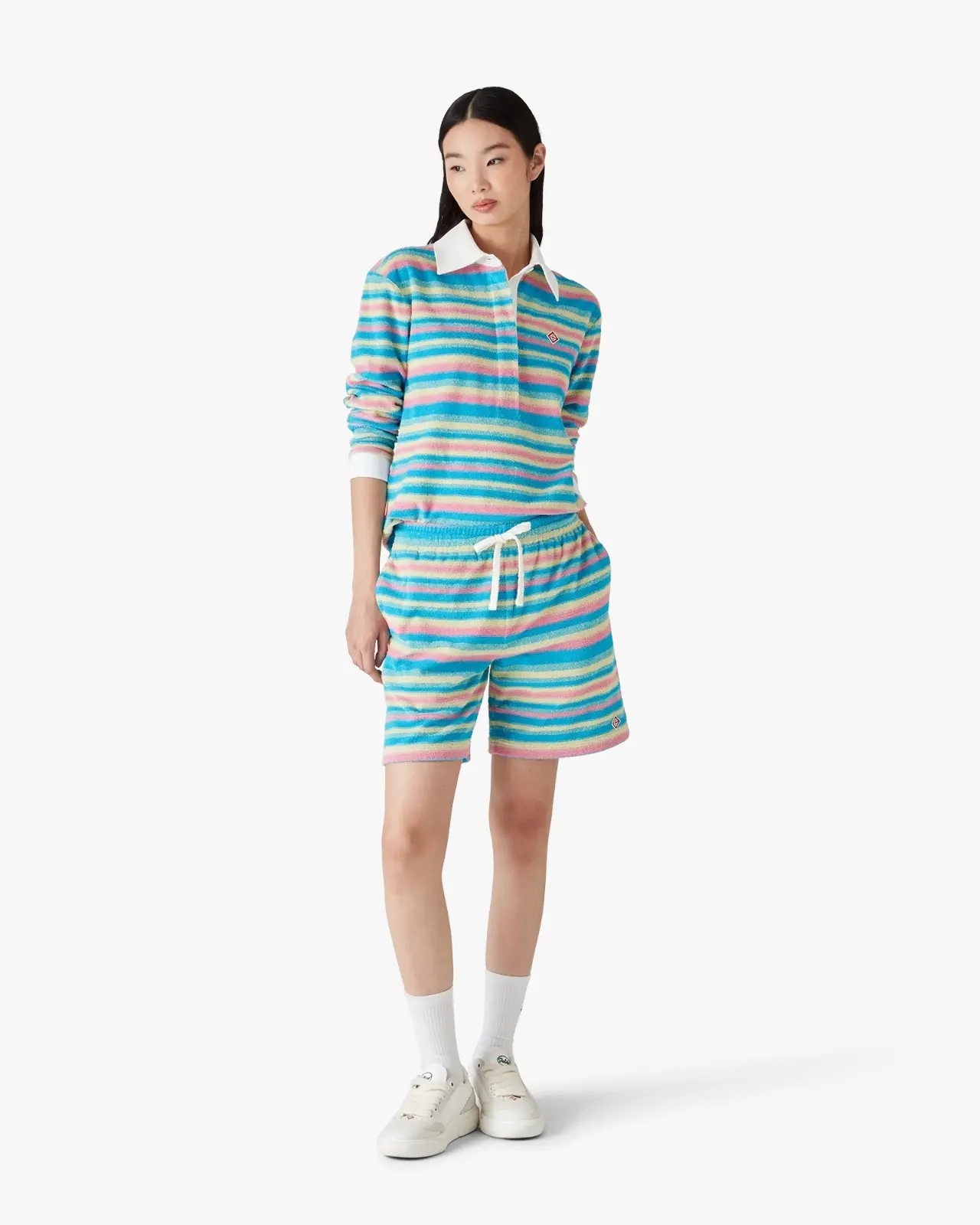 The stripe towelling polo shirt is a long-sleeve design crafted from towelling fabric and features the house's signature diamond logo. Completed with a contrast point collar and rib cuffs, a button closure, and a six-button placket featuring interlocking CC logo corozo buttons.