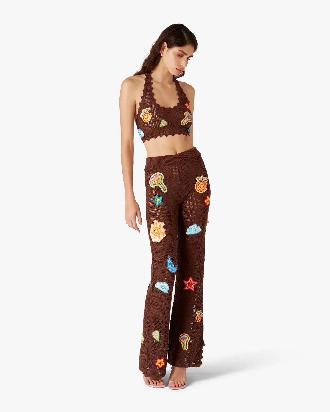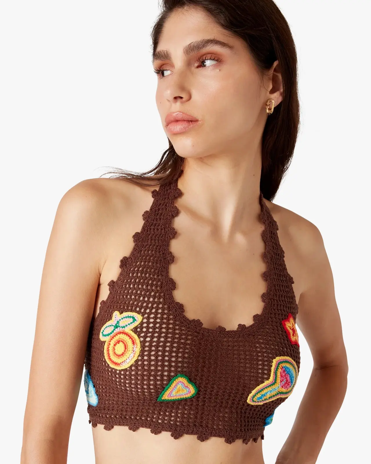 The motif crochet crop top is a halter neck design crafted from an open-weave crochet cotton fabric. Completed with motifs of the house's classic design elements, and string fastening at the back. This piece is intended to be worn with its coordinating motif crochet trousers.