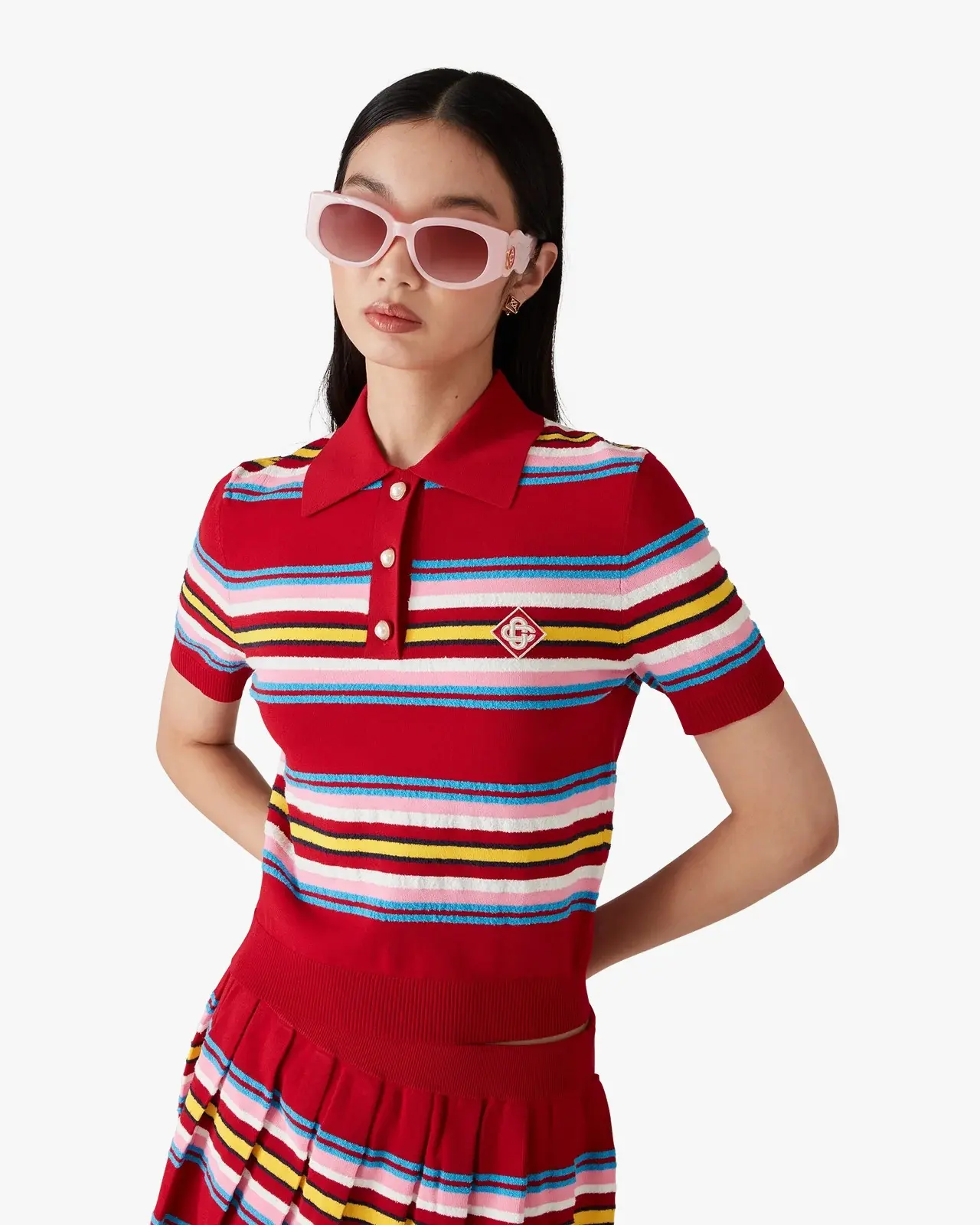The stripe polo shirt is a short-sleeve design crafted from stripe knitted fabric featuring the house's signature diamond logo. Completed with signature gold rim pearl buttons, three-button placket, and rib cuffs, hem, collar and placket.