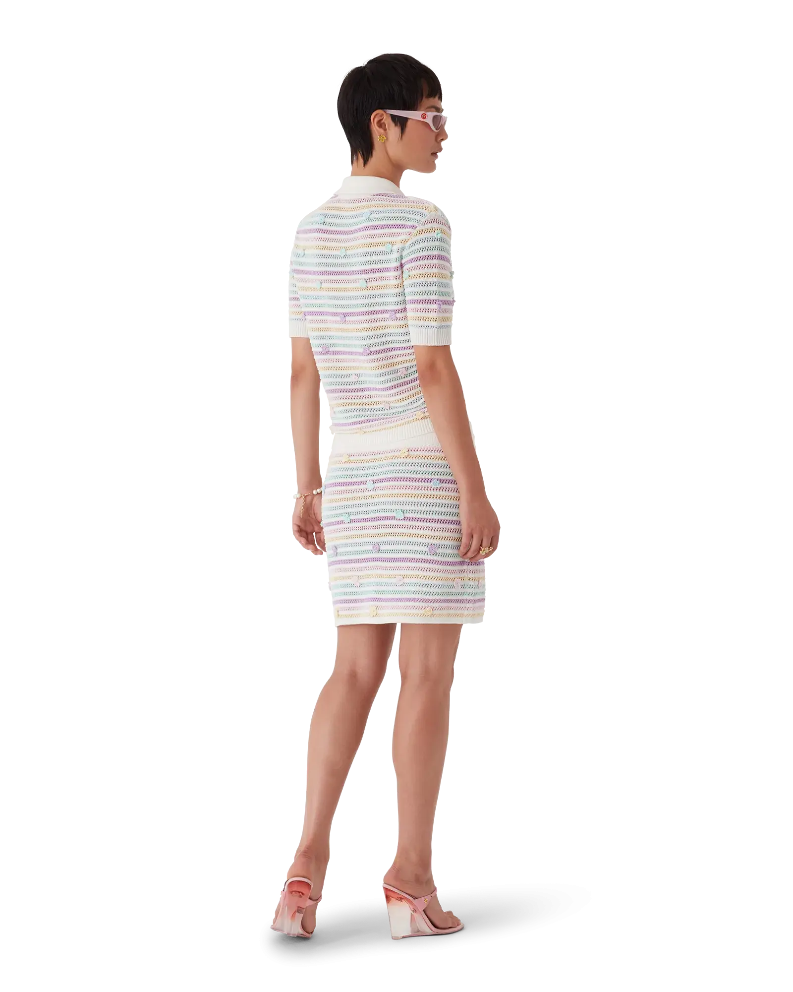 The flower stripe cotton crochet polo is a classic short-sleeve design crafted from an open weave cotton fabric. Completed with signature gold rim pearl buttons, flower motifs, a rib collar, cuffs, placket, and hem detail.