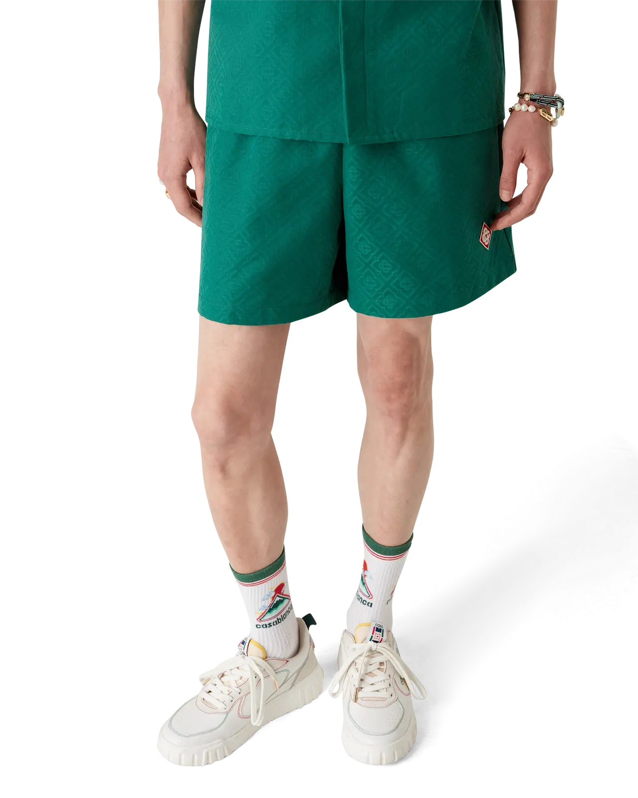 The cotton monogram jacquard shorts are a classic design crafted from a monogram cotton jacquard fabric. Completed with an elasticised waistband, gold-tipped drawstring fastening, a back pocket, and in-seam side pockets.
