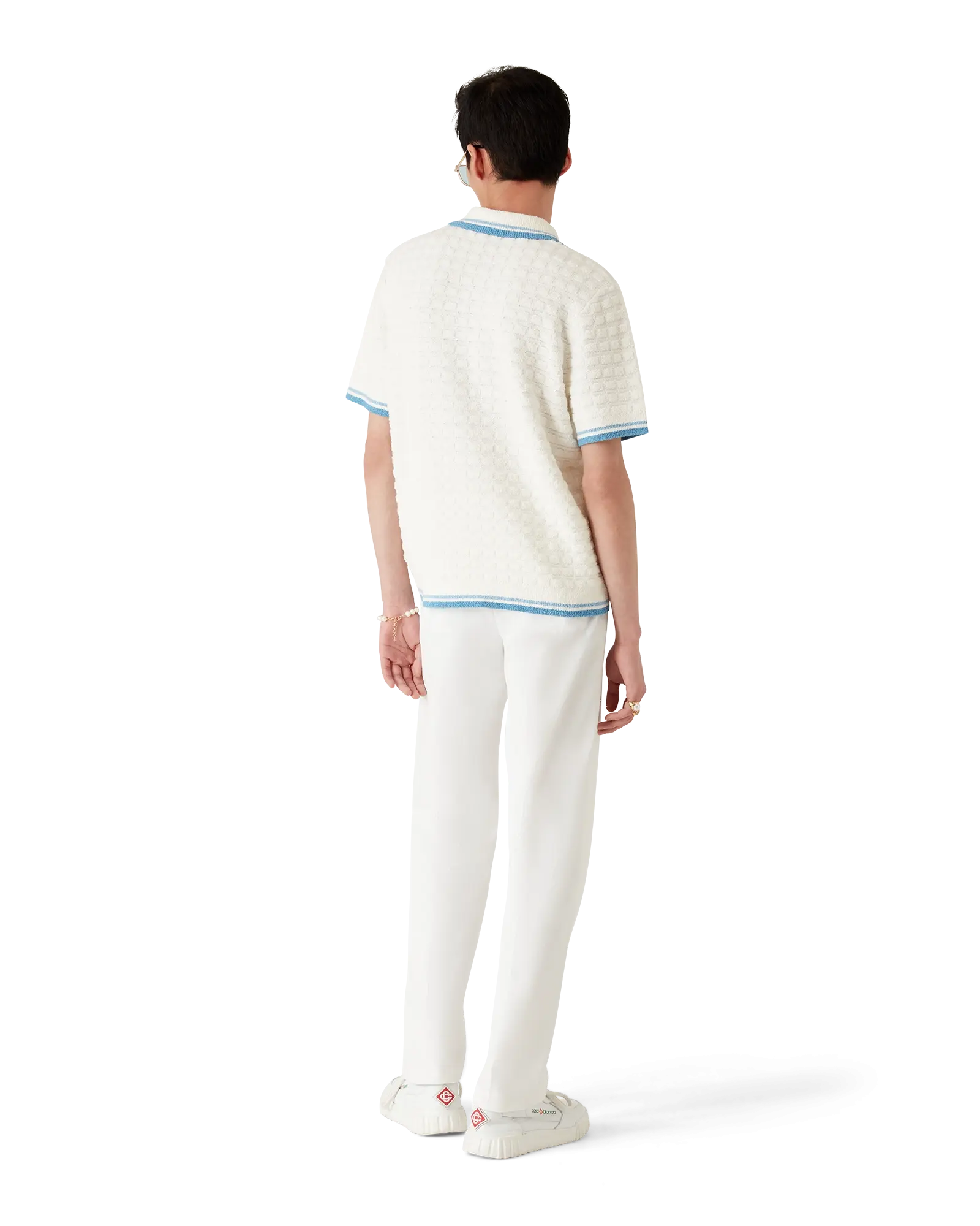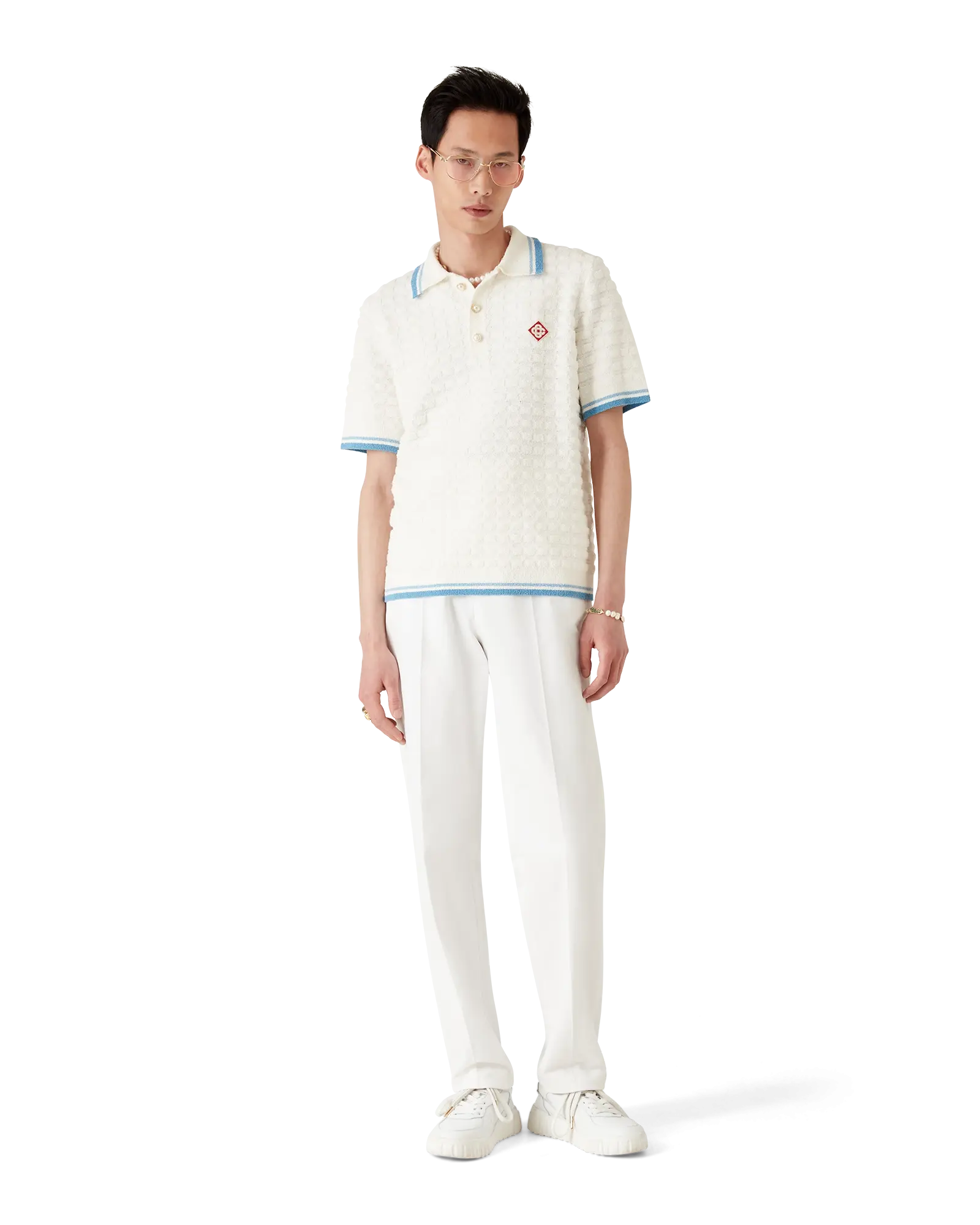 The boucle short-sleeve polo is a classic design crafted from cotton boucle fabric featuring the house's signature diamond logo. Completed with signature gold rim pearl buttons, a rib collar, cuffs, placket, and hem.