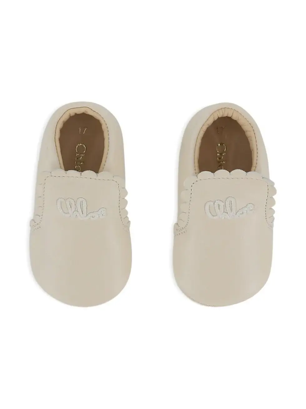 The Chloé Kids beige baby girl's first steps shoes with embroidered logo . Made of 100% leather, they feature a beige color, scalloped edges, embroidered logo, and a slip-on design.