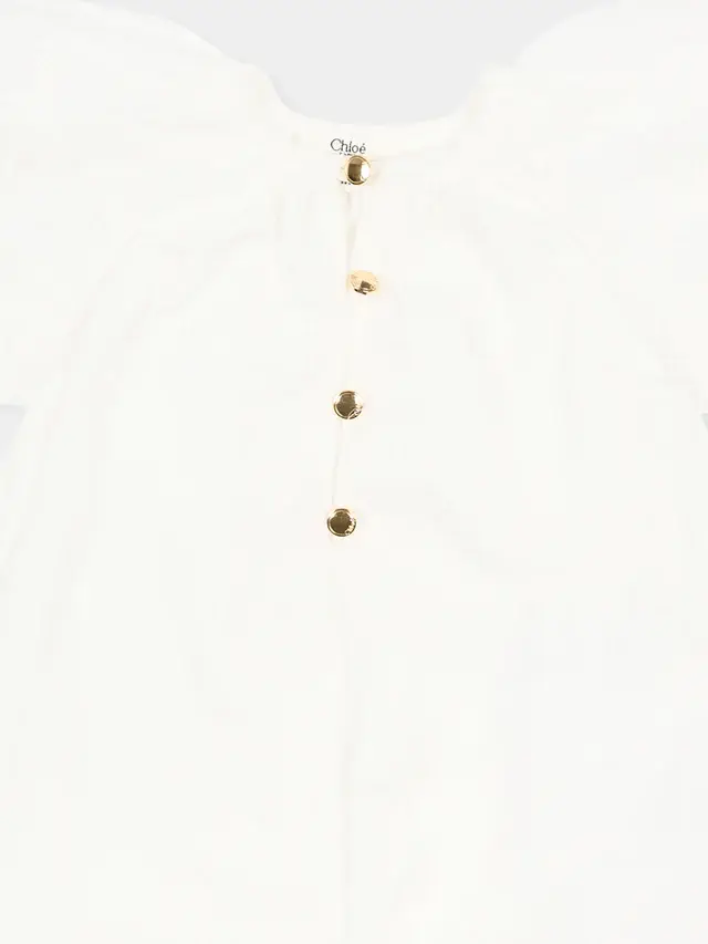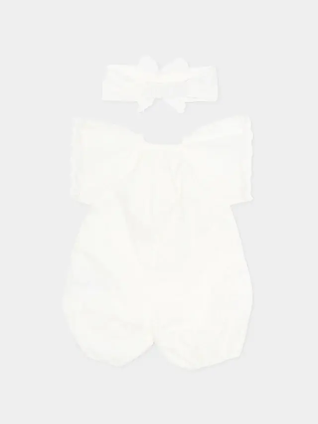 Ivory Chloé Kids romper in lightweight fabric with a delicate matte finish, offered with a matching headband. The butterfly sleeves are made of embroidered tulle with a lace effect, echoed in the large bow of the headband for a harmonious look. The front is finished with small golden buttons and the rounded bottom features soft elasticated edges against the skin. The metallic logo applied on the side completes the essential design, enhancing the soft volume of the garment.