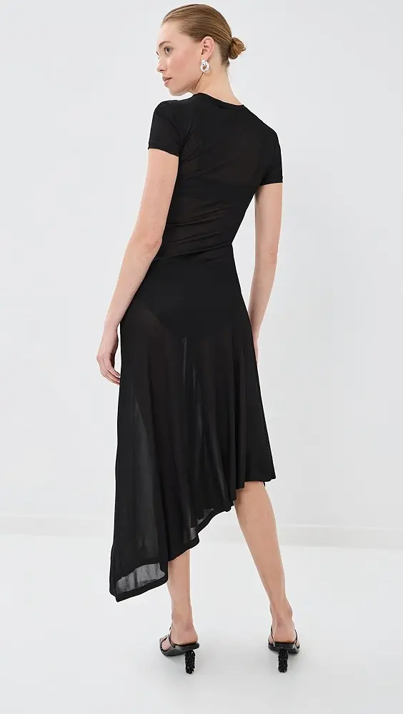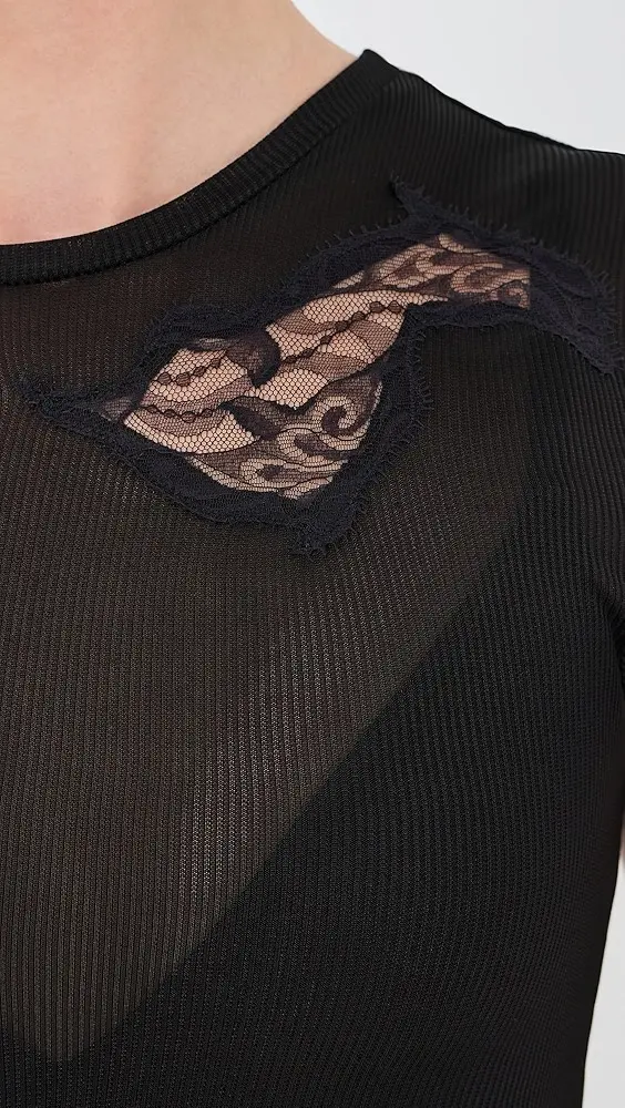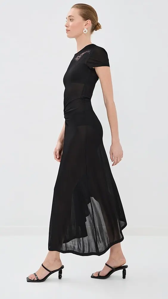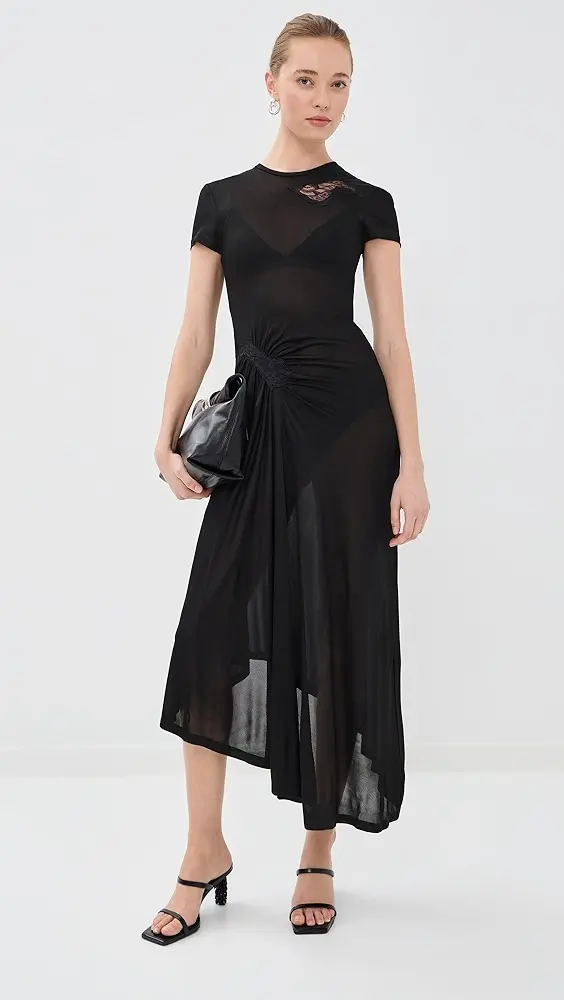 Asymmetrical hem Lace accents Ruched detail at waist Midi length Crew neck Short sleeves Pullover design, no closure Semi-sheer Shell: 95% viscose/5% elastane Trim: 100% nylon Unlined Dry clean Imported, Vietnam