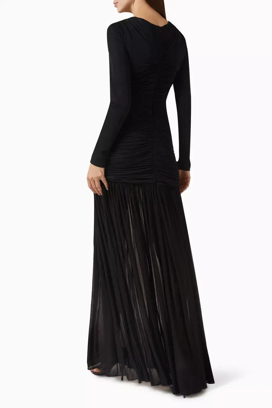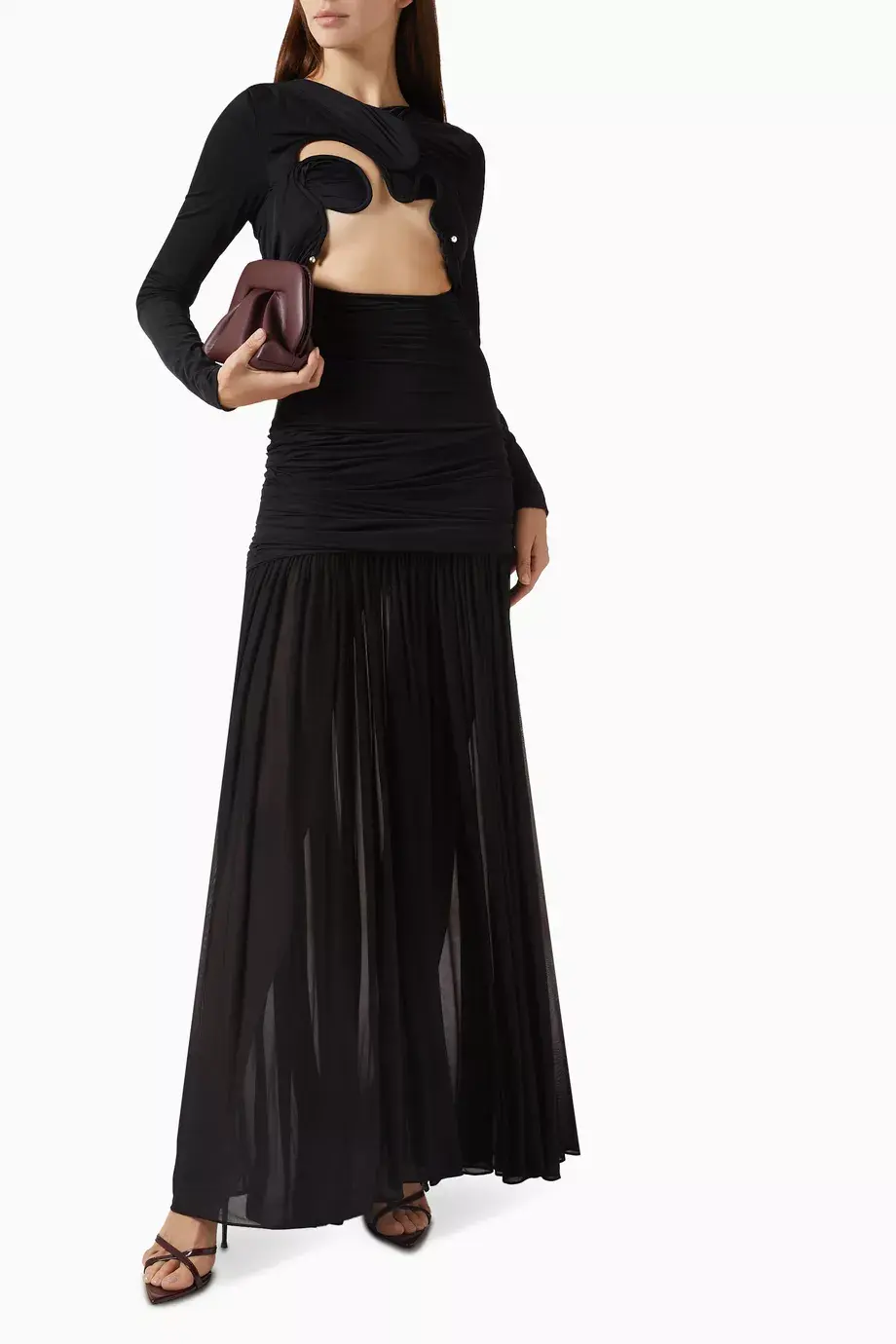 Christopher Esber’s Venus Gown sculpts the body with cut-outs and metal accents. A ruched bodice adds shape, while the sheer pleated skirt brings movement—perfect for evening events.