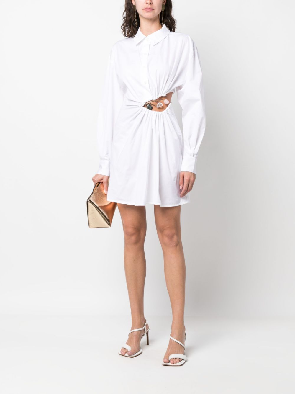 Folia gemstone-detail cut-out shirt dress Highlights optical white cotton poplin texture gemstone detailing cut-out detailing gold-tone hardware pointed flat collar front button fastening long sleeves buttoned cuffs straight hem above-knee length Composition Cotton 100% Washing instructions Hand Wash Wearing The model is 1.77 m wearing size 8