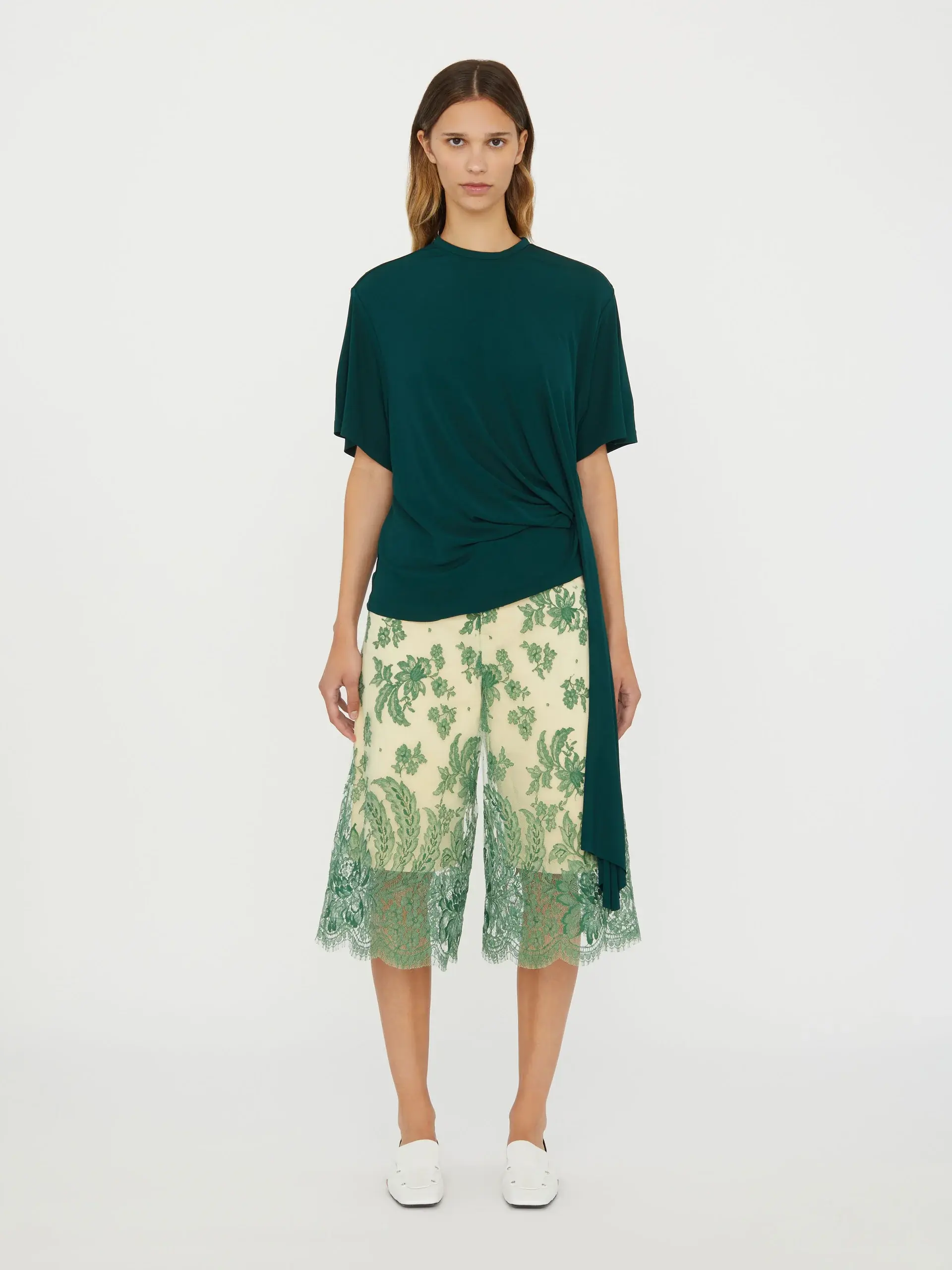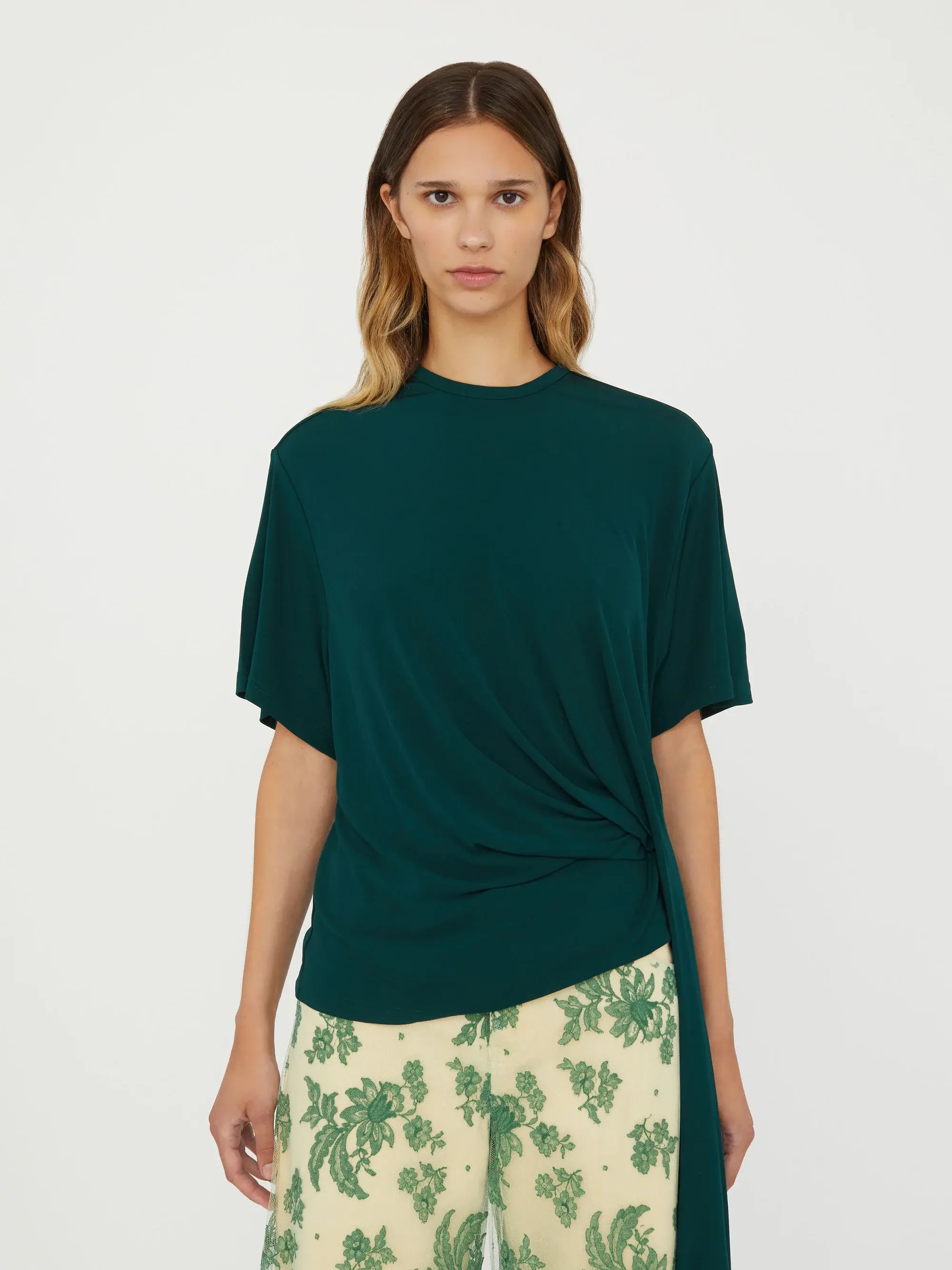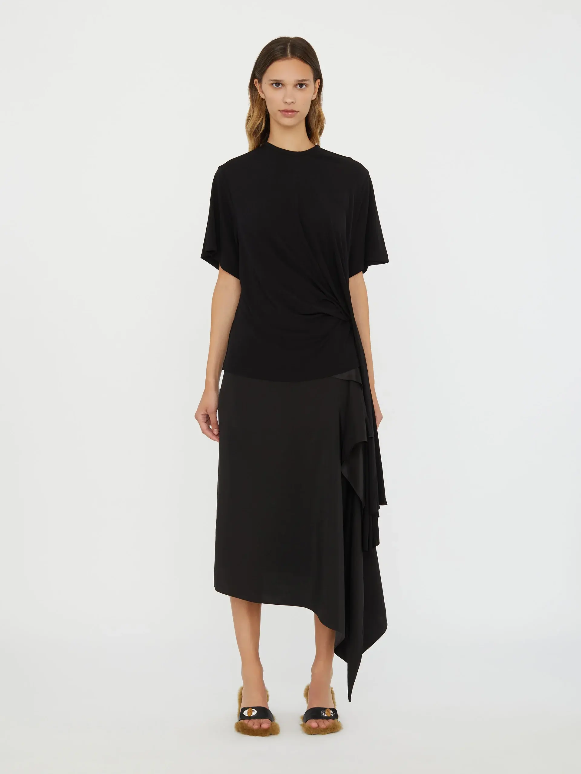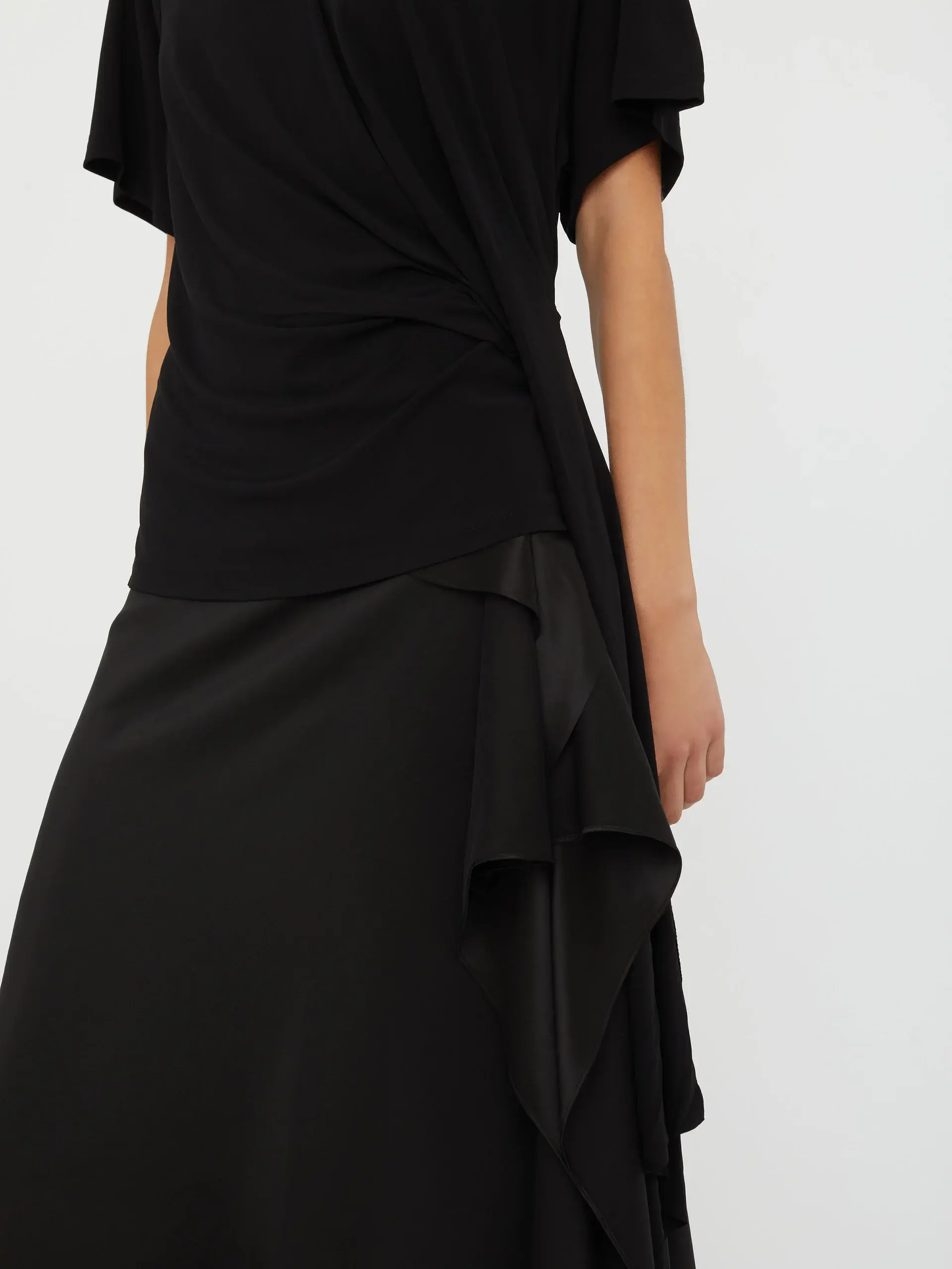-white -crew neck -short sleeves -side cowl drape -straight hem