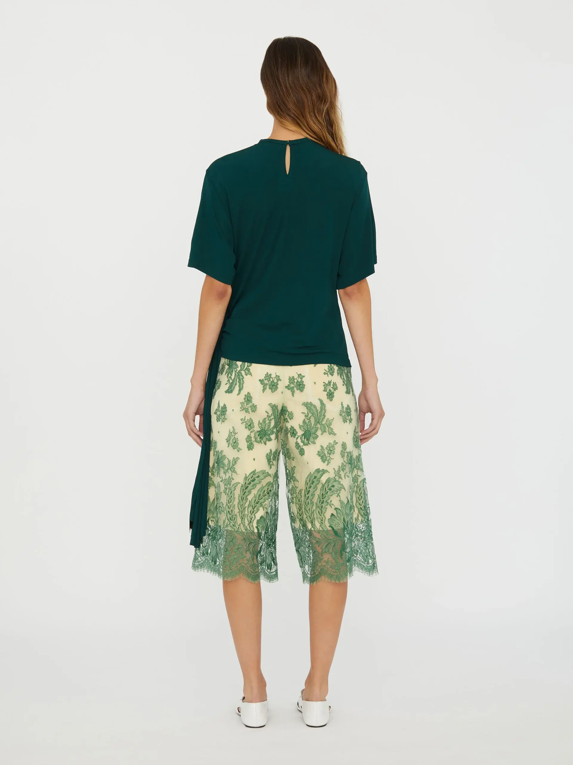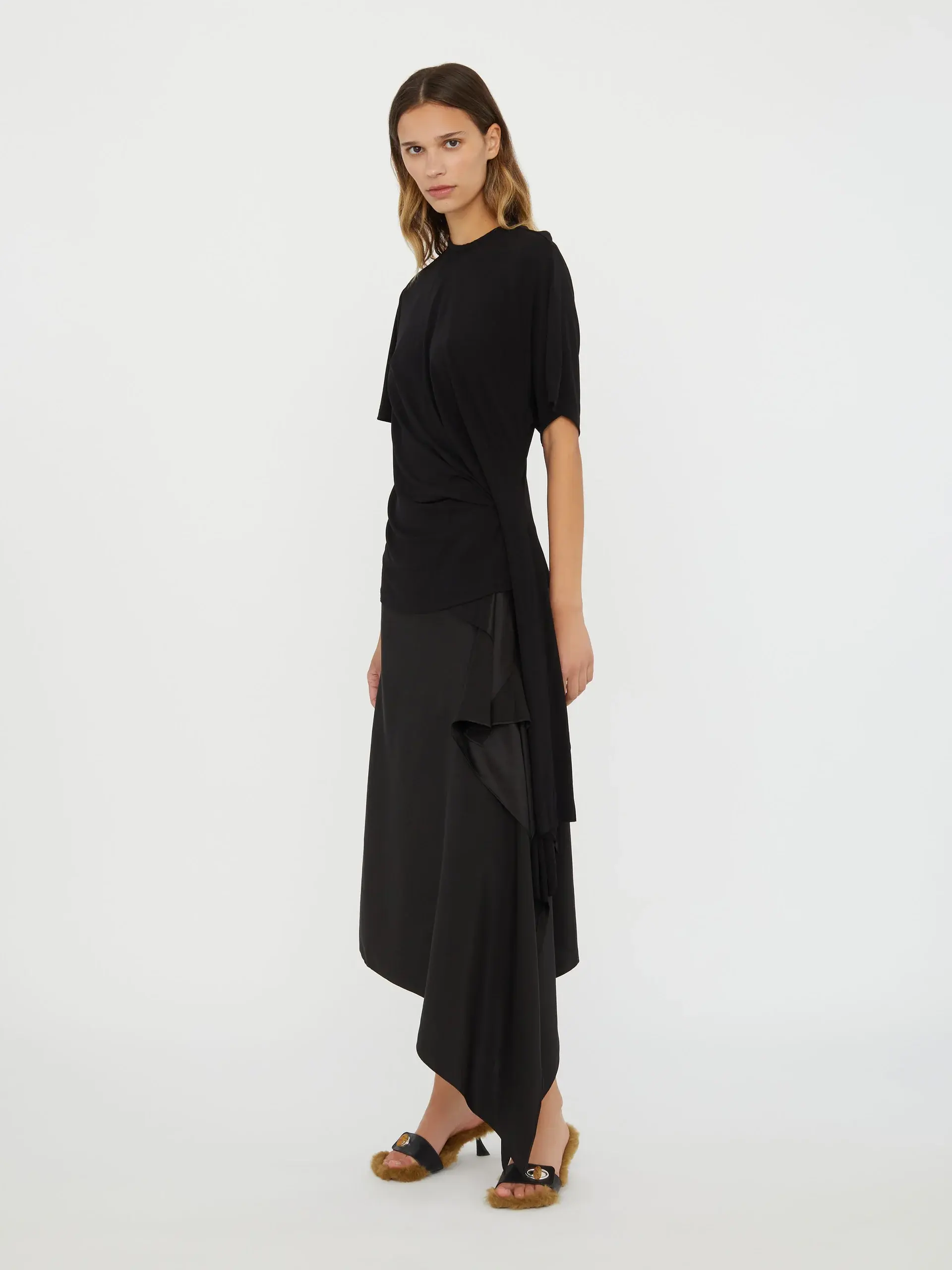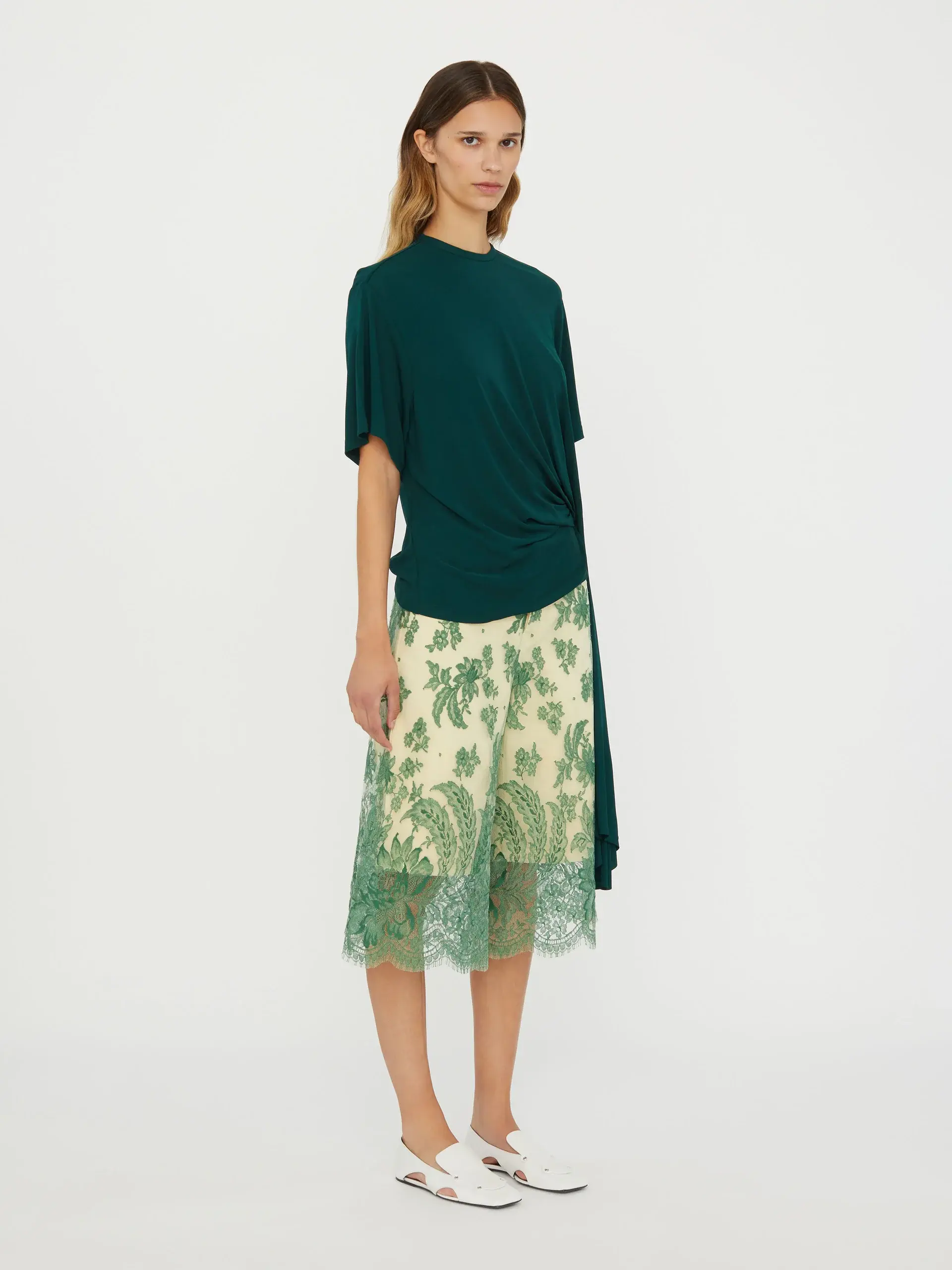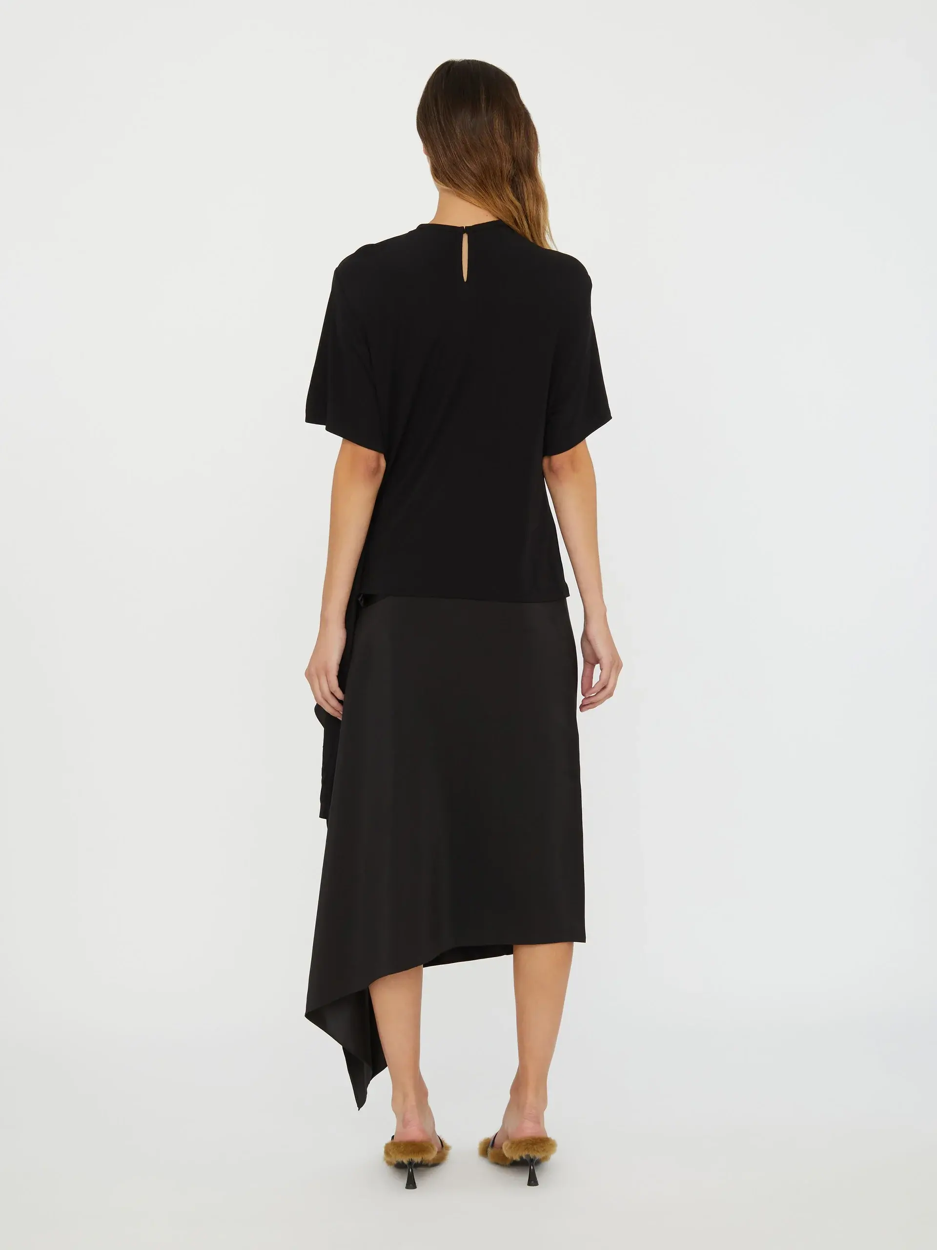 -white -crew neck -short sleeves -side cowl drape -straight hem