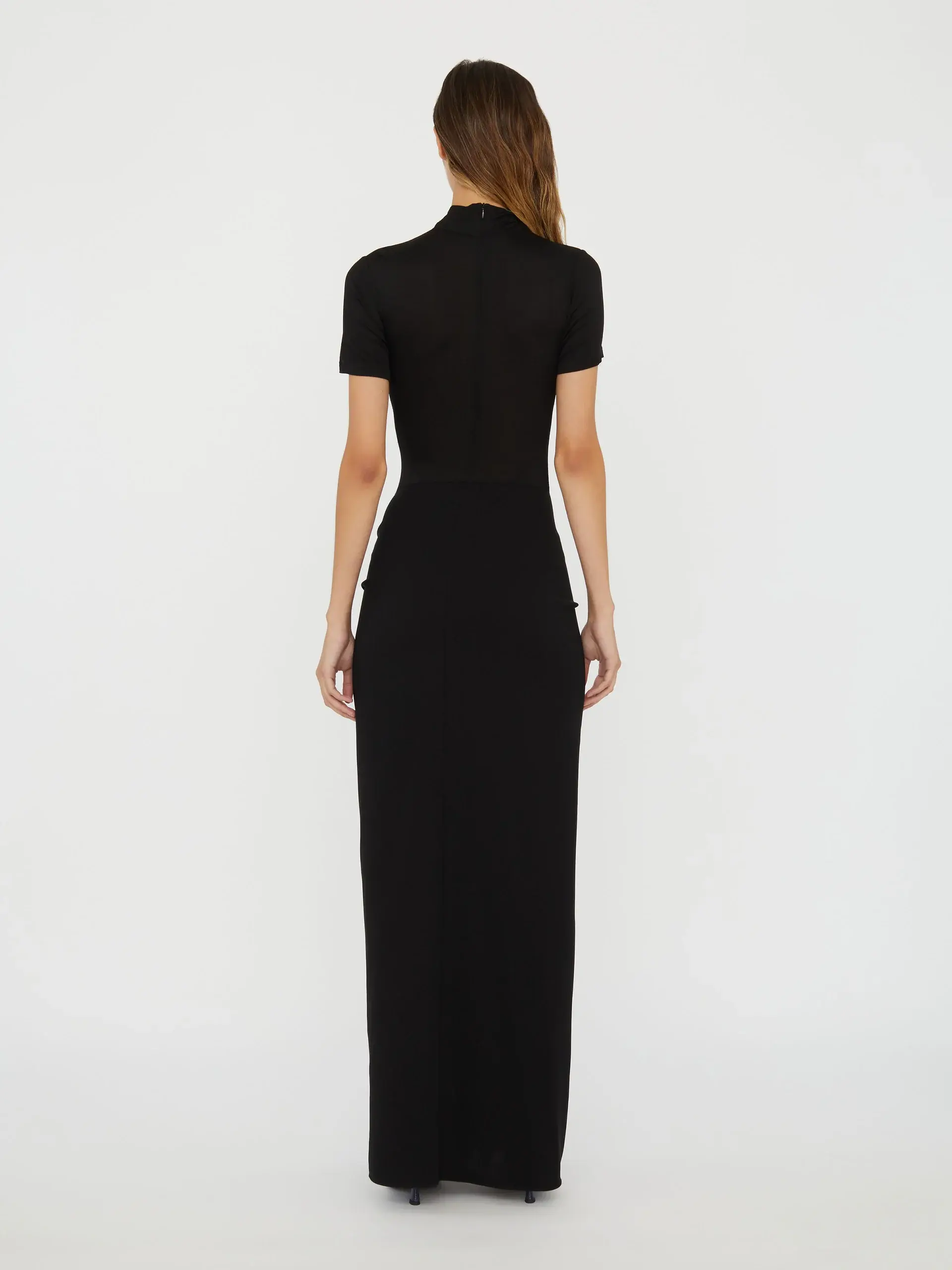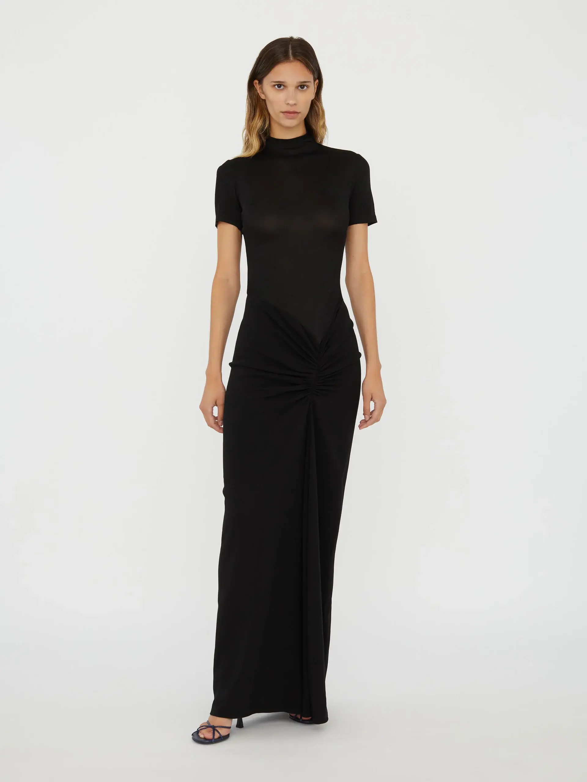 A ruched tee gown that features a sheer luxe rib short sleeve tee bodice, contradicted with a natural faille ruched maxi hem.
