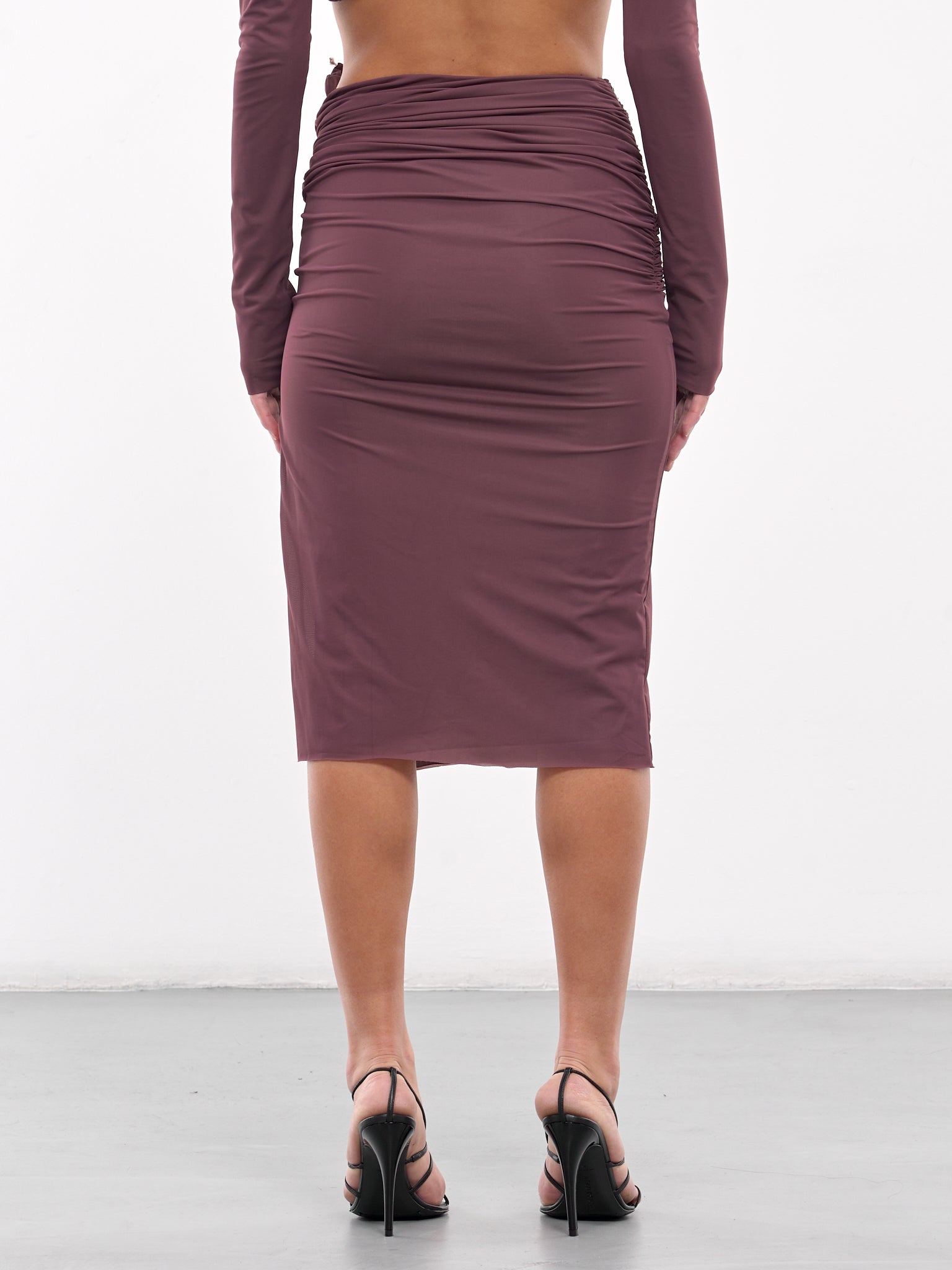 CHRISTOPHER ESBER skirt in mahogany, paneled stretch nylon construction, high waist, ruching, internal boning, side slit, straight hem, midi-length, slim fit.