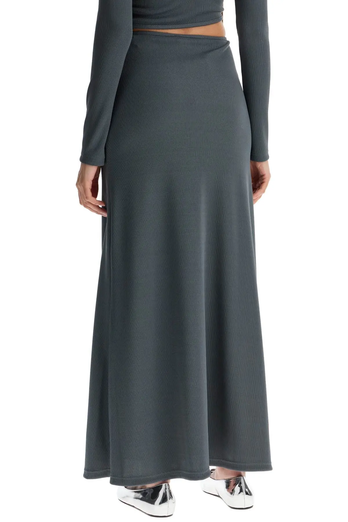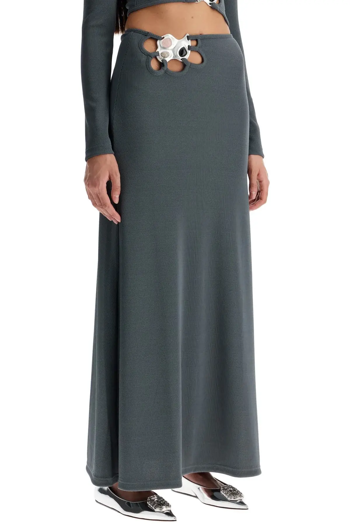 The Christopher Esber long skirt features a slightly flared silhouette, crafted from soft ribbed stretch fabric. It is adorned with a metal and stone accessory at the waist, highlighted by cut-out details.