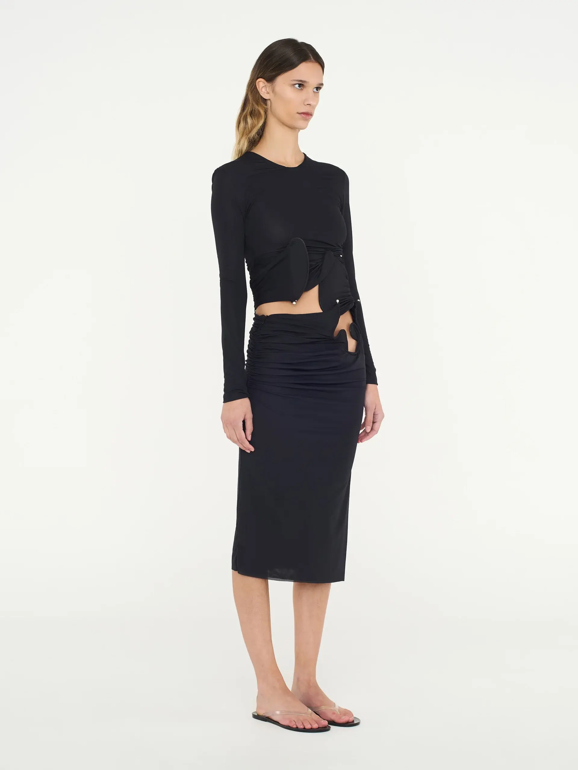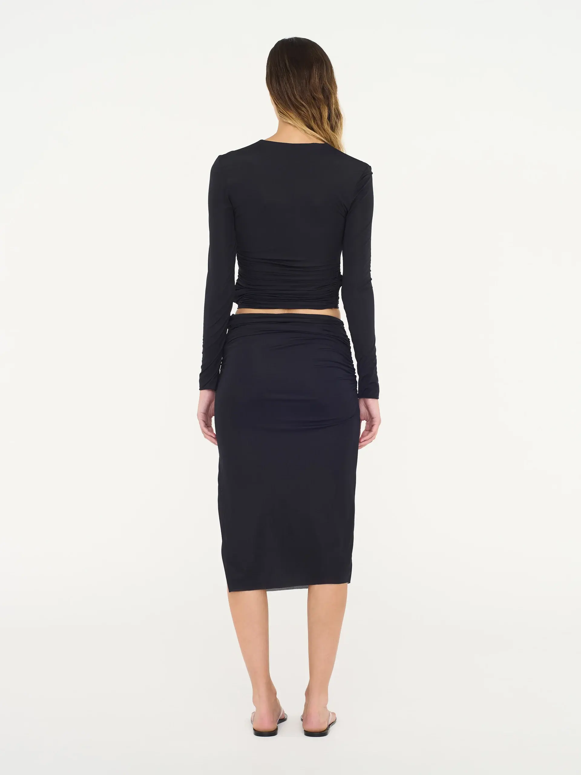 Sculptural hardware anchors fine Italian jersey to form around the body. Ruched gently at the side seams, this column midi skirt is finished with a side split for ease of wear.