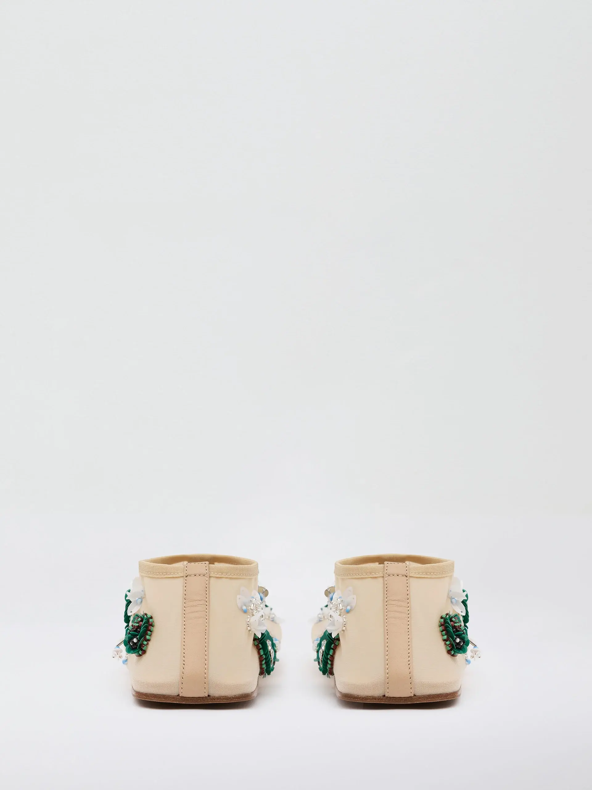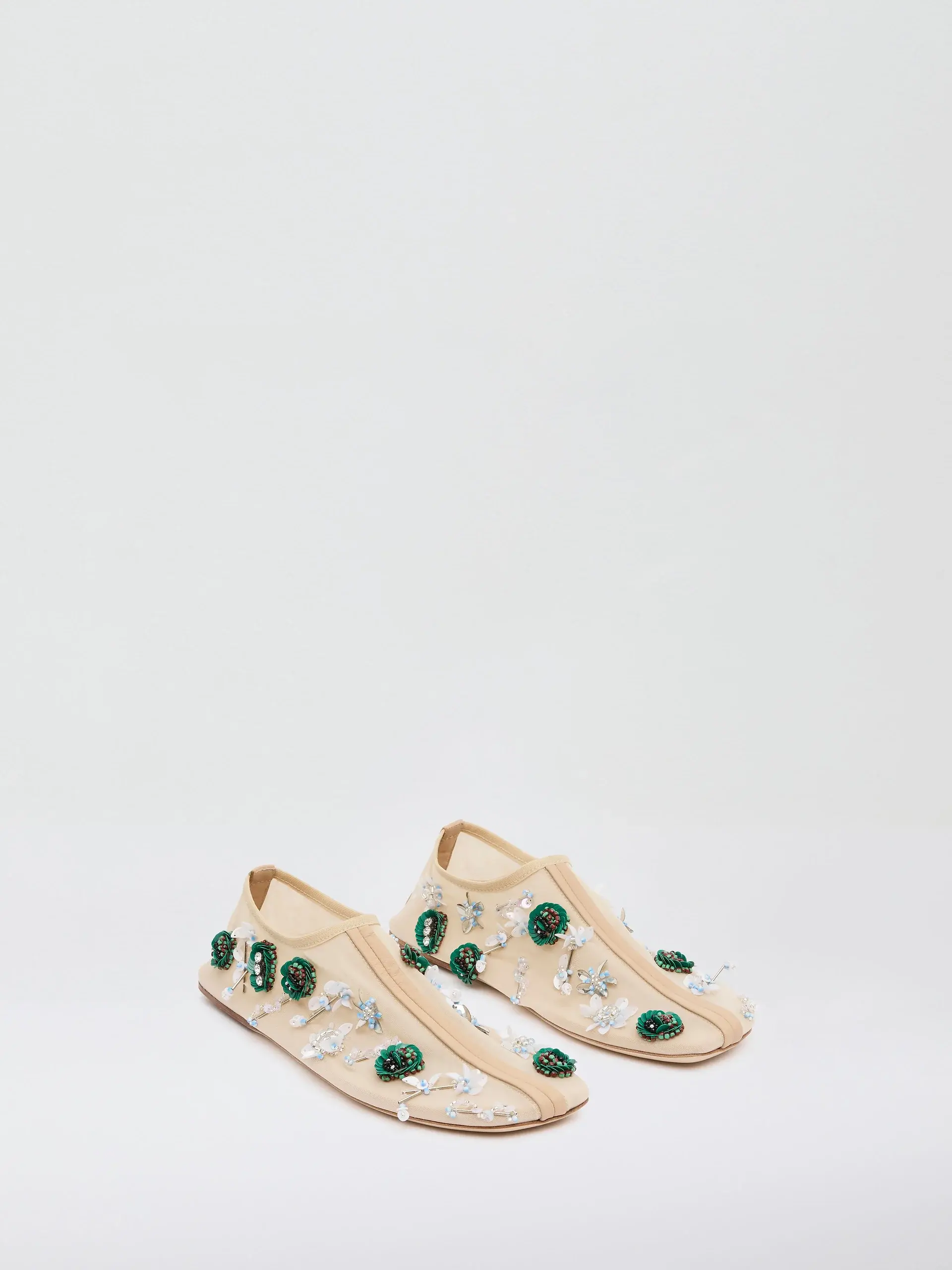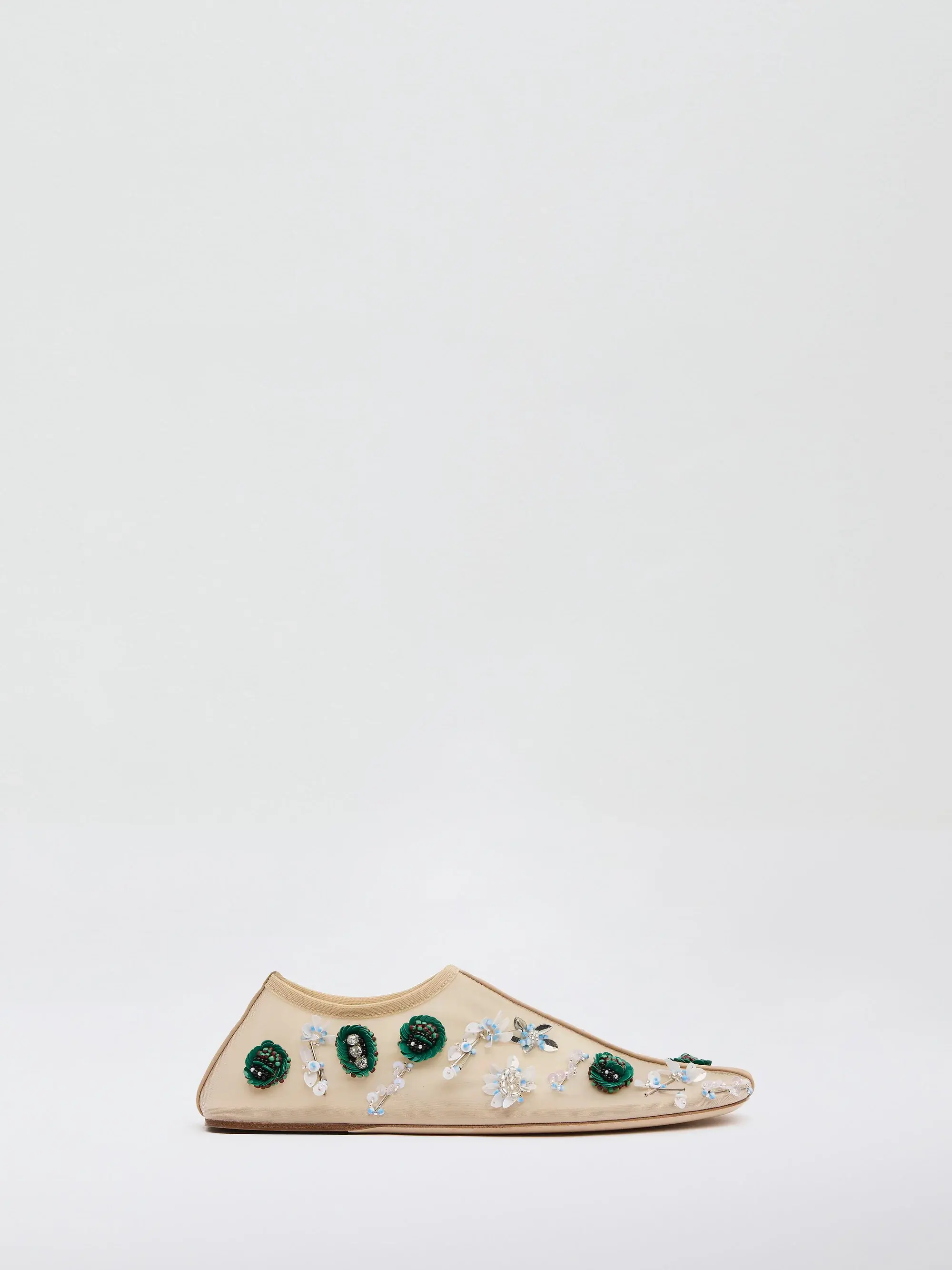 Adorned with glass embellishments that appear as colliding clusters. This sheer slip on flat is crafted in Italy of airy mesh traced by a graphic soft calfskin trim.