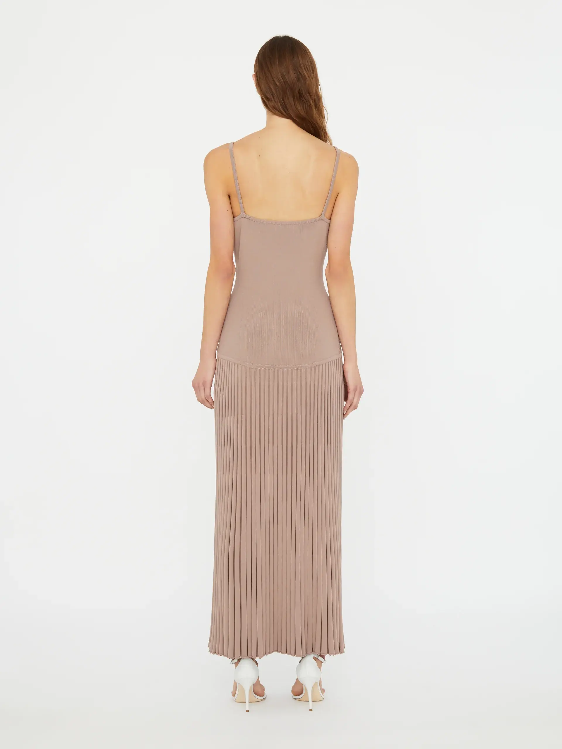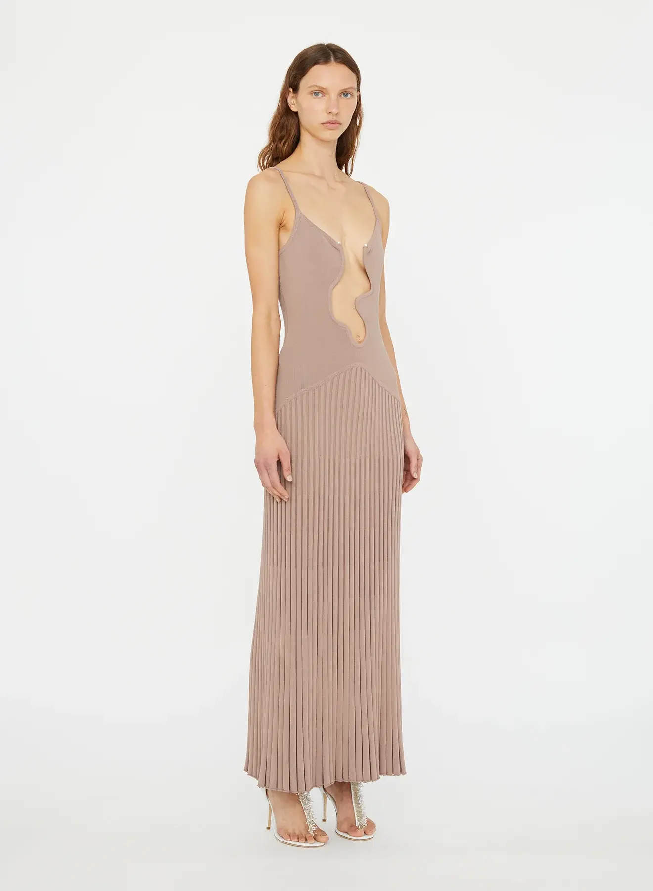 Sculpted wire wave formation hardware Full length silhouette Sleeveless with fine built in straps Sunray pleated skirt True to size 80% Viscose 20% Nylon Hardware: 100% Zinc Dry Clean Only Claire is 179cm/5'10.5" and wears size AU 8 (US 4) AU sizing