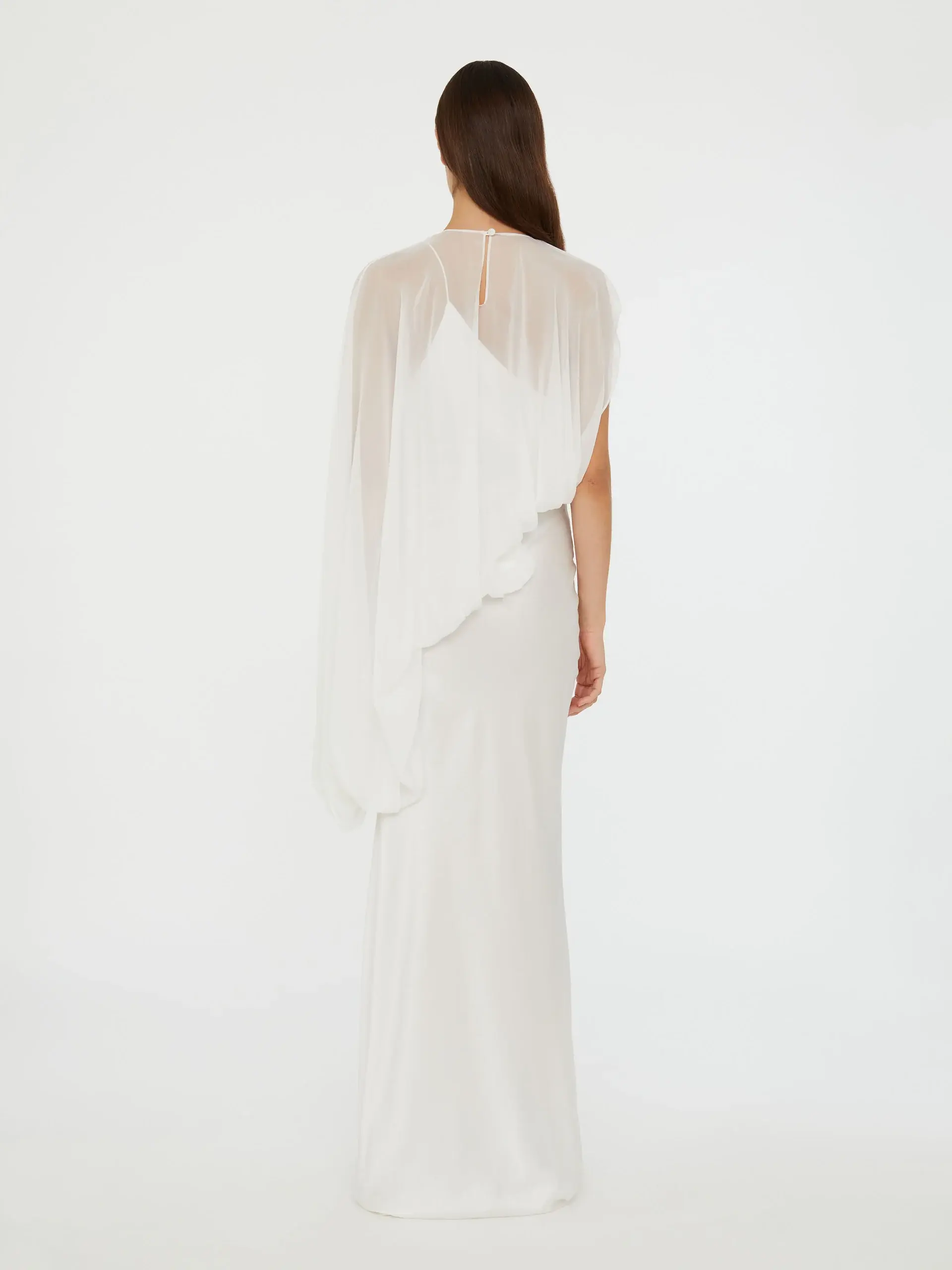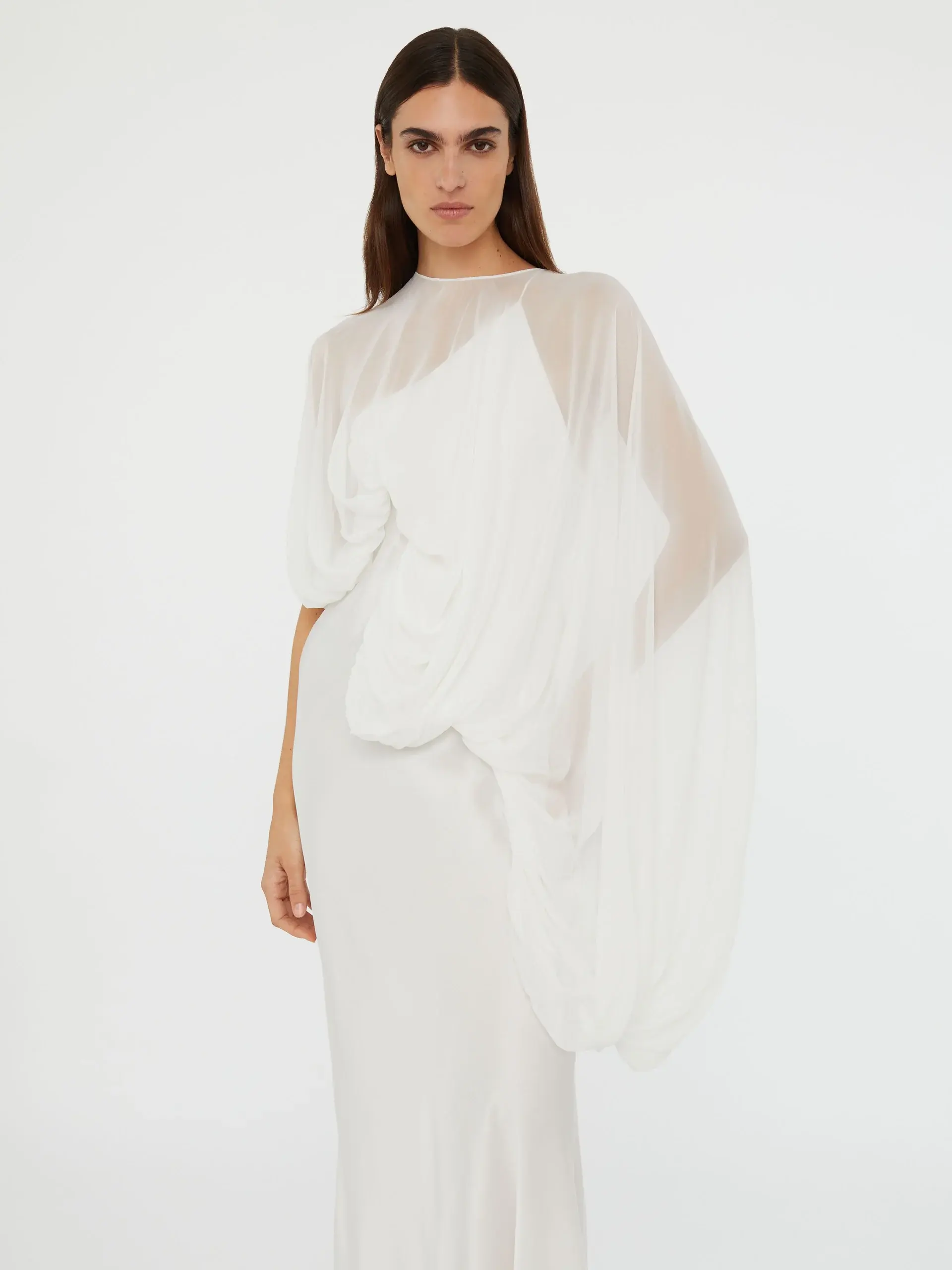 Layers of silk satin and georgette are composed and create a voluminous blouson bodice in this floor-length draped silhouette. Featuring the signature organic line, the Cumulus draped sleeve dress is carved through the waistline.