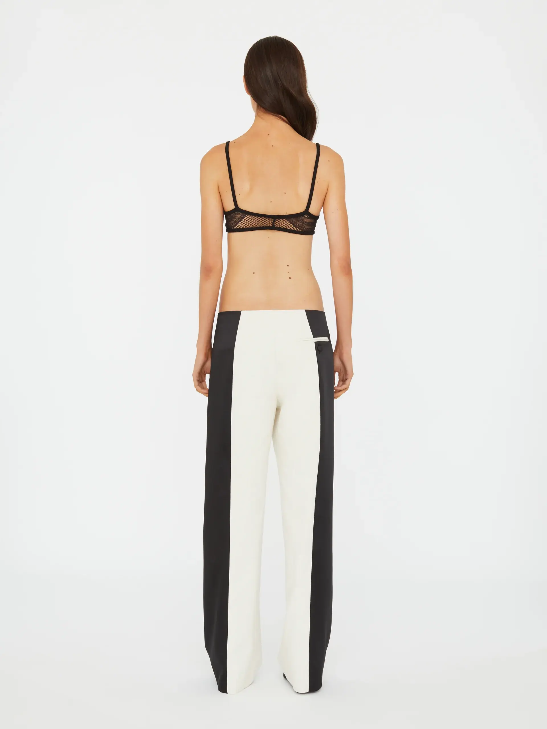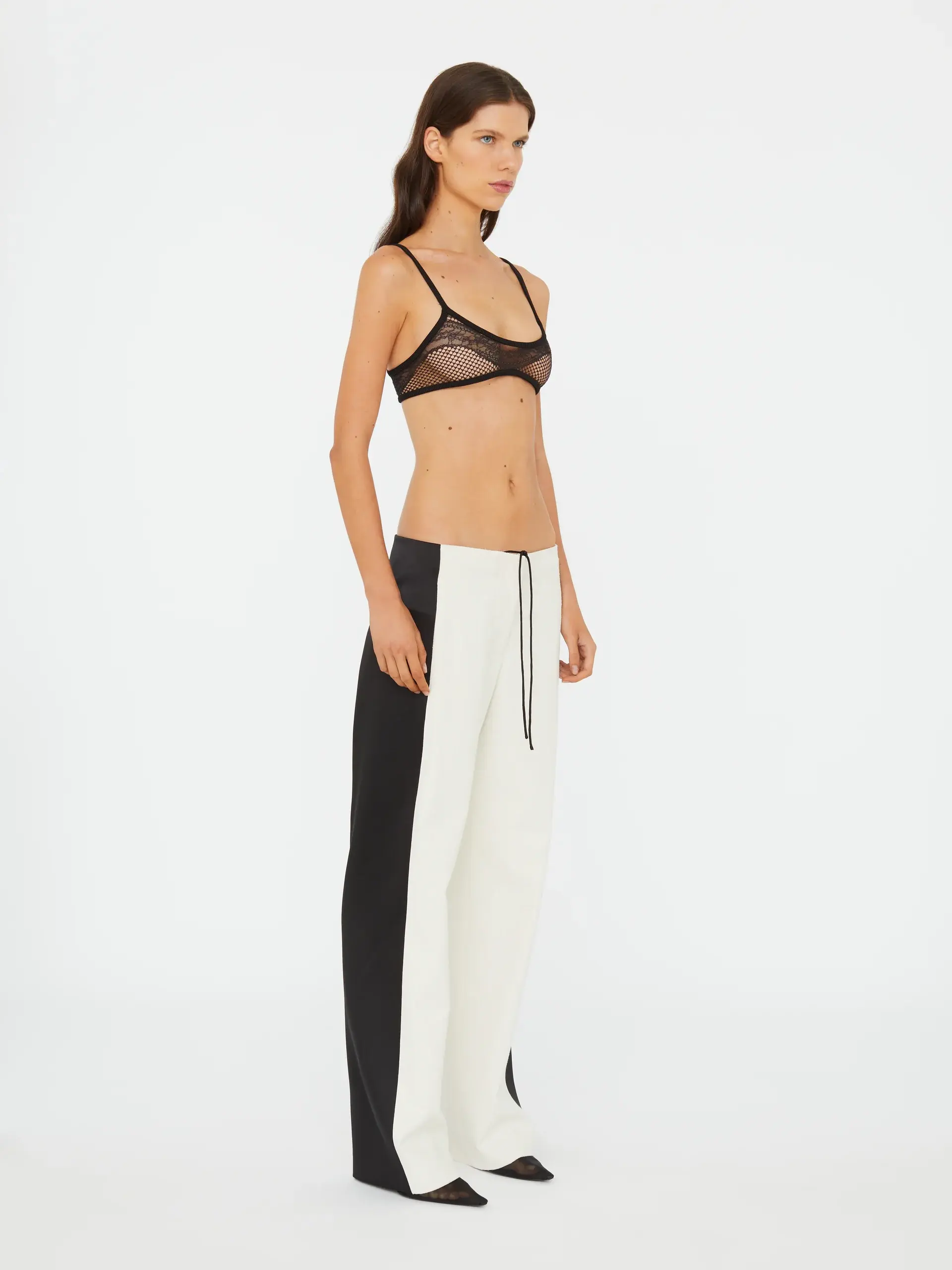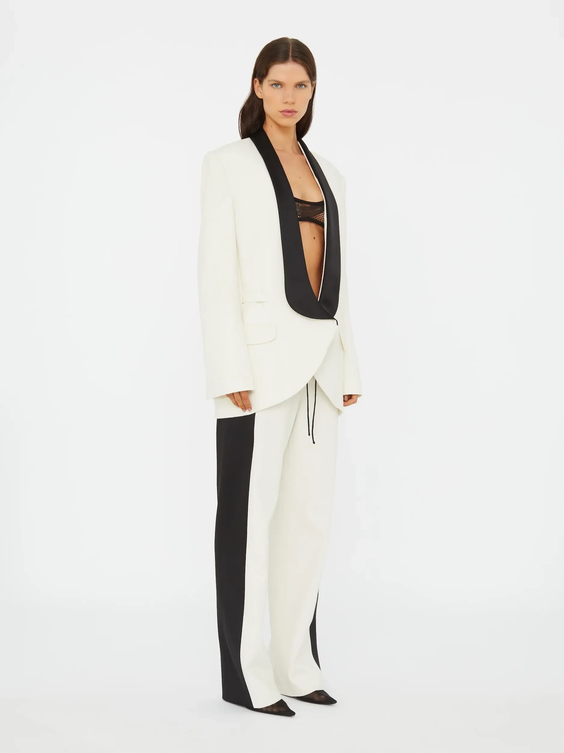 A fluid wide-leg trouser crafted in premium silk with contrast tuxedo-inspired side panels. Designed with a mid-rise fit and minimal drawcord waist, the silhouette drapes with quiet structure - referencing tailoring codes through a relaxed lens.