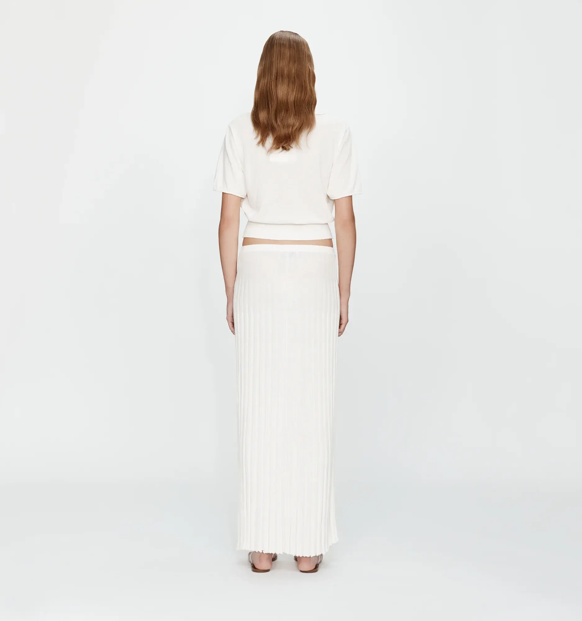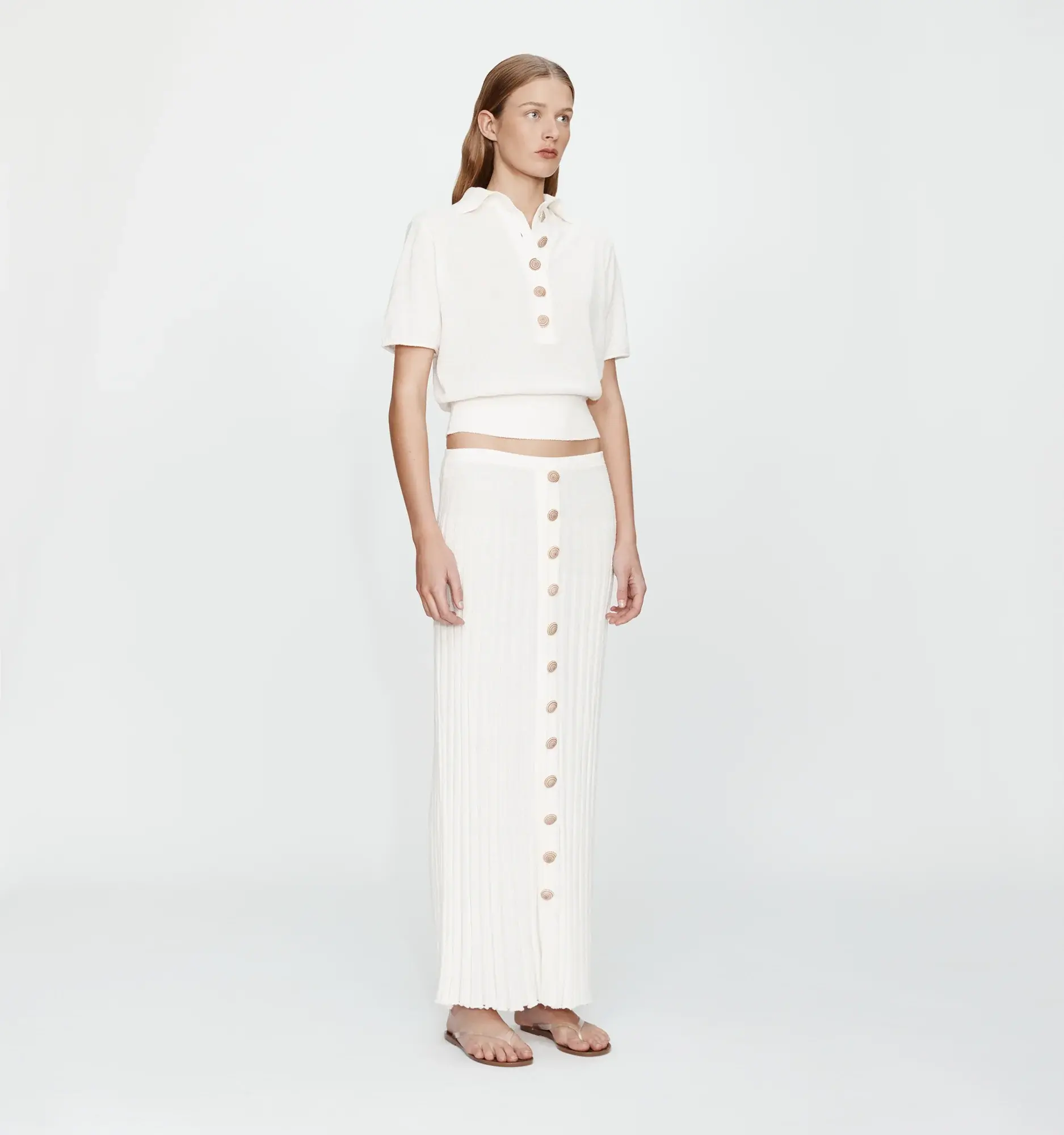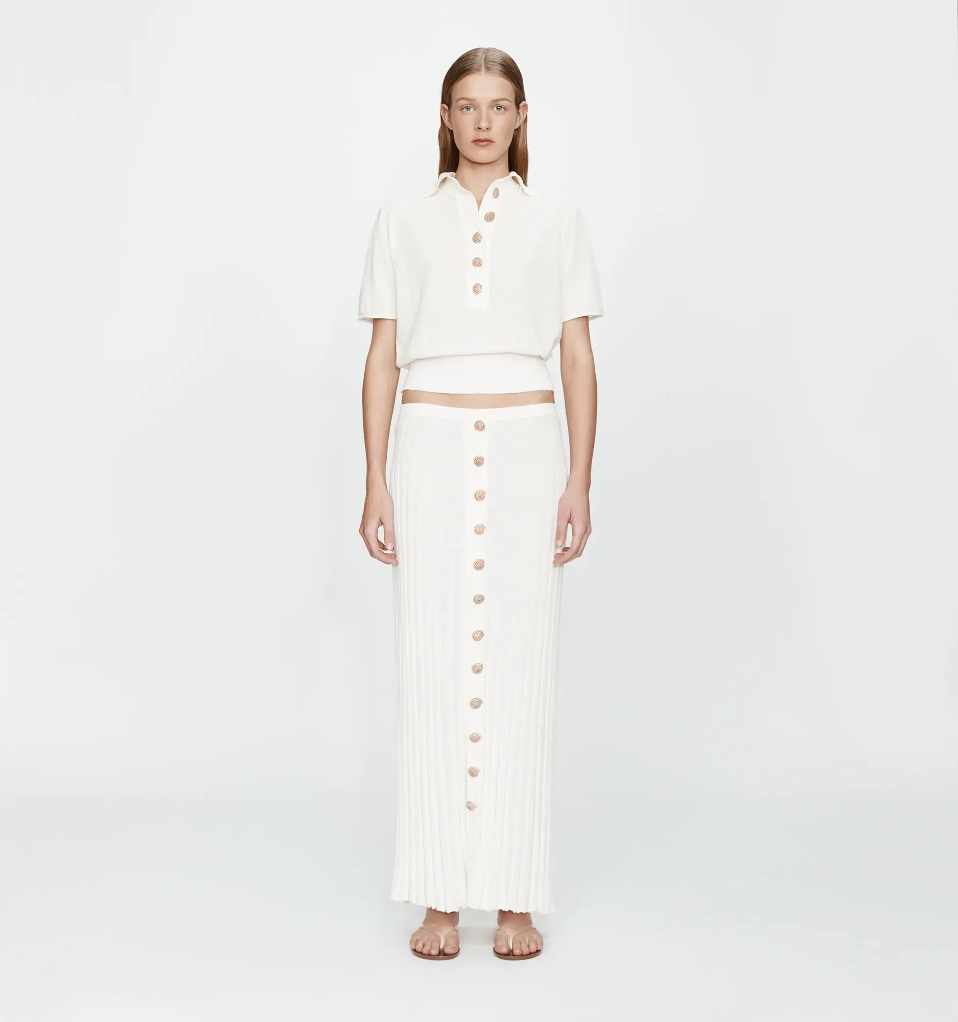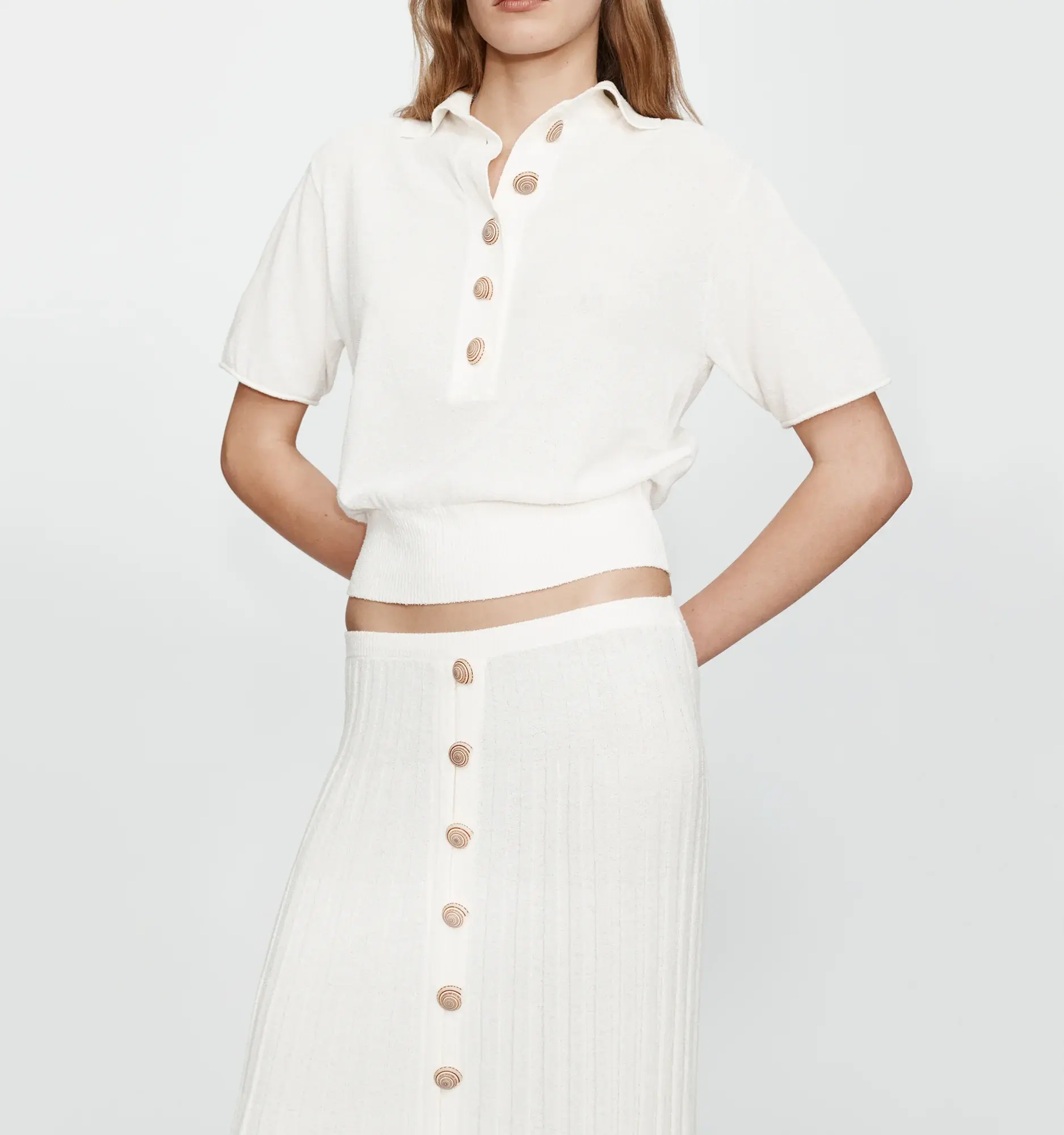 A relaxed polo silhouette crafted in a textured chalky knit, finished with contrast rib trim at the sleeves and hem. Shells delicately frame the placket as an elevated nod to coastal nostalgia. Soft structure and natural drape offer ease of wear. Designed for coordinated or off-duty styling