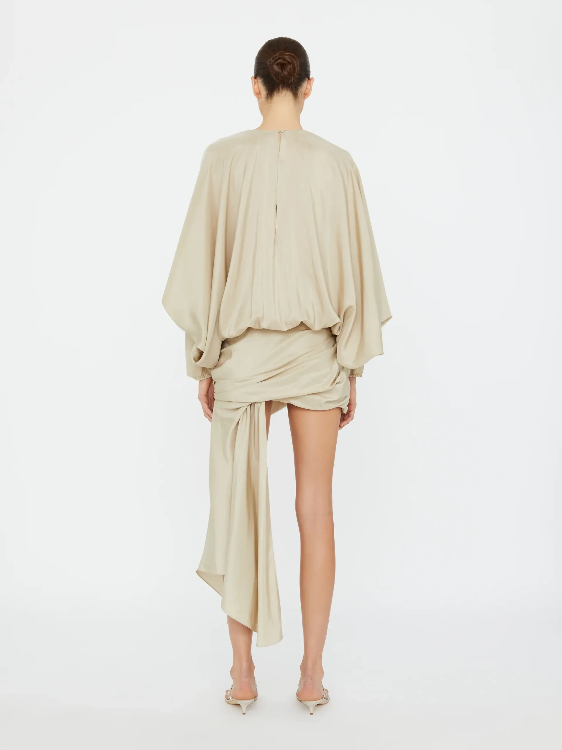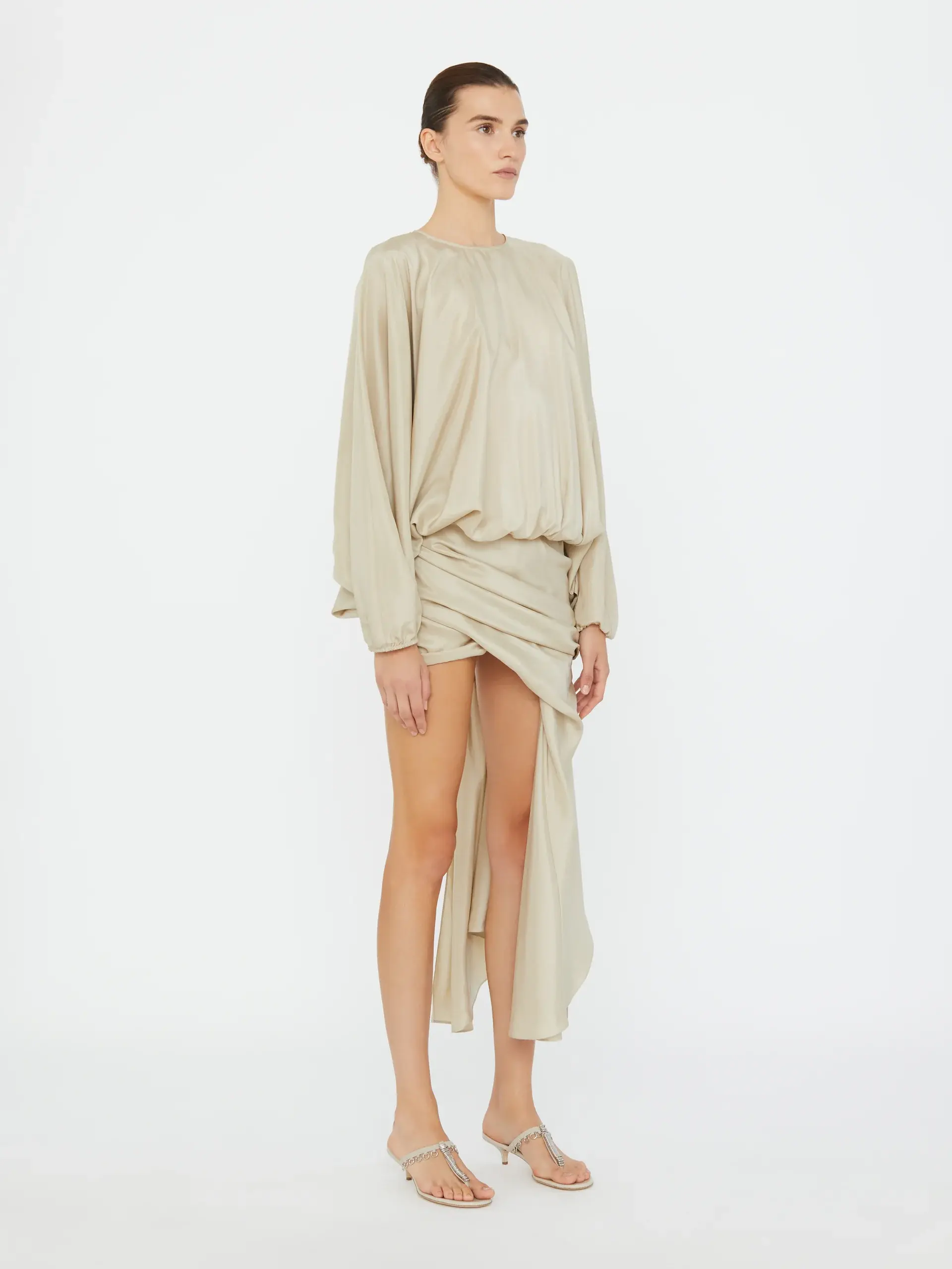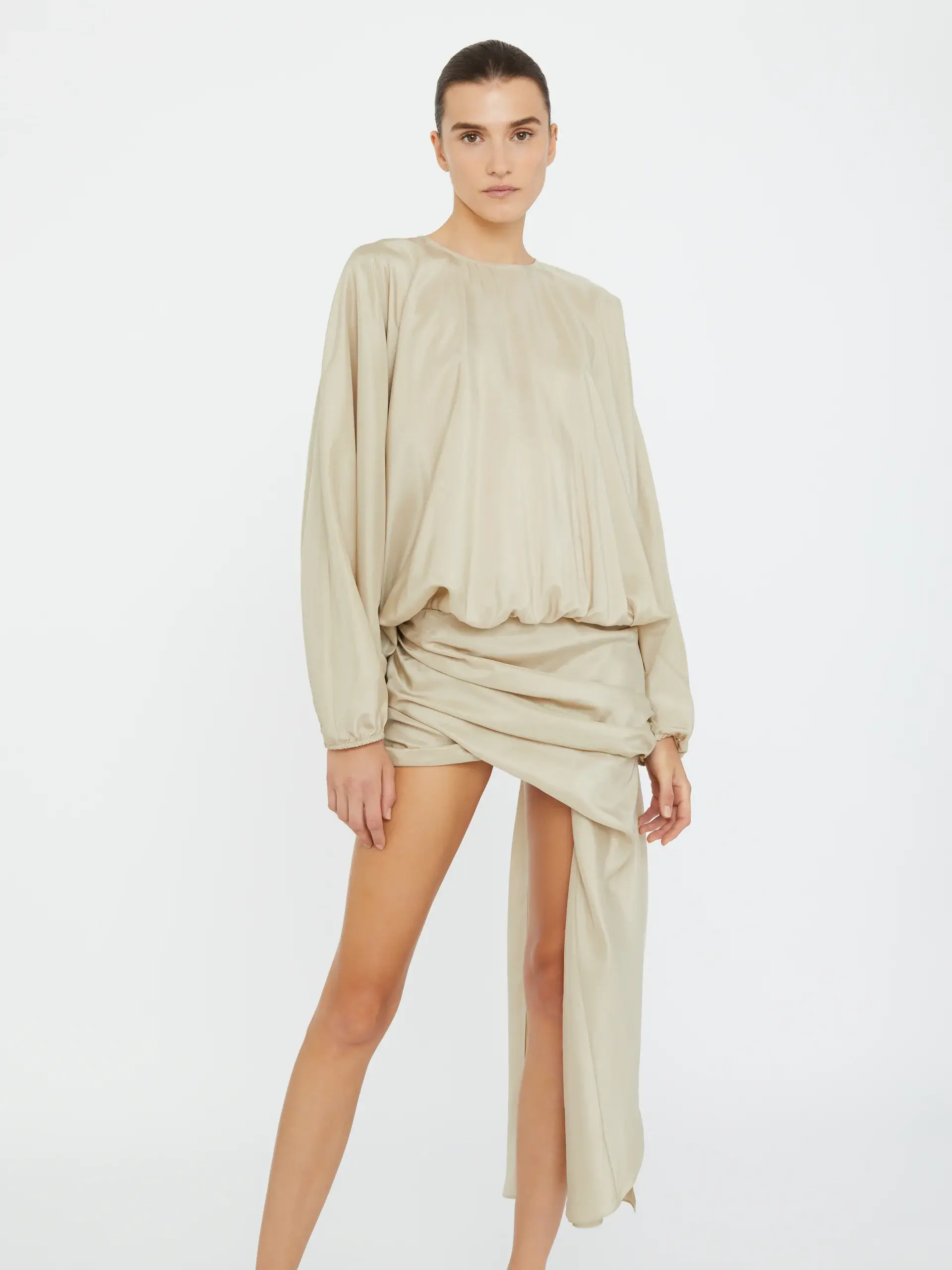 Crafted from premium silk, the Parachute Silk Drape Mini Dress features a voluminous blouson bodice with a high crew neckline and full-length sleeves. The silhouette is defined by an asymmetrically draped skirt, gathered at the hip, with a cascading silk panel. Style with sculptural heels or Pierced Flip Flops for elevated resort dressing.