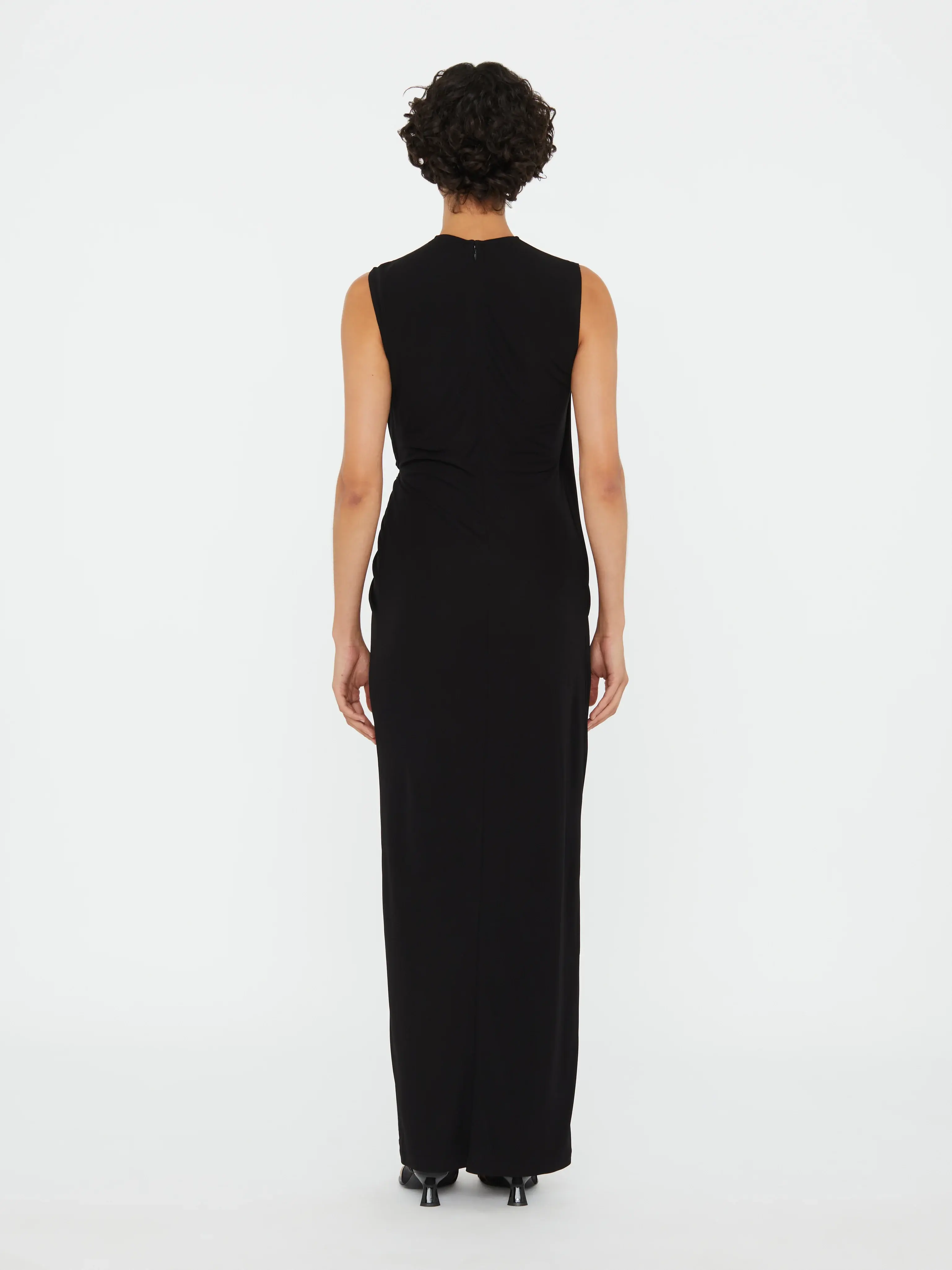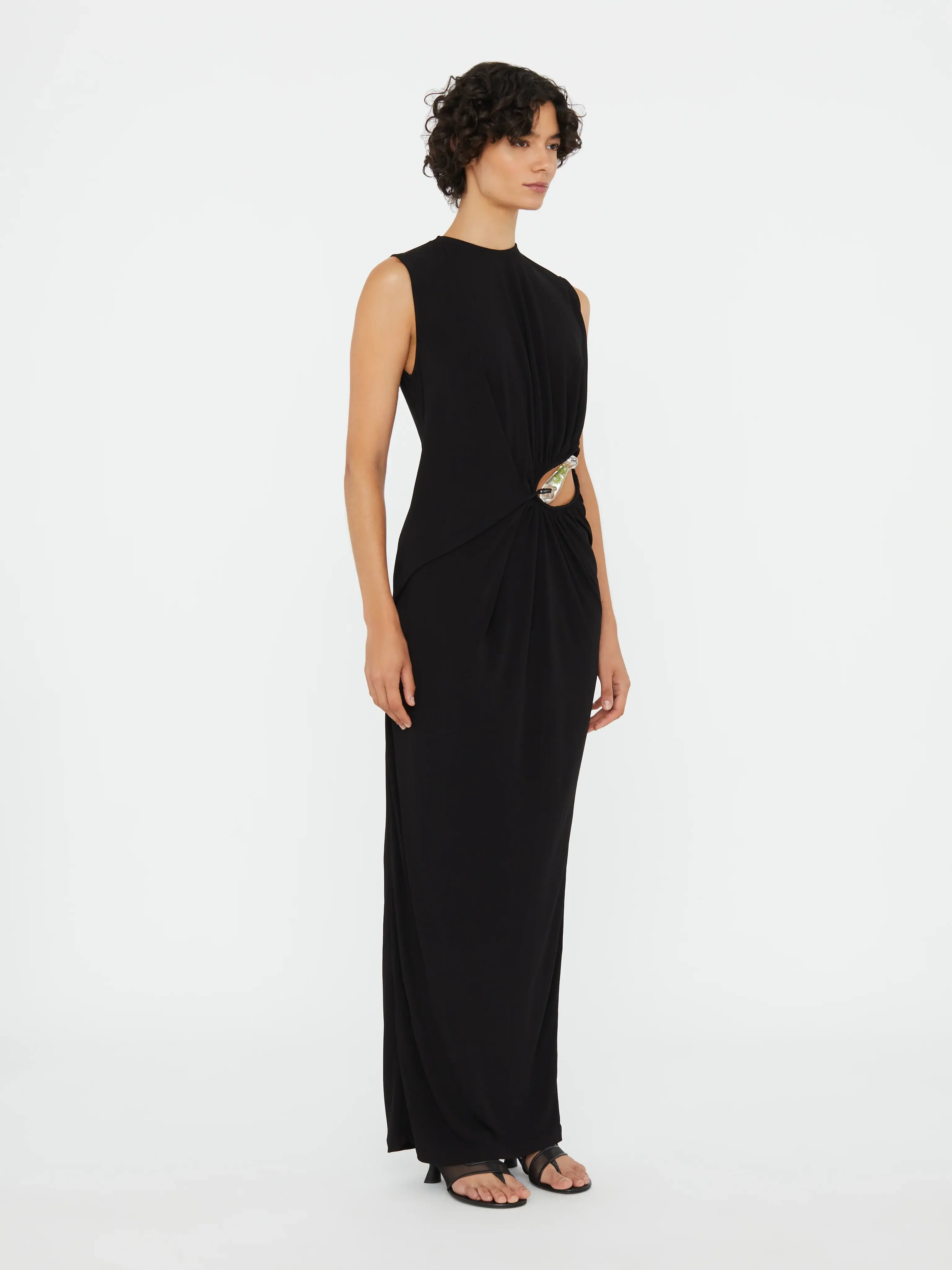 Crafted in slinky viscose jersey, this Encased Nature Suspended Jersey Tank Dress features sculptural draping through the body with a gathered cutout at the waist. A signature Christopher Esber cut out is framed by clear resin hardware, encasing preserved maidenhair fern. The silhouette falls straight with a relaxed waist and subtle contouring through the skirt.