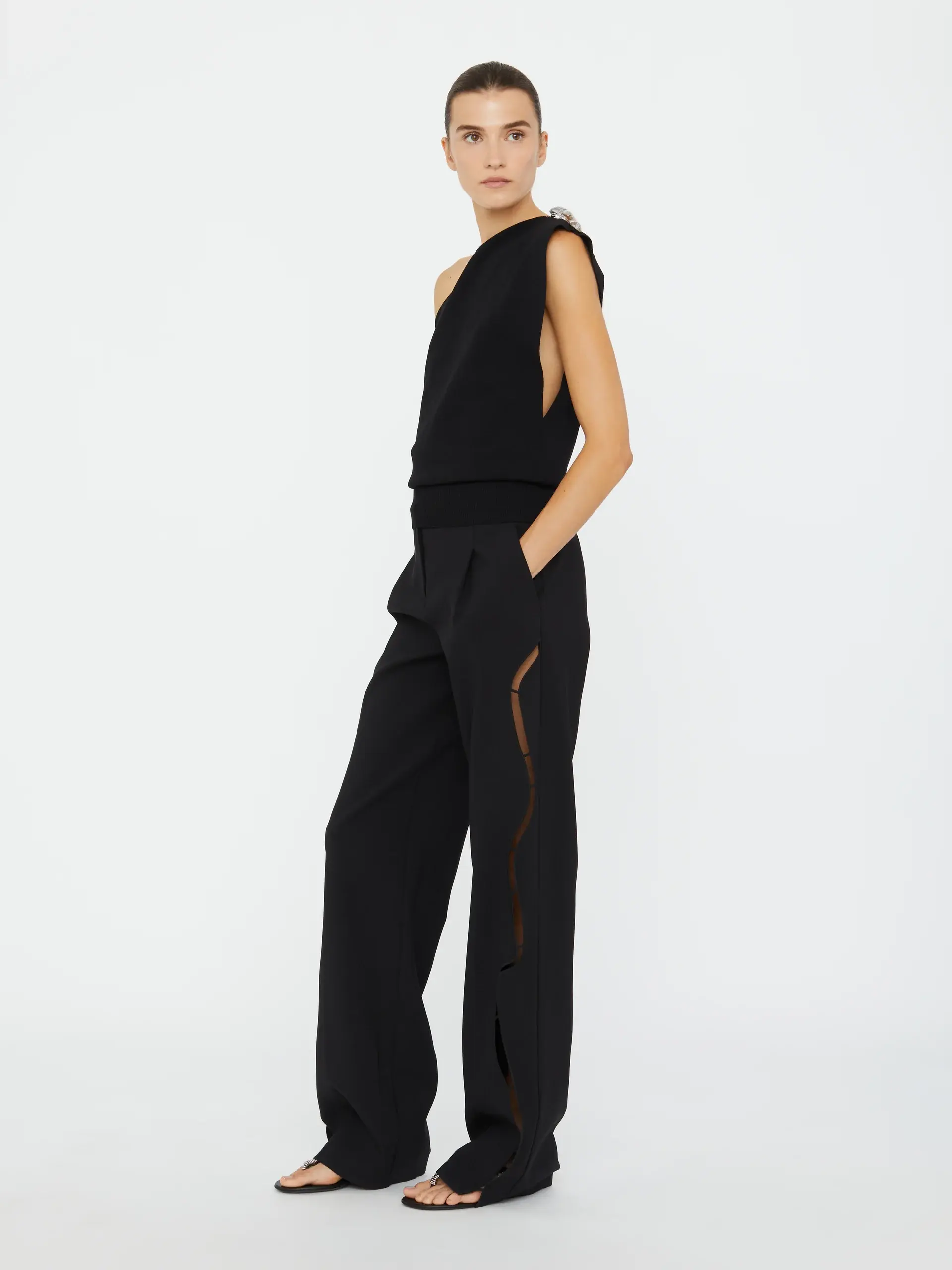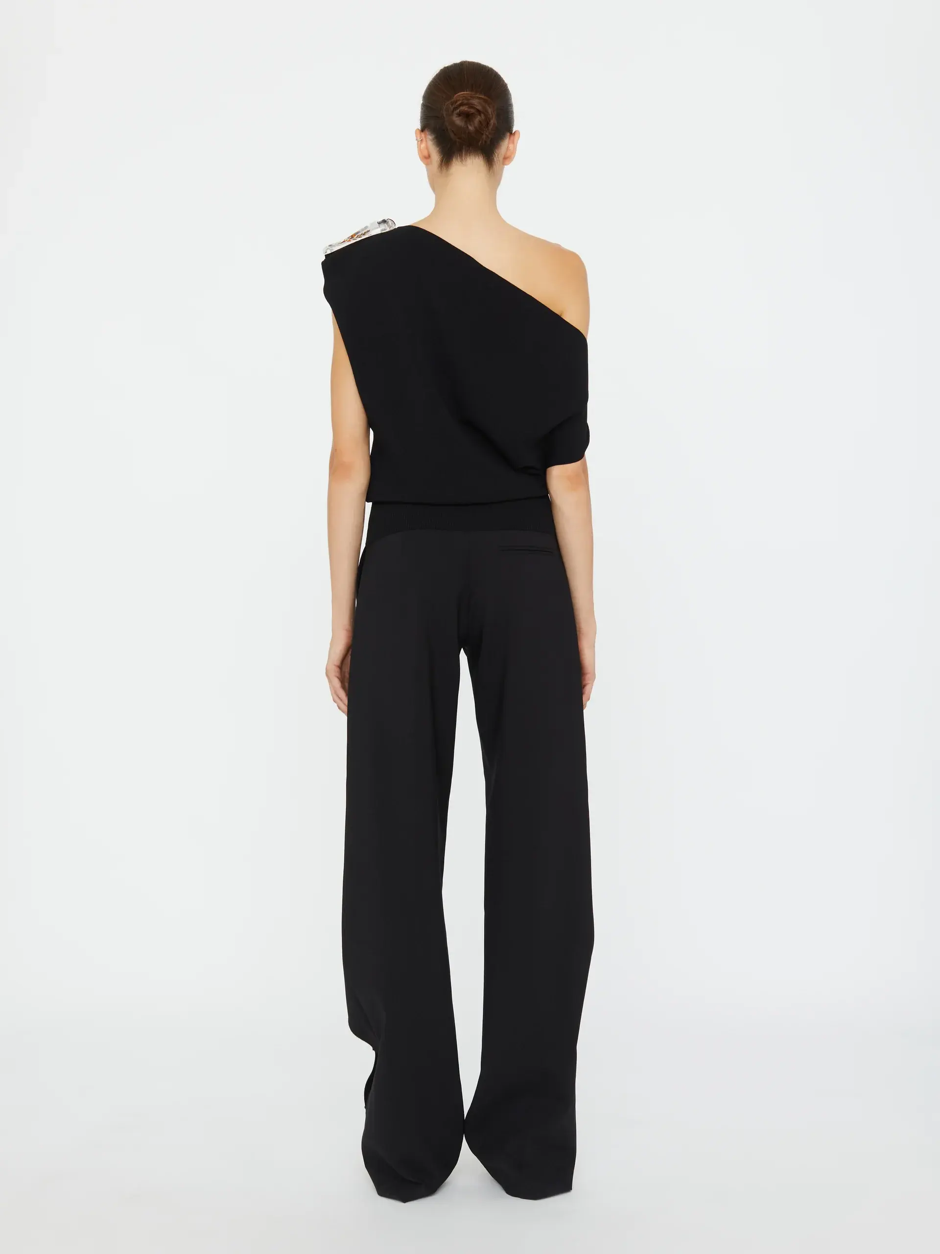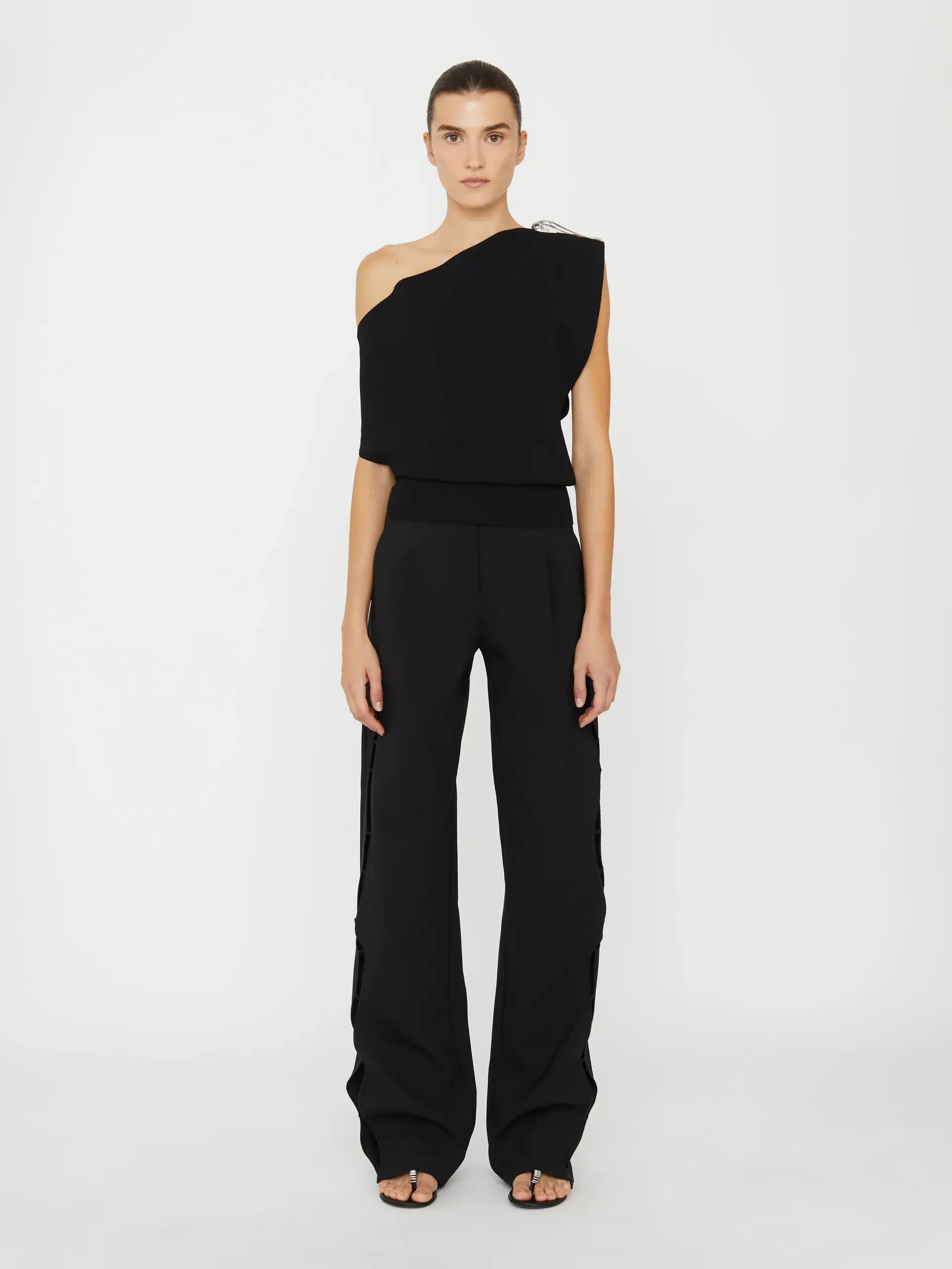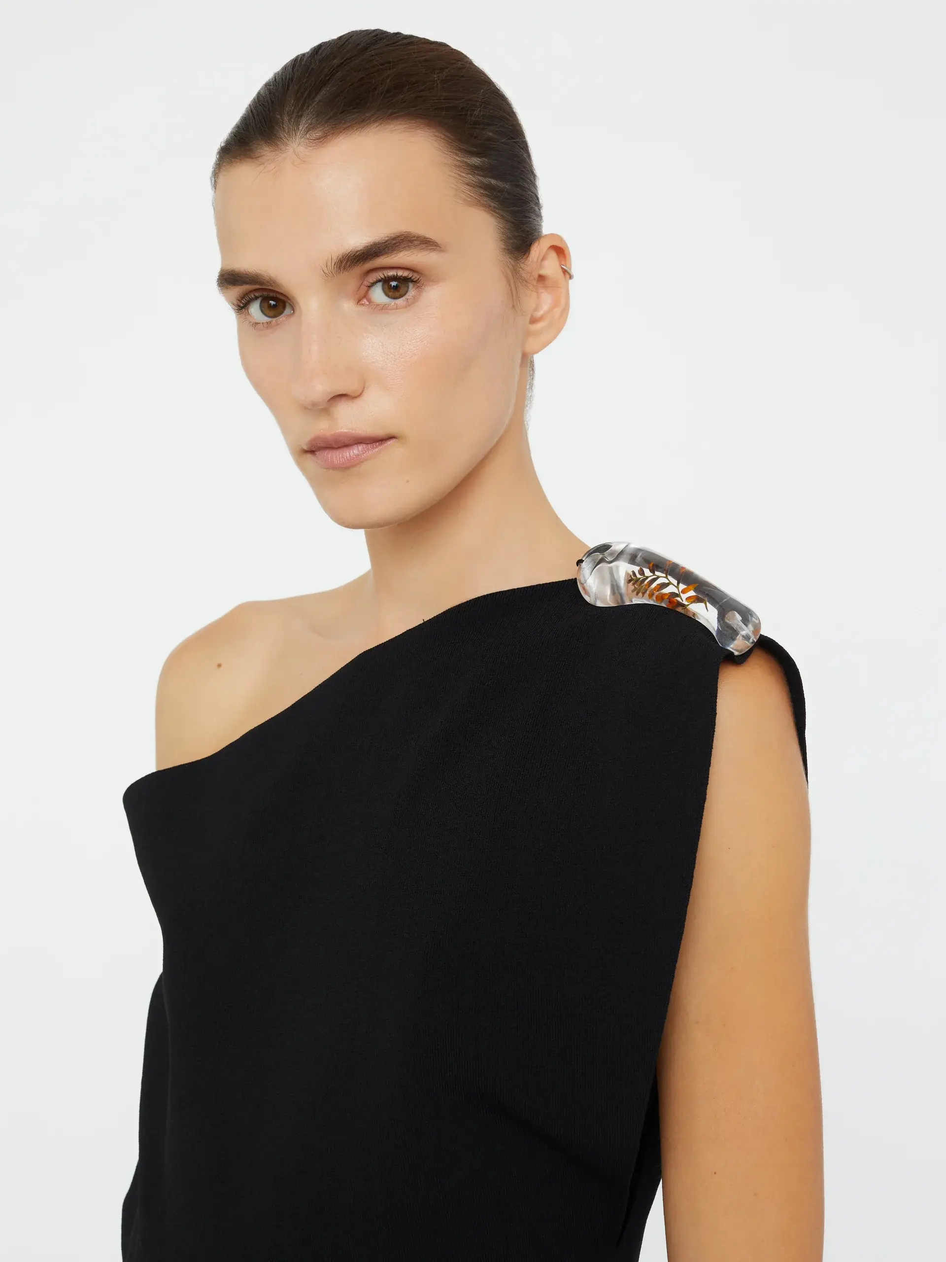 A sculpted one-shoulder knit top featuring a signature Christopher Esber cut-out, anchored by custom resin hardware encasing a preserved flaming orchid. Crafted in ribbed viscose-blend knit, the silhouette is fitted through the waist and structured across the neckline - balancing botanical fragility with precise construction.