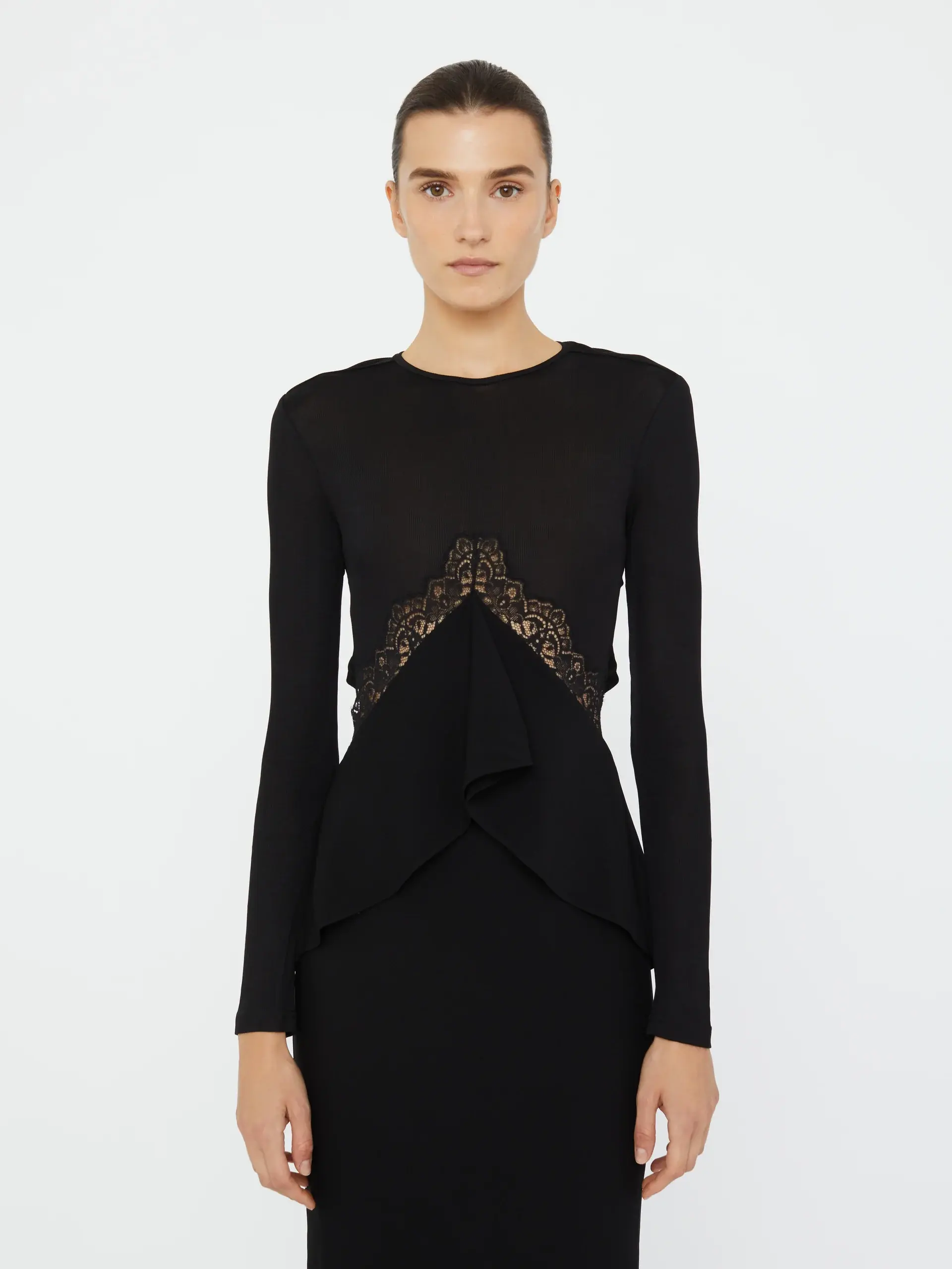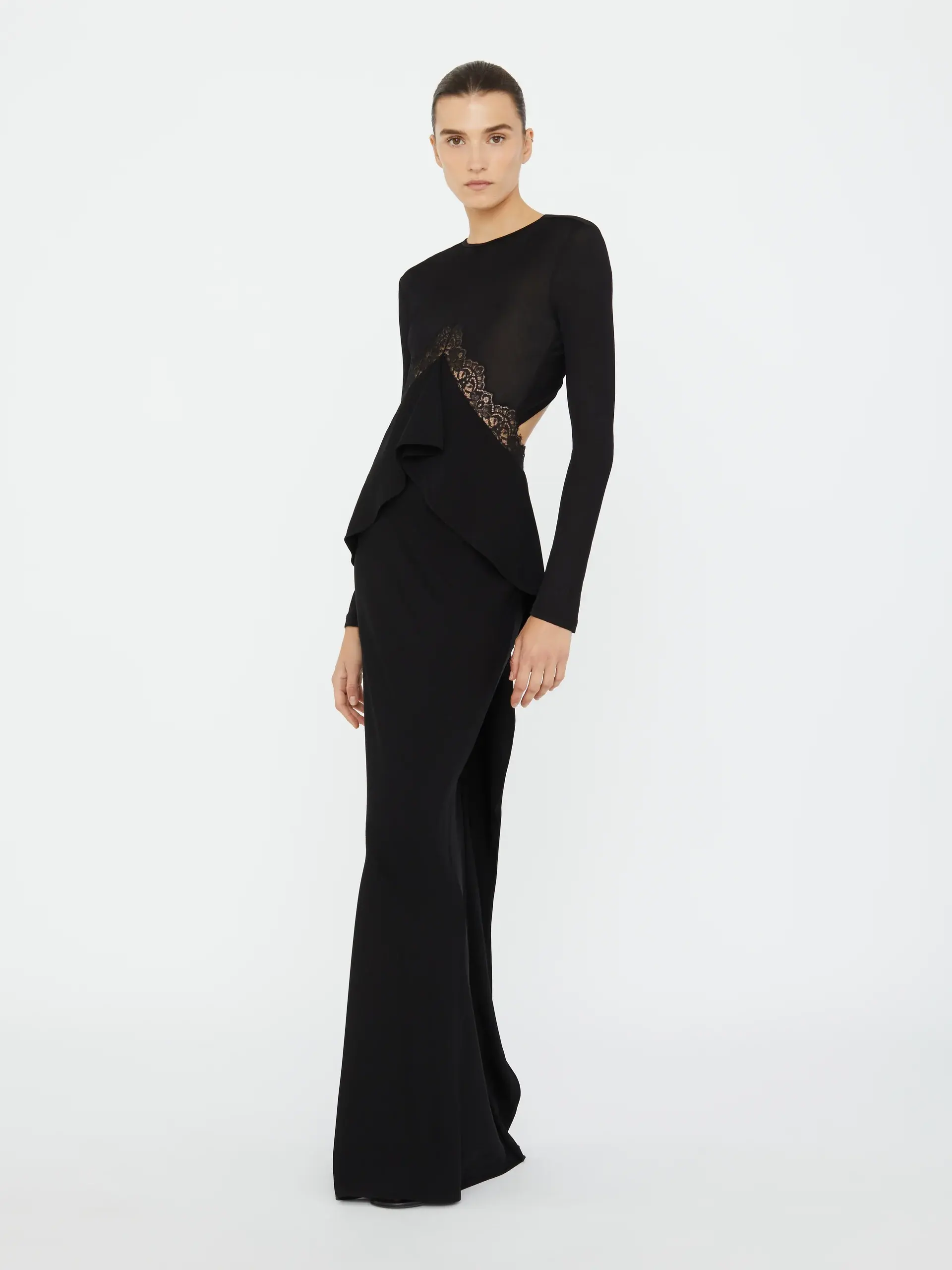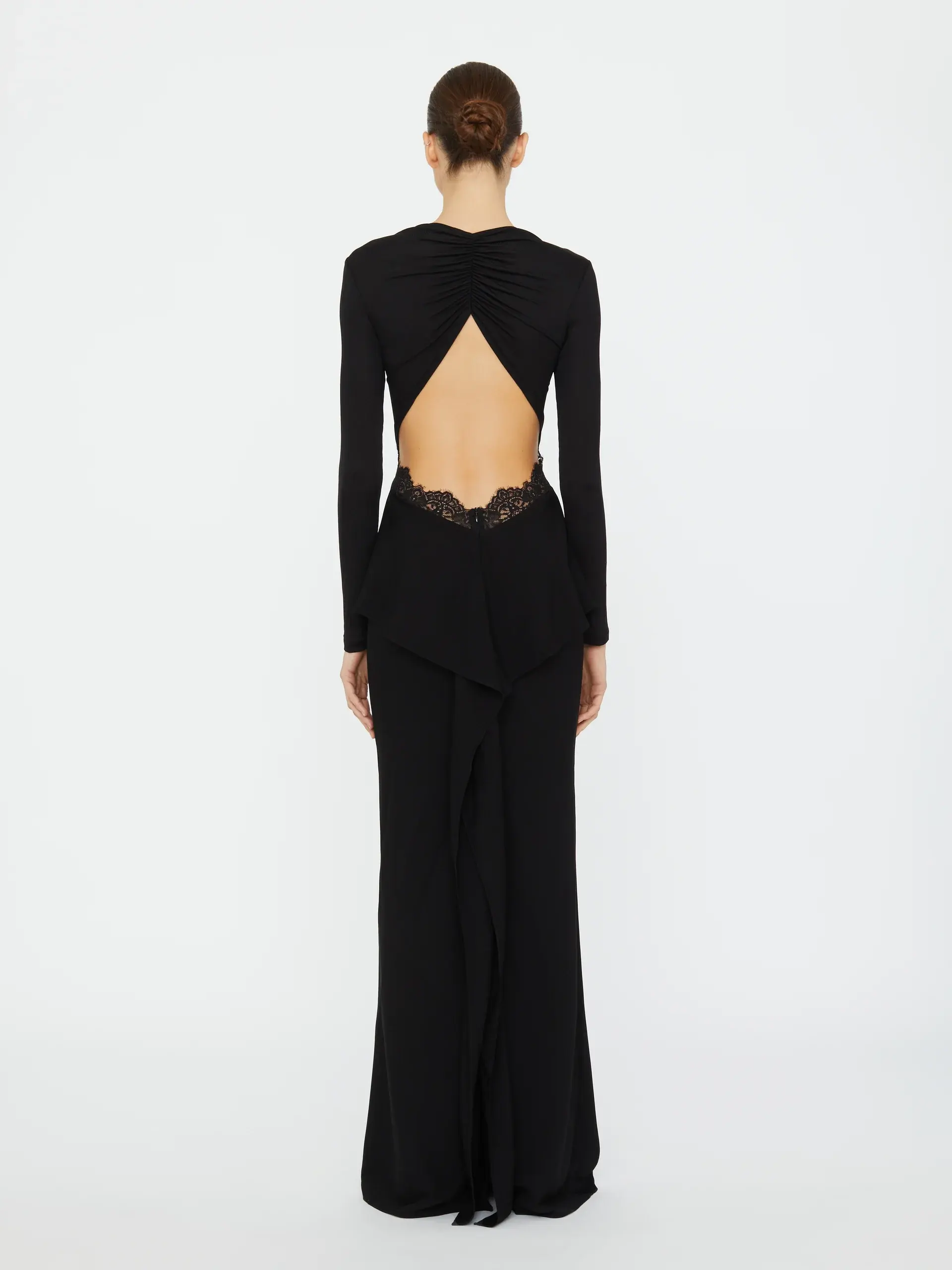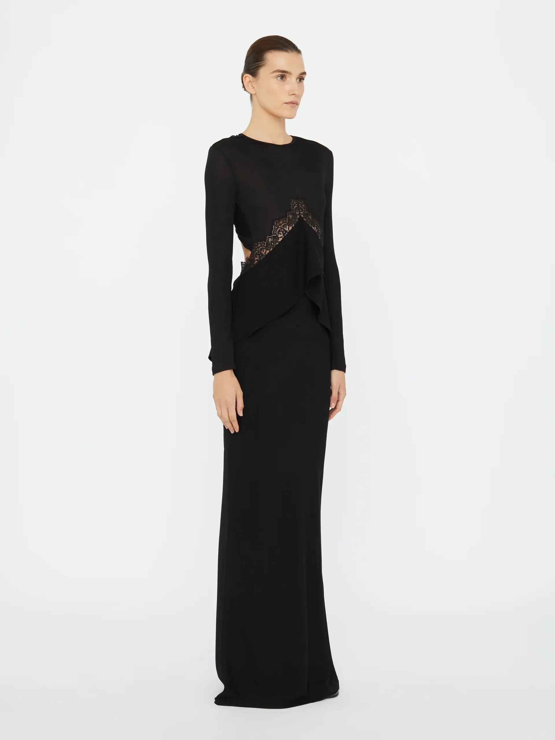 Pragmatic & feminine details combine to form this lace disconnect back column dress. Fine rib stretches with ease to the body, whilst sheer lace traces the torso. Tonal lace insert panels frame the bodice and trace a sculpted open back.