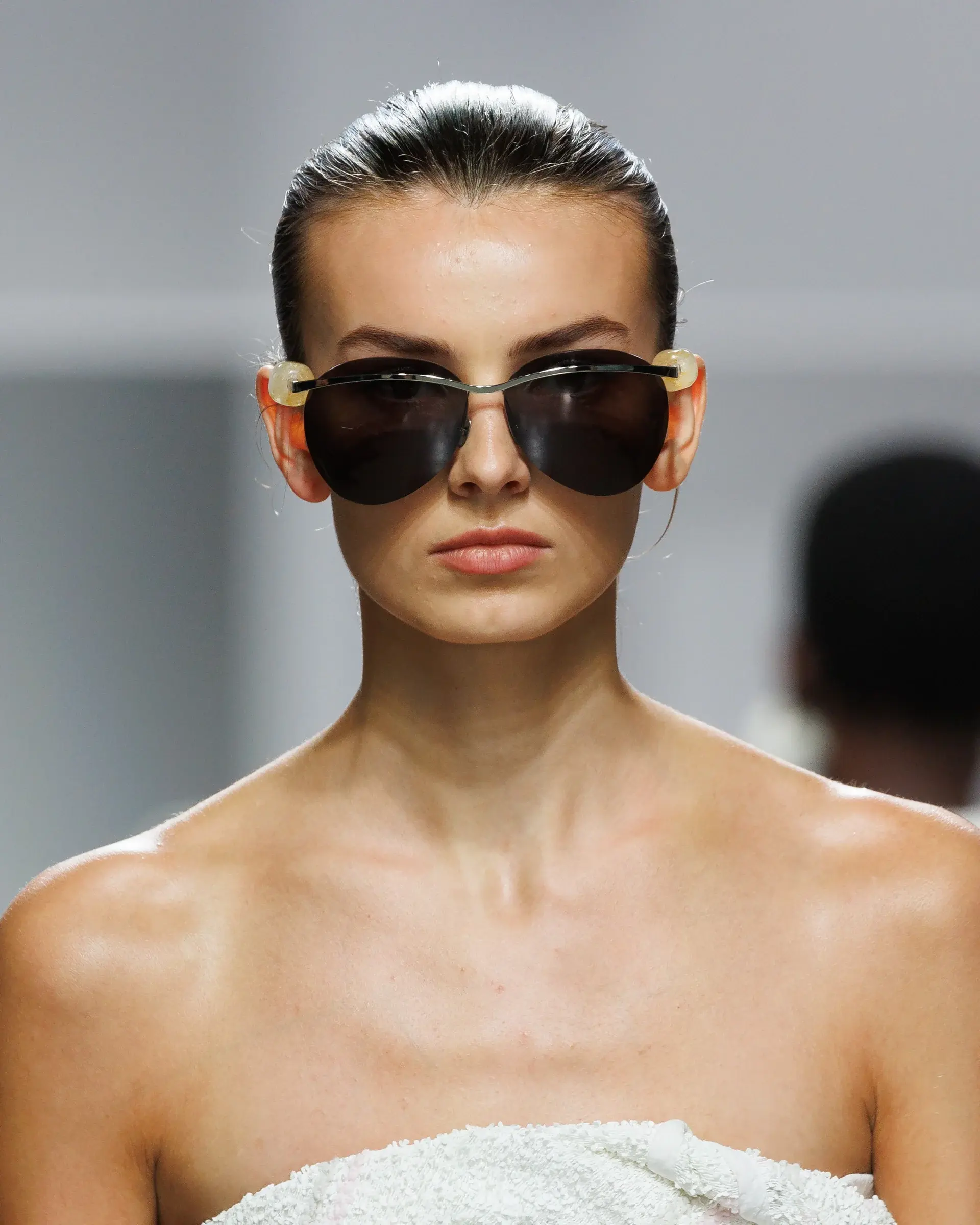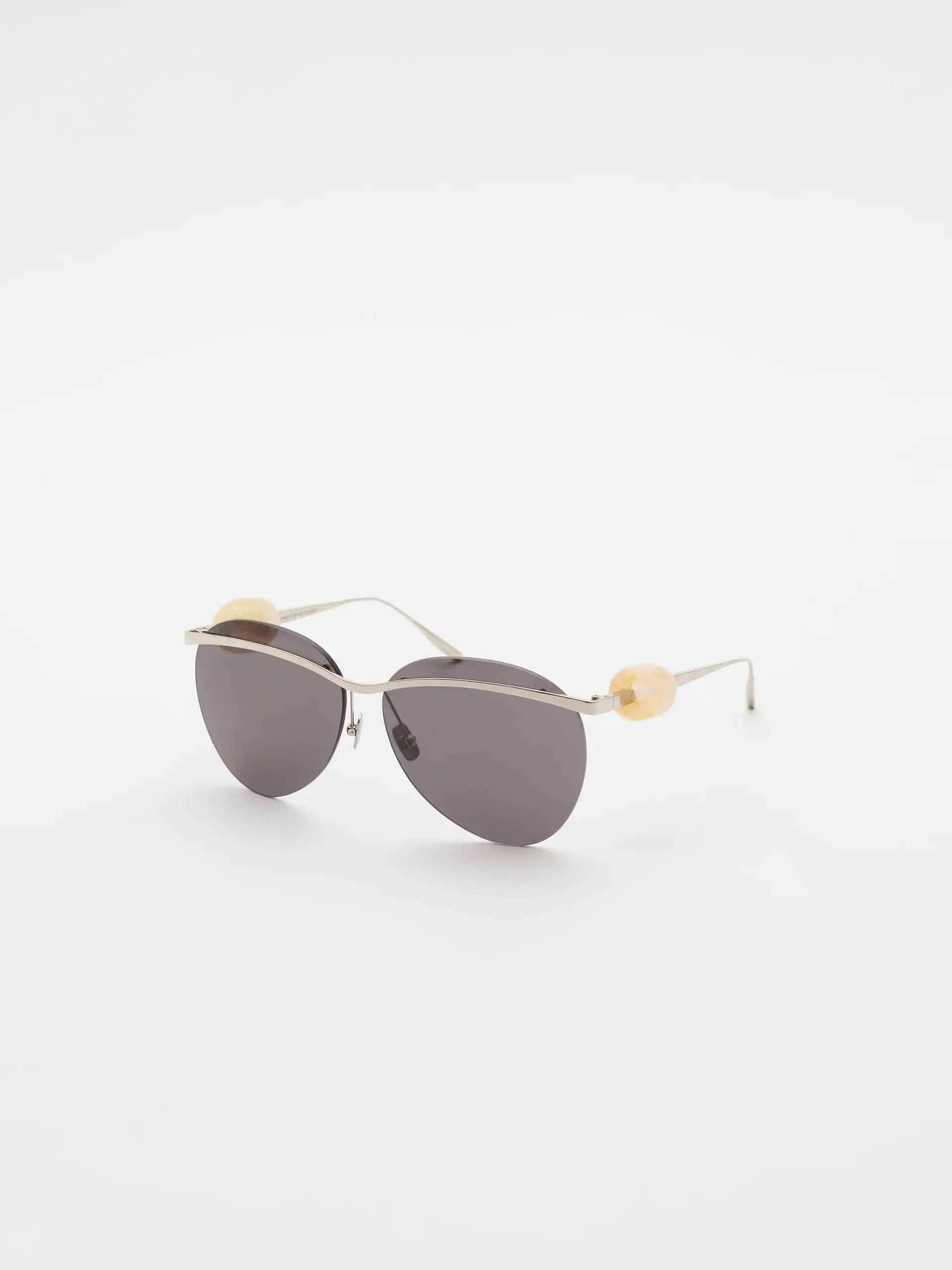 A sculptural take on the classic aviator, oversized lenses are suspended from a sleek metal brow bar and fine rim structure. The temples are finished with signature Christopher Esber stone hardware.