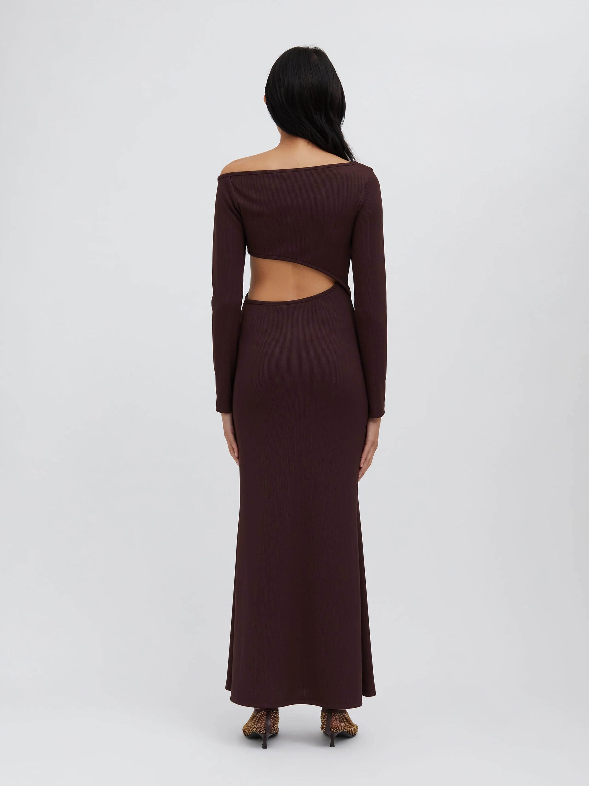 The Spiral Crystal Dress in Mahogany by Christopher Esber is adorned with bespoke natural stone hardware that enhances energy and optimism. This long sleeve ruched ribbed maxi dress reveals a sculptural spiral cut out & an exposed neckline.