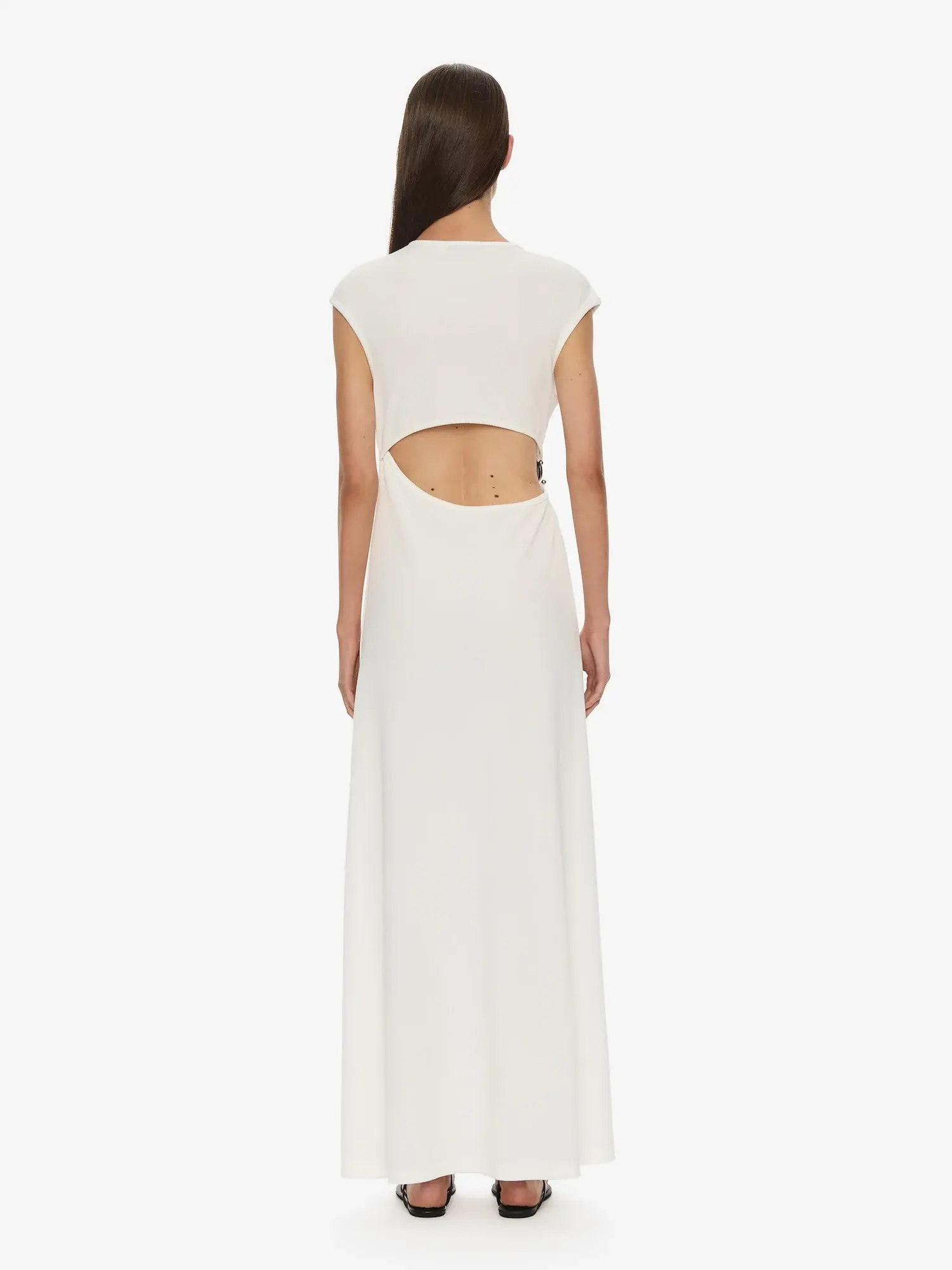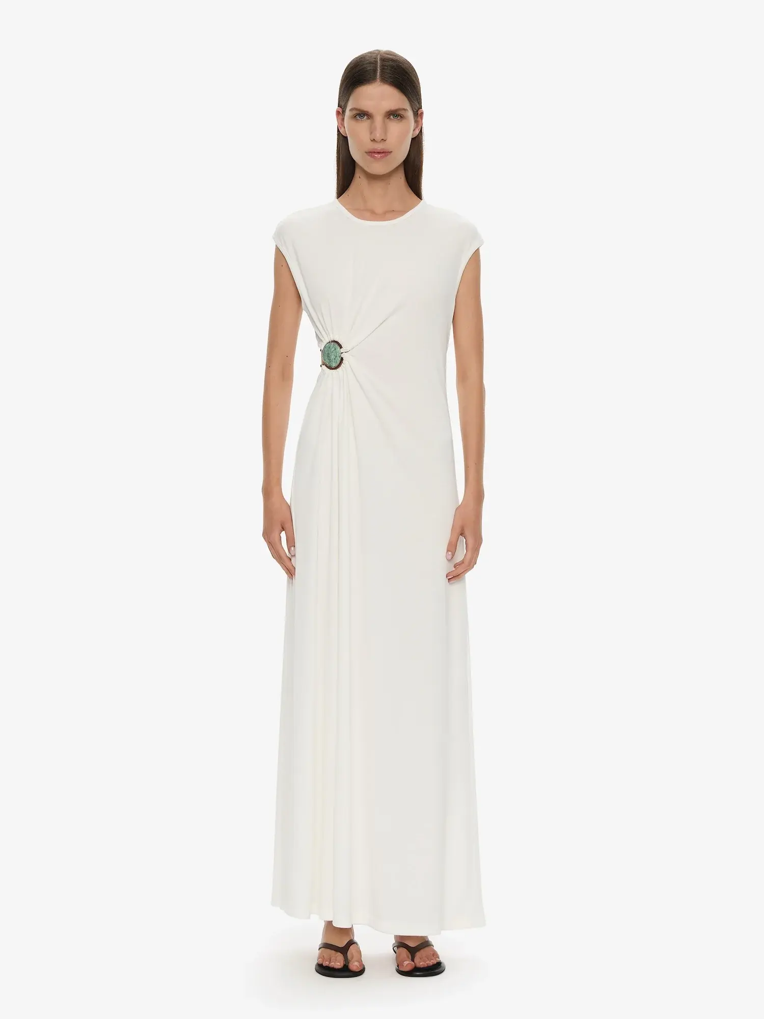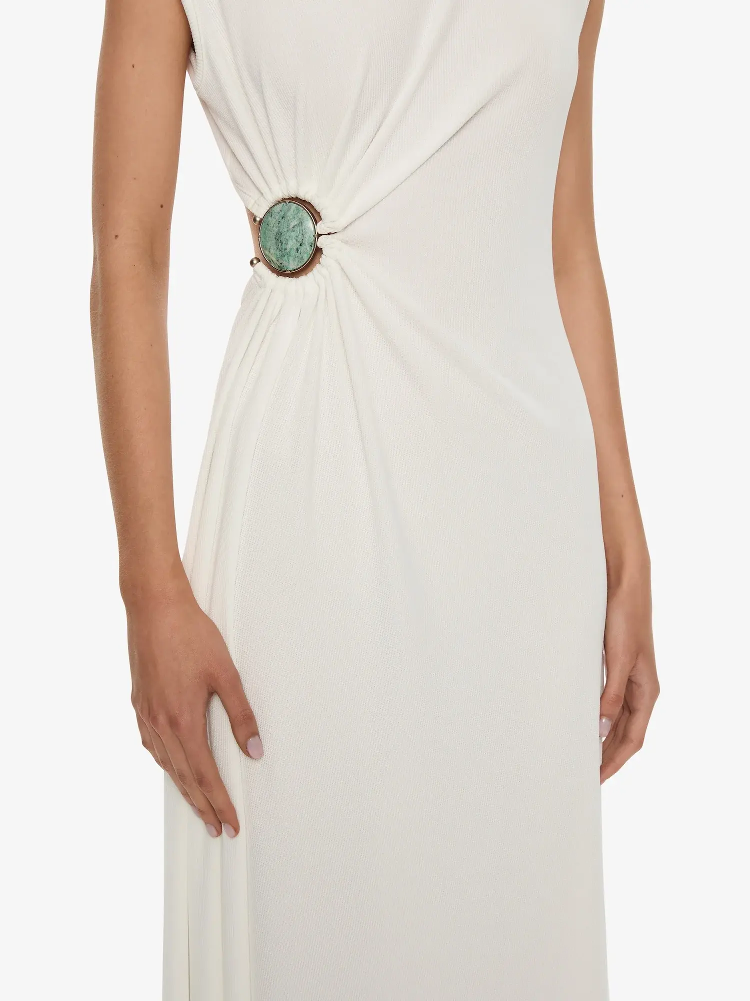A sleeveless column dress in ribbed jersey, defined by ruched gathers that pull into a signature Christopher Esber mineral stone at the waist. Cut with a high crew neckline, the silhouette drapes with precision while the stone detail anchors softness with sculptural weight.