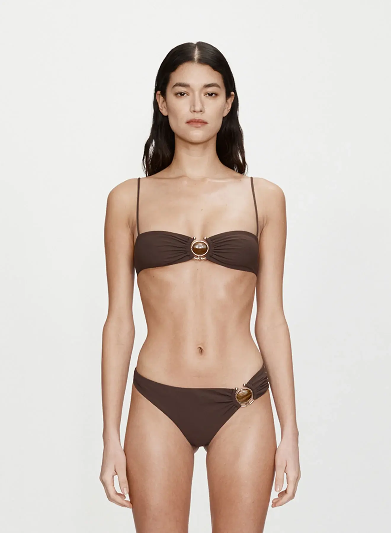 The Mineral Stone Ruched Bikini Top is cut in matte stretch lycra and adorned with sculptural brass hardware set with natural mineral stone. Designed with fine adjustable straps and gathered cups that create soft texture against the body.