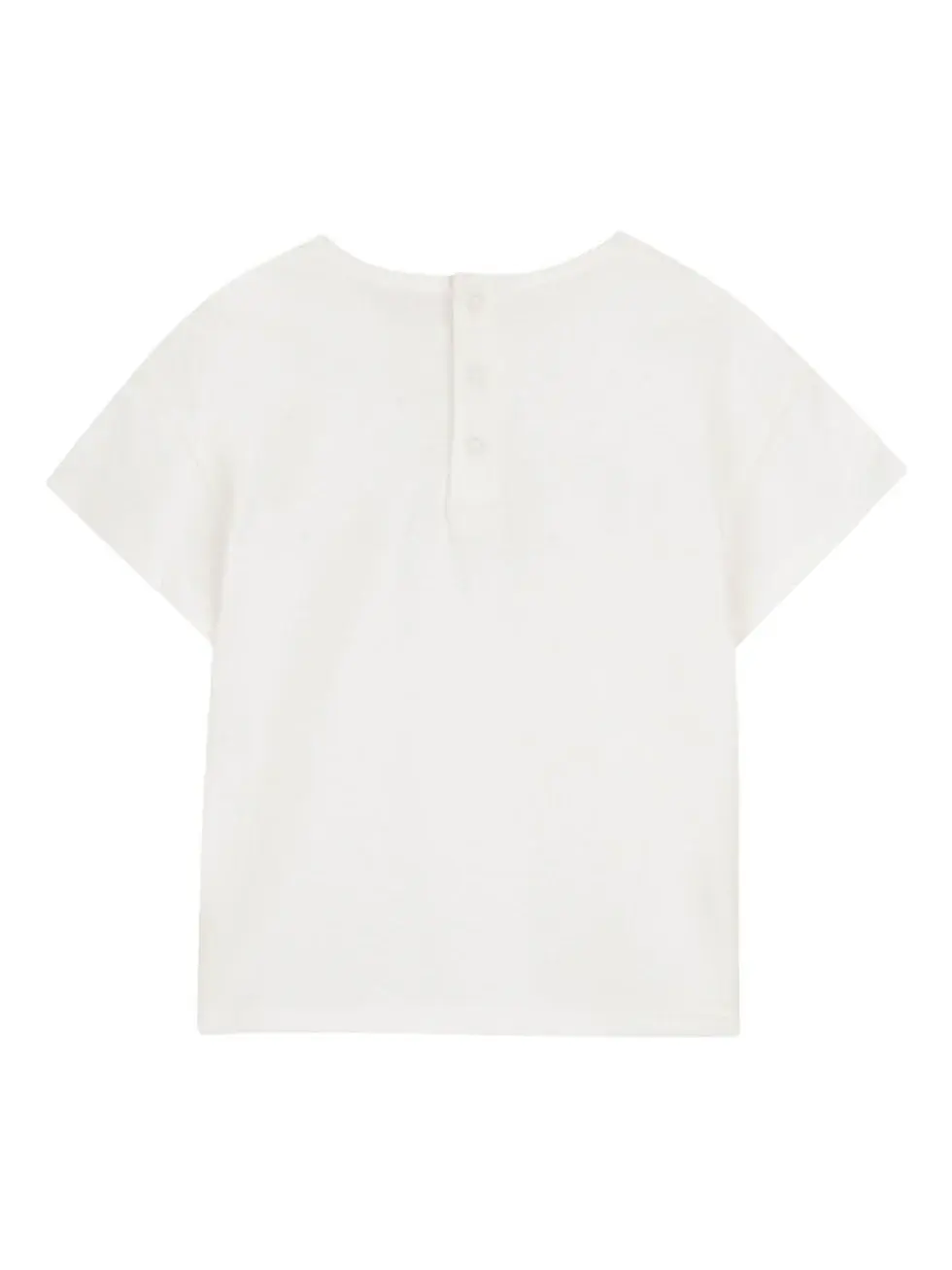 The Chloé Kids white T-shirt for baby girls with logo Made of 100% cotton, it features a white color, short sleeves, a crew neck, snap button closure, and a straight hem.