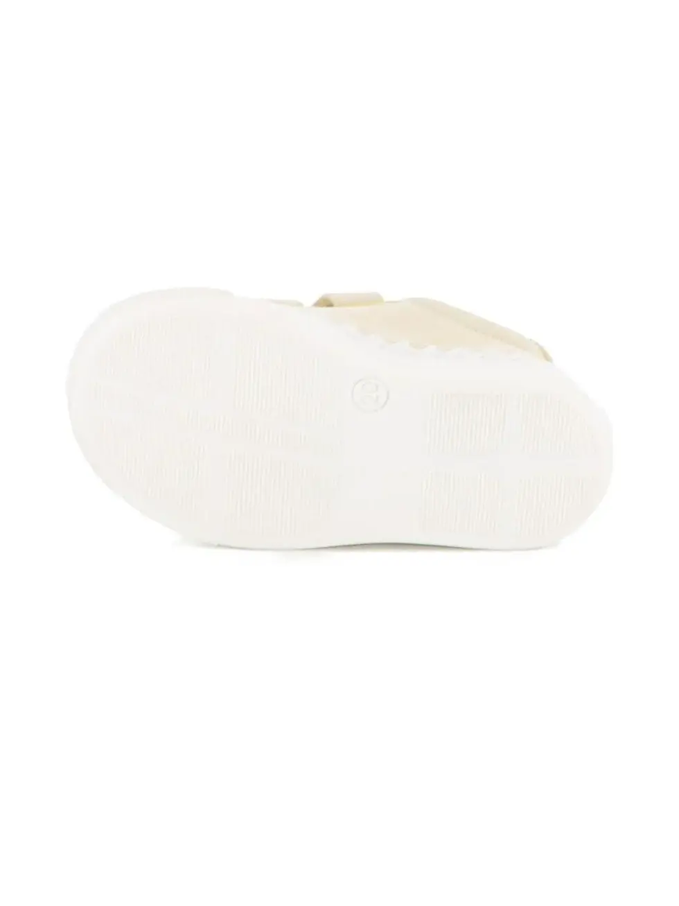 The Chloé Kids beige baby girl sneakers with embroidered logo. Made of 100% synthetic leather, they feature a beige color, scalloped edges, a rubber sole, a round toe, embroidered logo, and a velcro closure.
