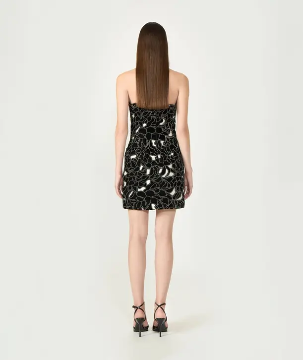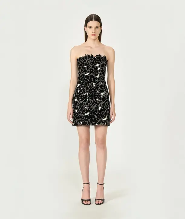 Costarellos "Nellia" strapless mini dress crafted from luxurious silk velvet lace with intricate floral cut-outs that reveal subtle glimpses of skin elevated with sparkling crystal trim, adding a touch of refined radiance. This dress balances sensuality and sophistication making it perfect for cocktail parties, evening events, or any occasion that calls for effortless elegance. Color: Black 25% silk, 75% rayon French sizing Zip fastening at the back Dry clean