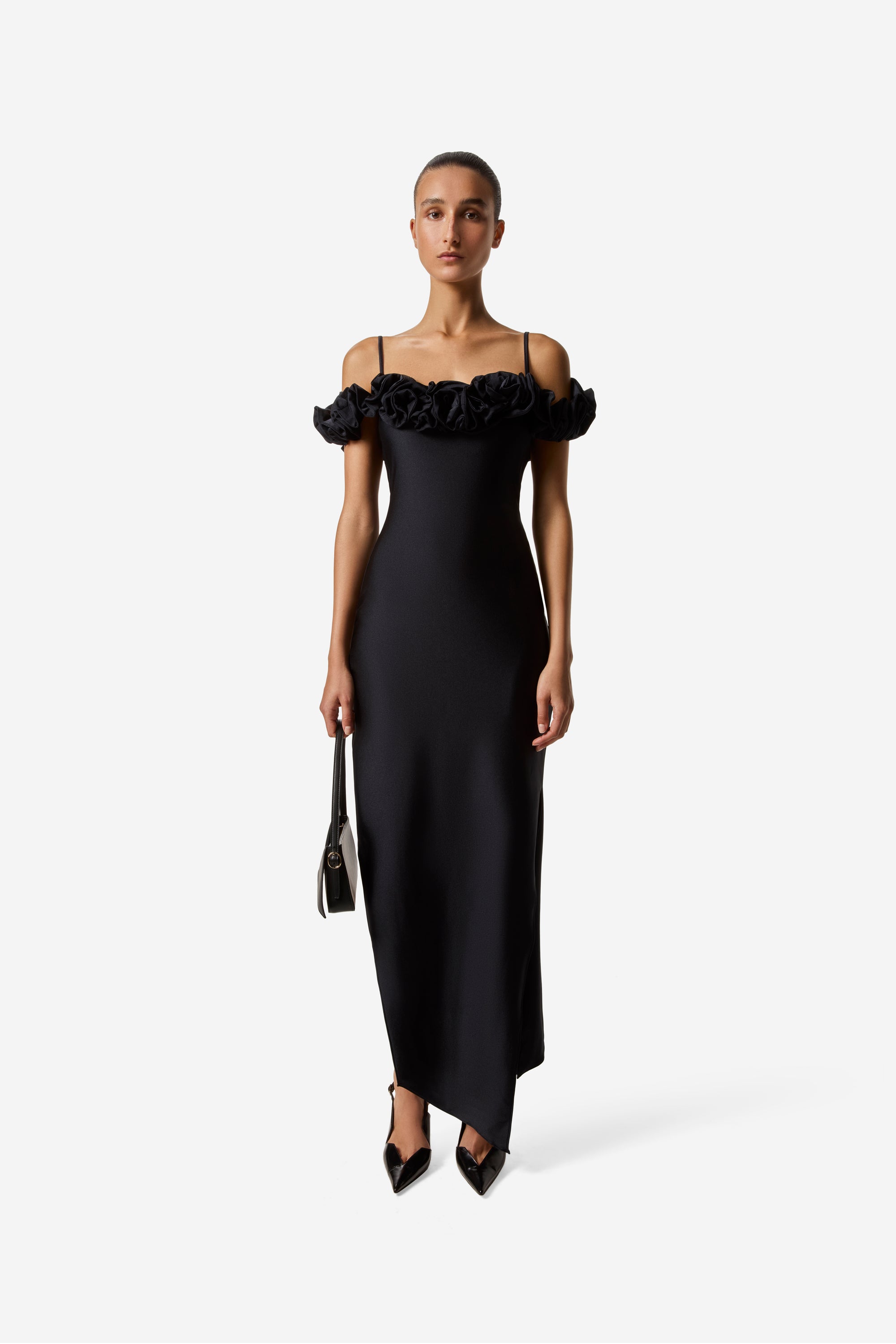 Held by delicate spaghetti straps, this stretch gown is crafted from shimmering black stretch jersey and has a supportive figure-hugging cut with a deep slit to one side. The neckline is decorated with a garland of flowers-like fabric twists which extend into loose loops around the arms, completing this contemporary take on a classic Grecian look.