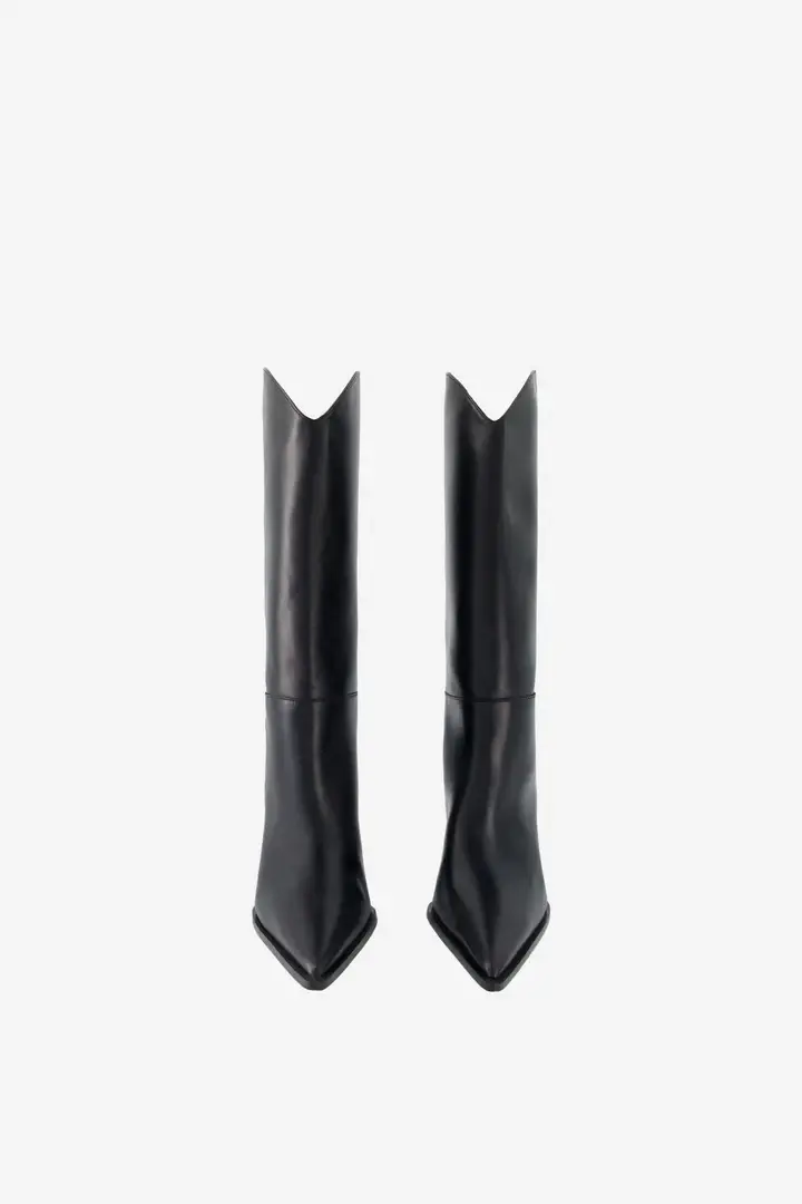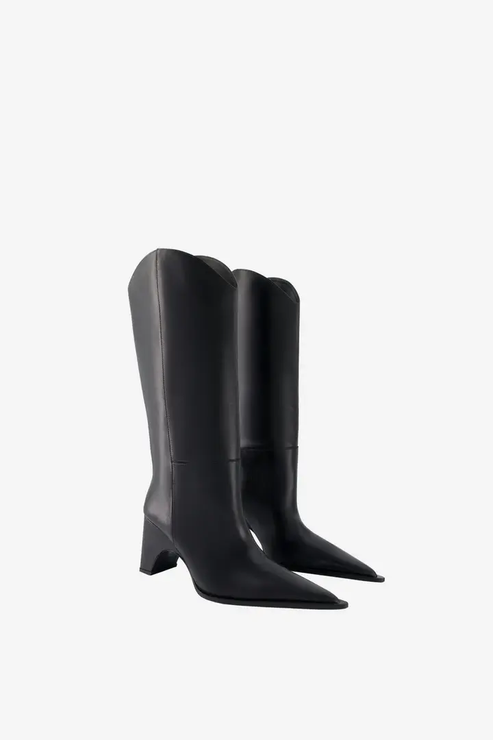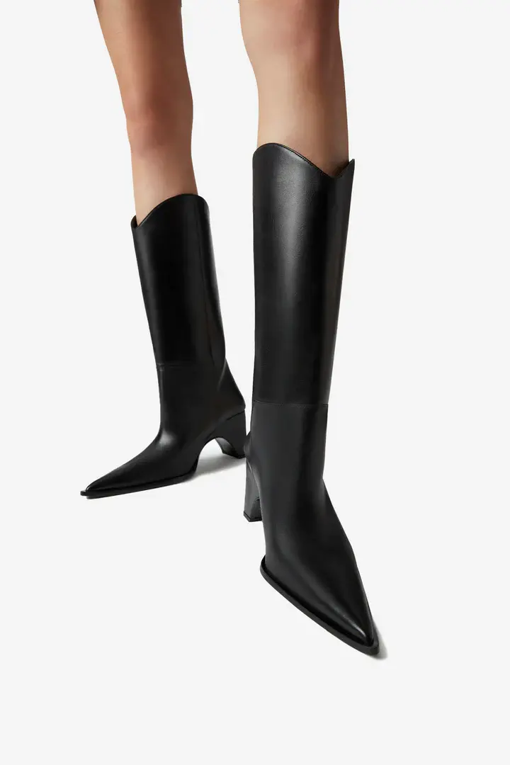 Mid-calf cowboy boot in soft black leather with a sculptural block heel