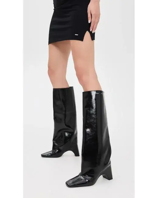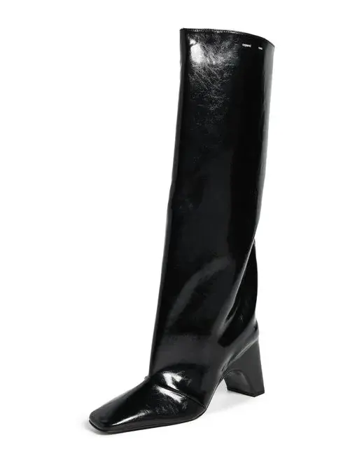 Upper: Faux leather. Elastic insets. Logo at side. Textured finish. Lining: Leather. Arched chunky heel. No closure, pull-on design. Square toe. Leather sole with rubber heel cap