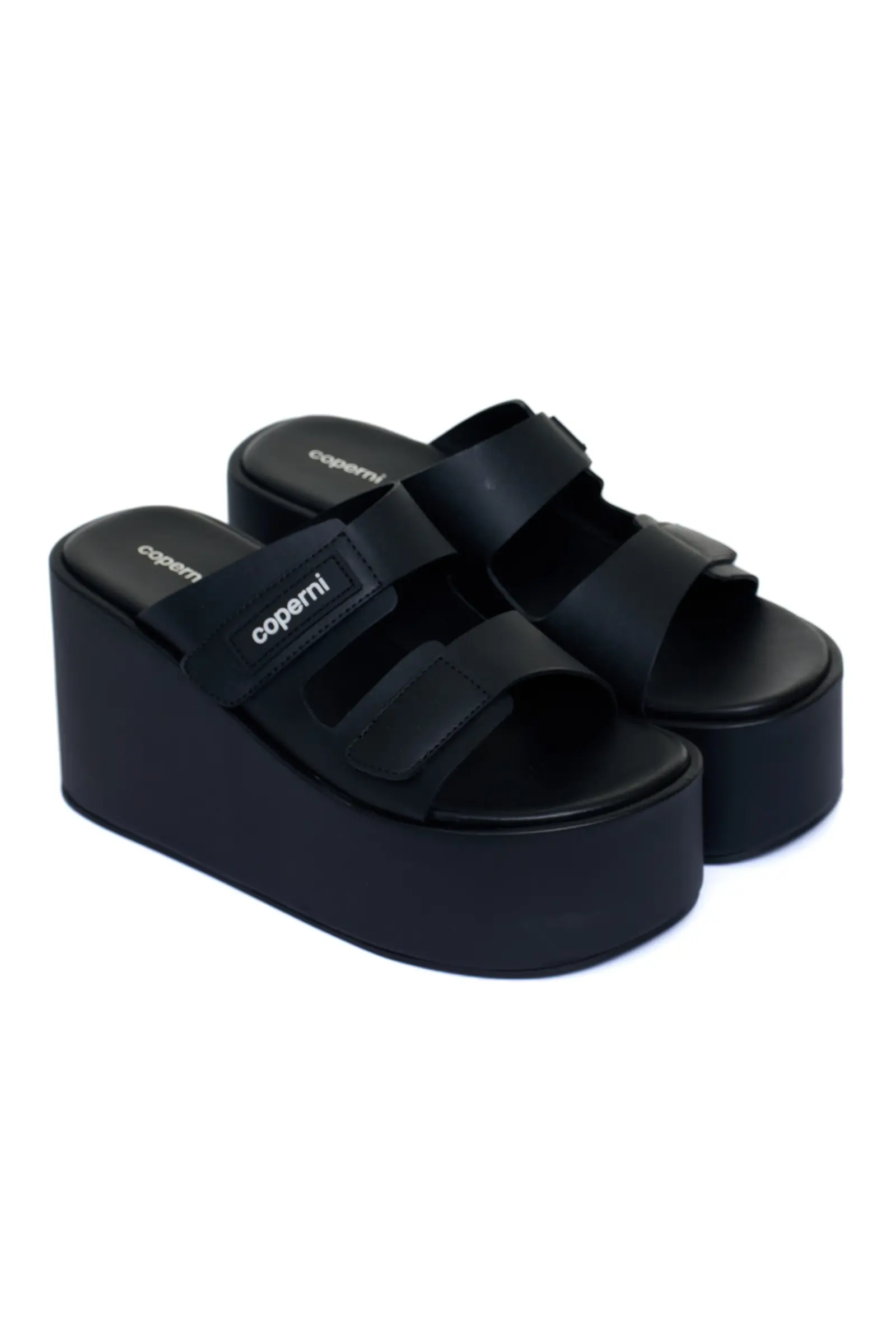These black-on-black wedges are an elevated spin on the ever-popular summertime two-strap sandal style. Set on high, lightweight platform soles, they allow for a steady, balanced stride supported by two sturdy straps that fasten with velcro, one embellished with a Coperni patch logo. Wear them with other items from the Coperni collection.