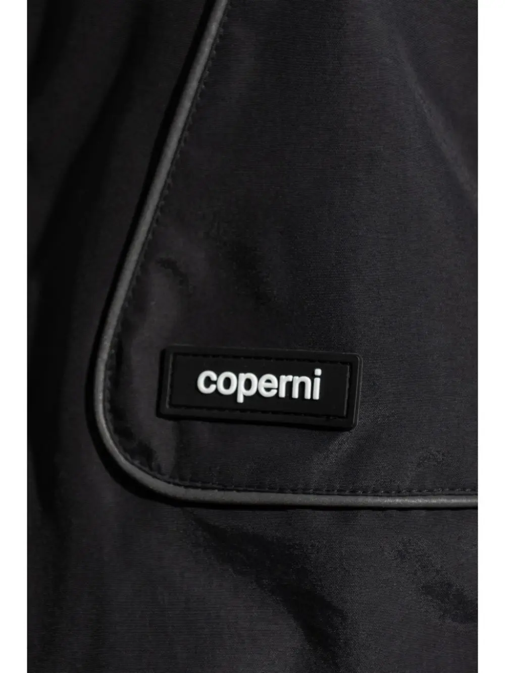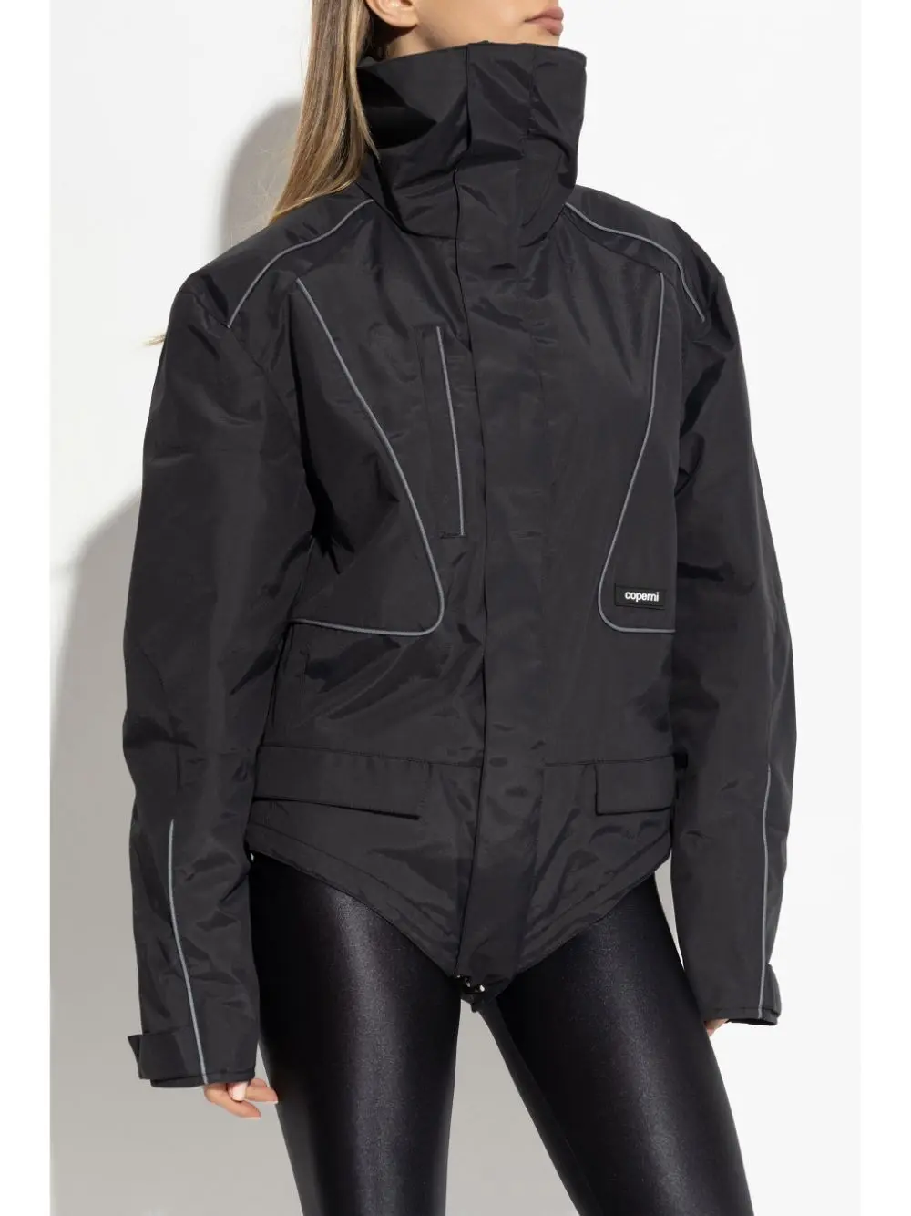 Versatility and adaptability are central to Coperni's design ethos, as are material innovation and creative engineering guided by advances in science and technology. This unique body jacket bridges the gap between outerwear, sportswear and evening wear and blends a contemporary vision with a touch of retro flair. Crafted from military green nylon, it features a wide collar that can be buttoned up to a high funnel neck or folded down to reveal bolts of vibrant mint green. White pipping adds a sporty touch to sleeves and side panels, while the bottom of the garment can be tucked up and fastened internally, transforming the piece into a classic jacket shape.