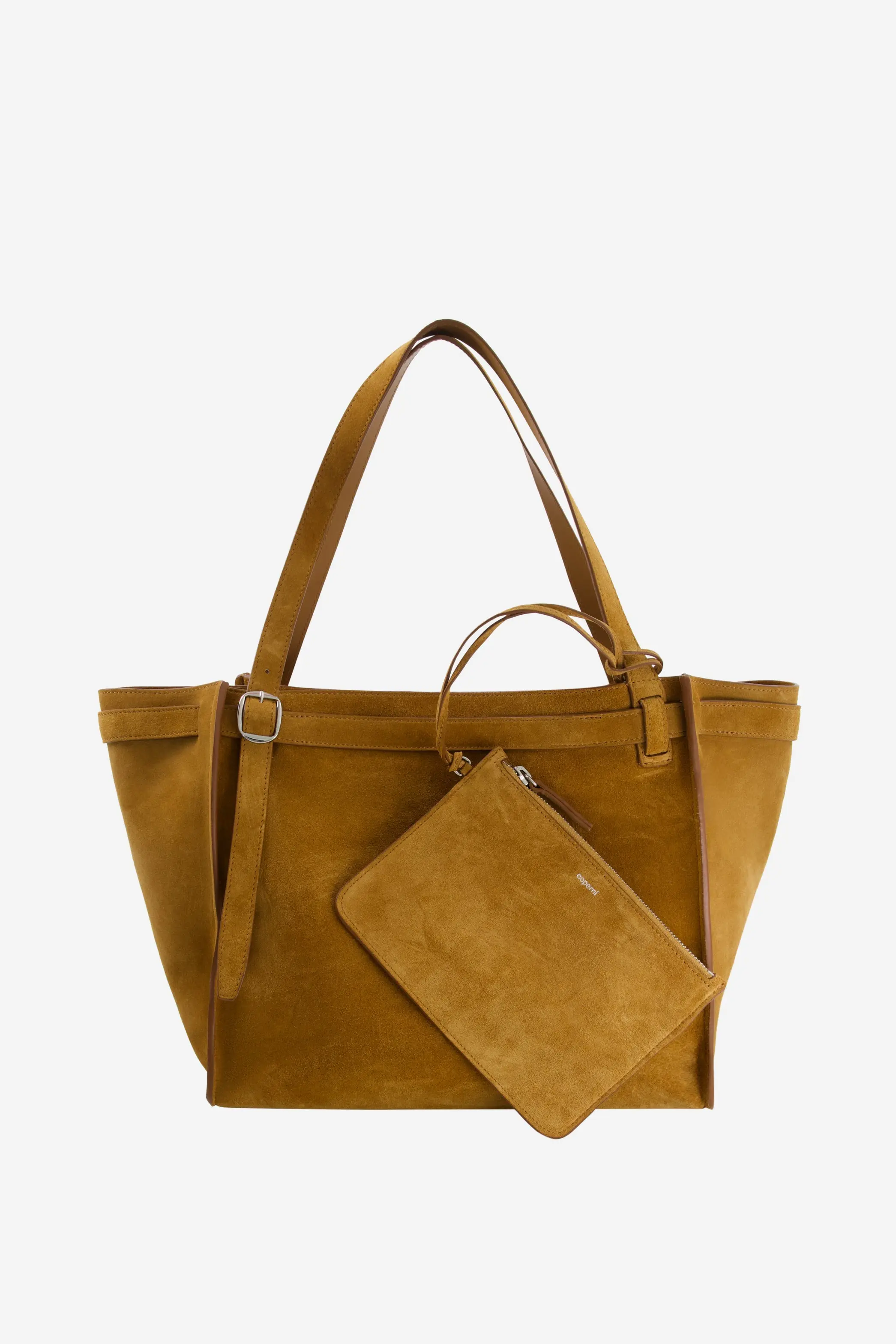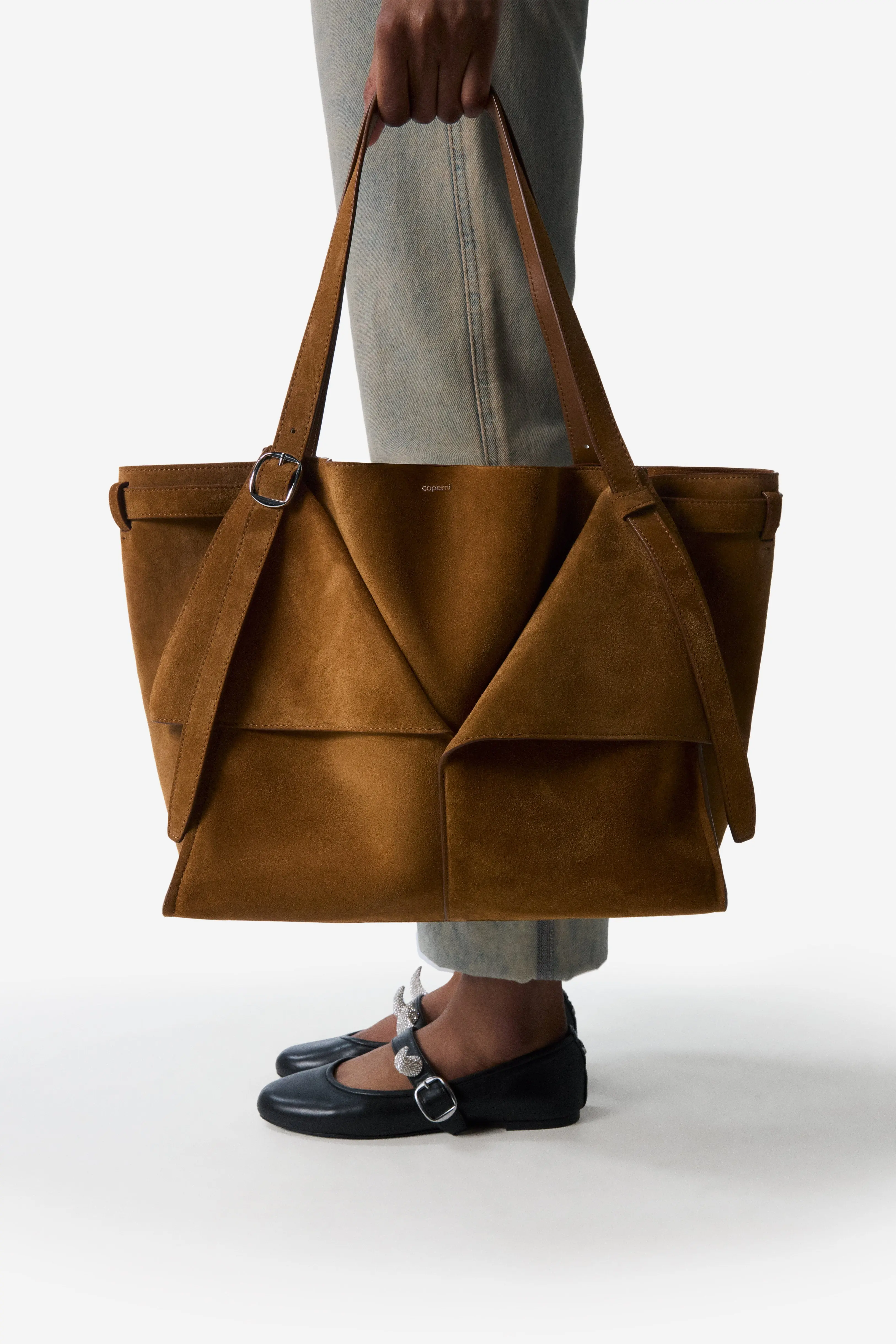 This minimalist Cabas bag has an origami-like design using folds of suede to create a geometrically constructed style which combines the strictness of straight lights with soft tucks and curves. Generously shaped to hold all you need for the day, the bag is crafted from tactile suede in a dark caramel tone. It has slim adjustable shoulder straps inspired by a belt, complete with buckle, punch holes and tucking loop.