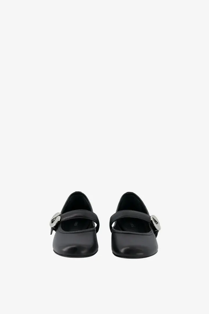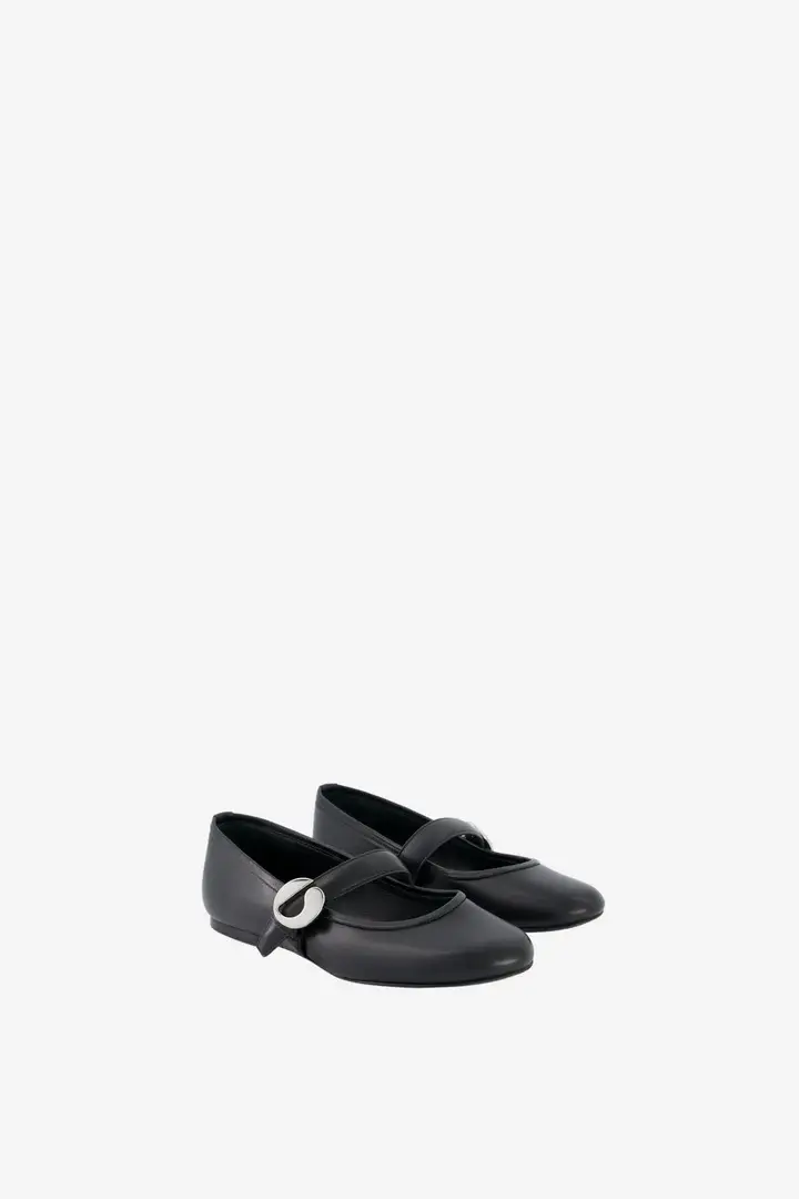 Mary Jane ballet flats crafted from supple black leather with a round toe silhouette and thick supportive straps. They fasten with a statement C-shaped silver logo buckle. Leather Made in Spain