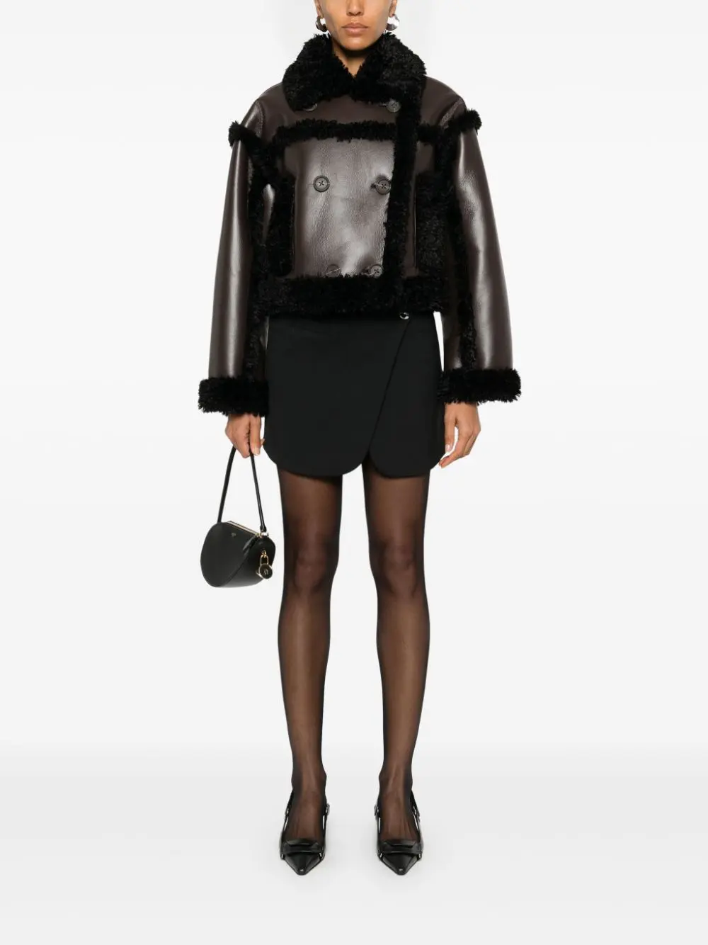 ▪black ▪twill weave ▪tailored design ▪wrap design ▪press-stud fastening ▪silver-tone logo plaque ▪front welt pocket ▪full lining ▪thigh-length