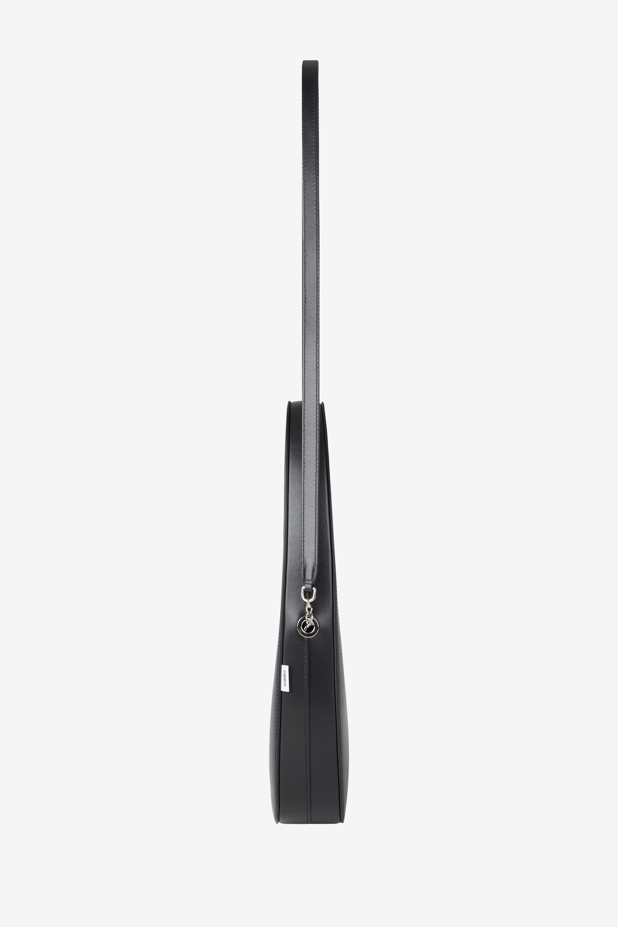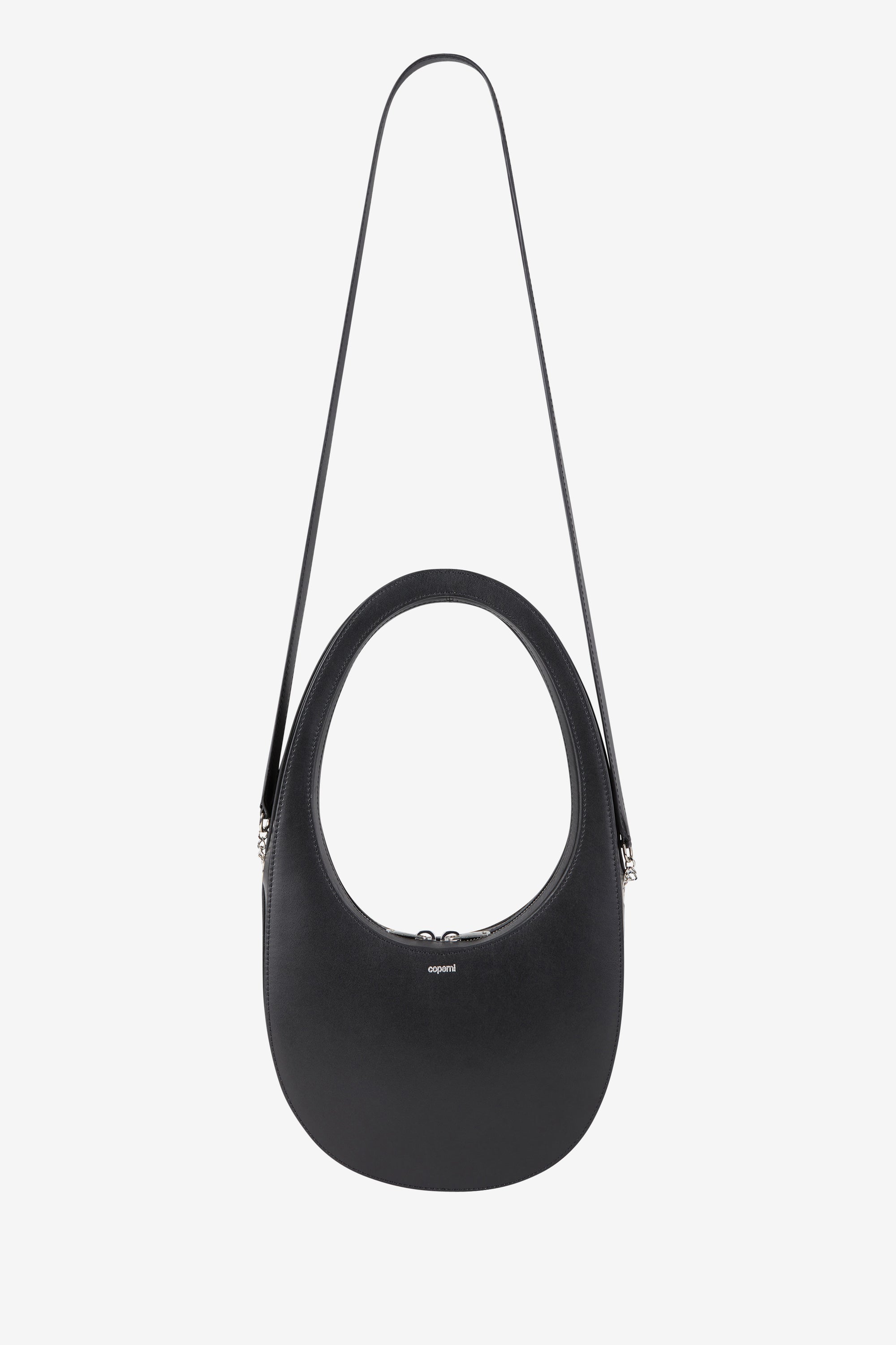 With its practical size and lightweight feel, the Coperni signature Swipe Bag, seen here in black, tucks neatly under the arm and takes you seamlessly from day to night. Crafted from prestige Italian leather, the bag features a shielded circular double-ended zip and can be hand carried or worn cross-body thanks to a detachable strap.