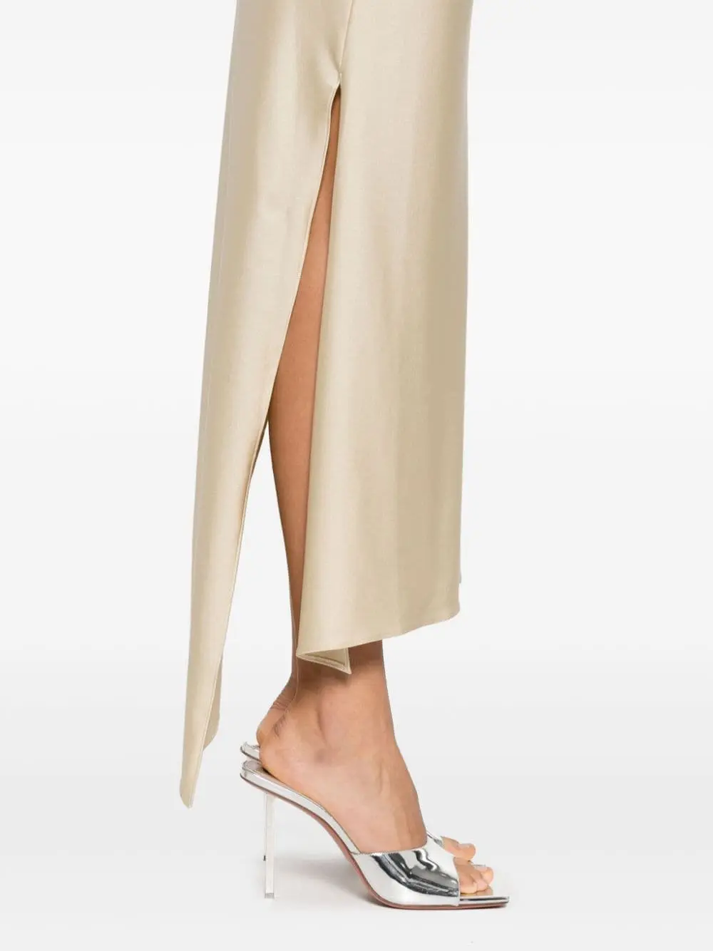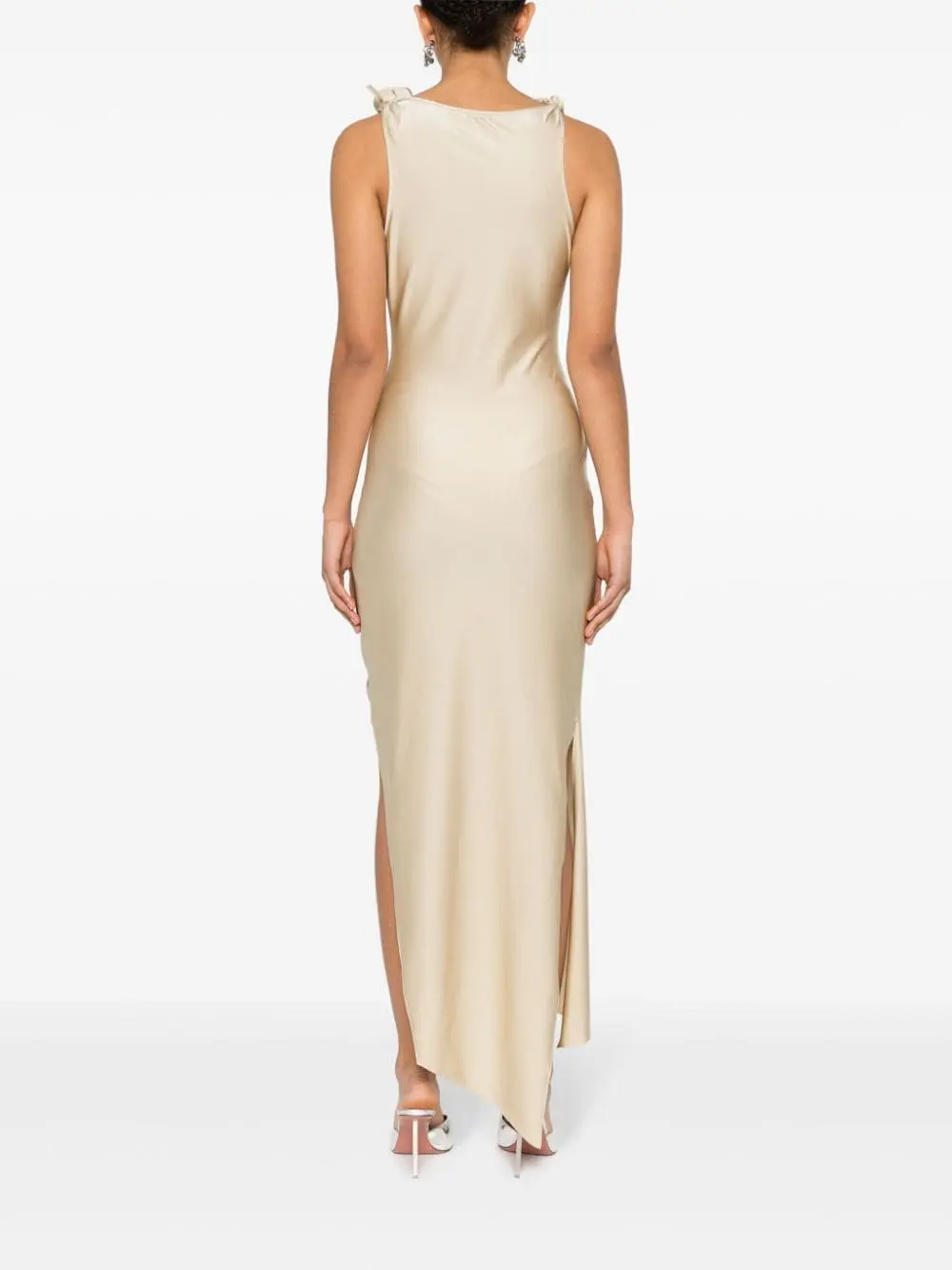 Cut with a subtle asymmetrical twist, this figure-sculpting gown is gently ruched and embellished with a deep front slit. Now a Coperni icon, the design comes in new colour ways and materials: here, in a shimmering beige stretch jersey that catches the light day and night. The dress has a dynamic cut-out neckline punctuated by three swirling fabric roses for a knotted effect.