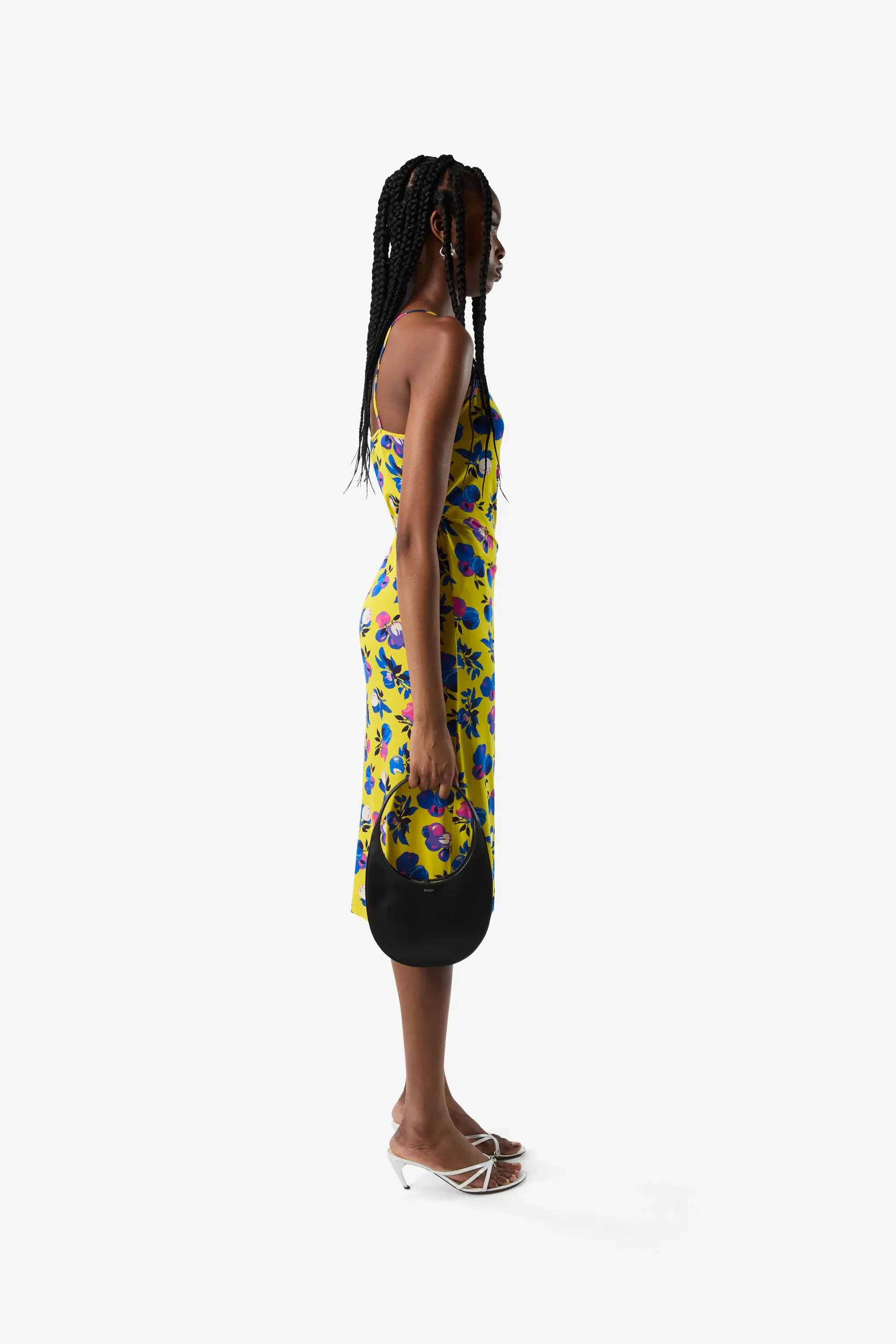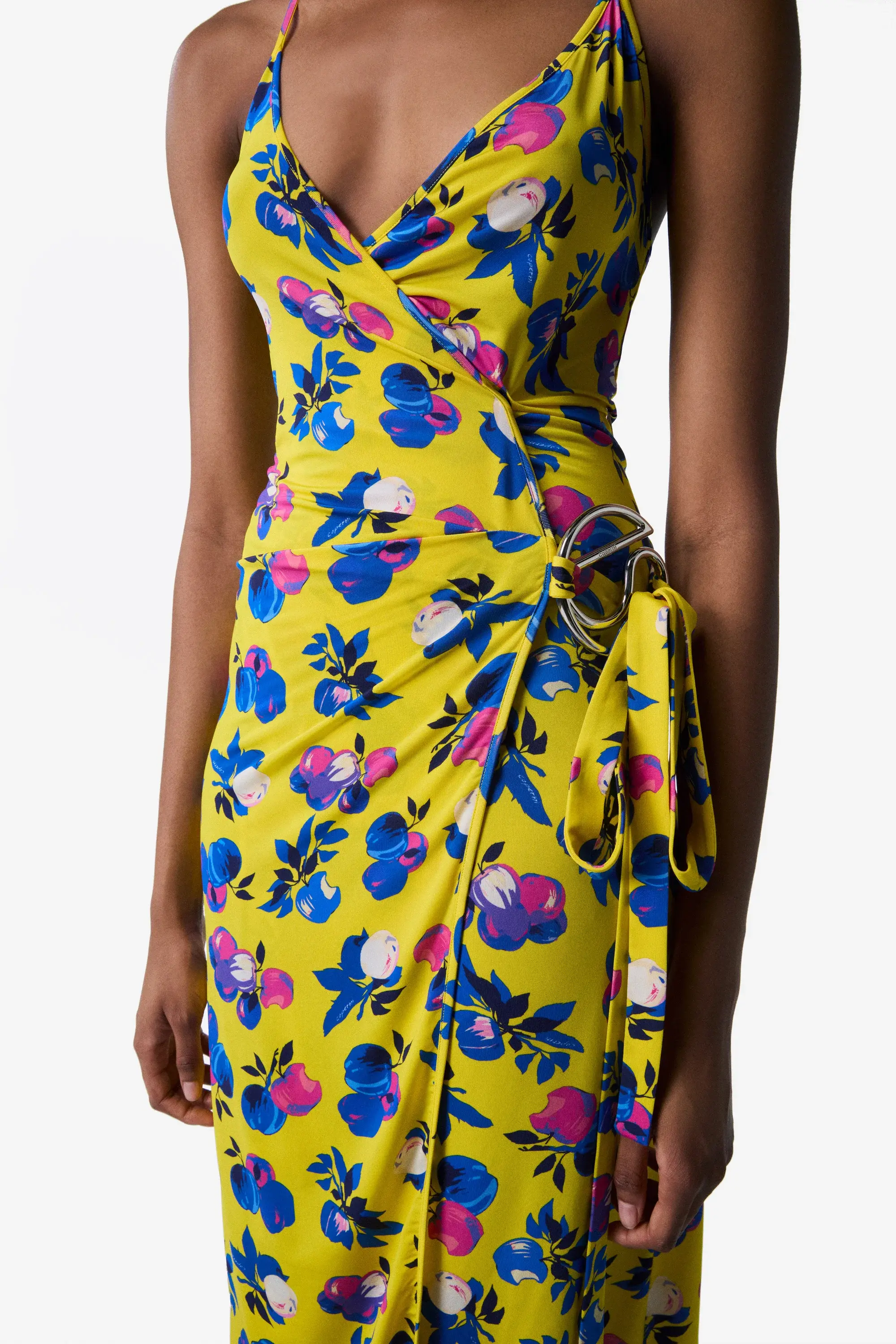 Bright, lightweight and joyful, this jersey wrap dress is like a second skin that cocoons you in comfort. Designed to gently flow over your form, it features dainty spaghetti straps and a skirt that softly opens up at the thigh and falls into an asymmetrical hem. The pattern - blue-toned apples over a bright canary yellow background - is a subtle tribute to Silicon Valley, the central theme of Coperni's SS25 Resort collection. The fruity motif alludes to technology, as well as the areas of natural beauty that surround this Northern Californian location, spotlighting a positive connection between tech and nature, a driving force behind Coperni's design practises.
