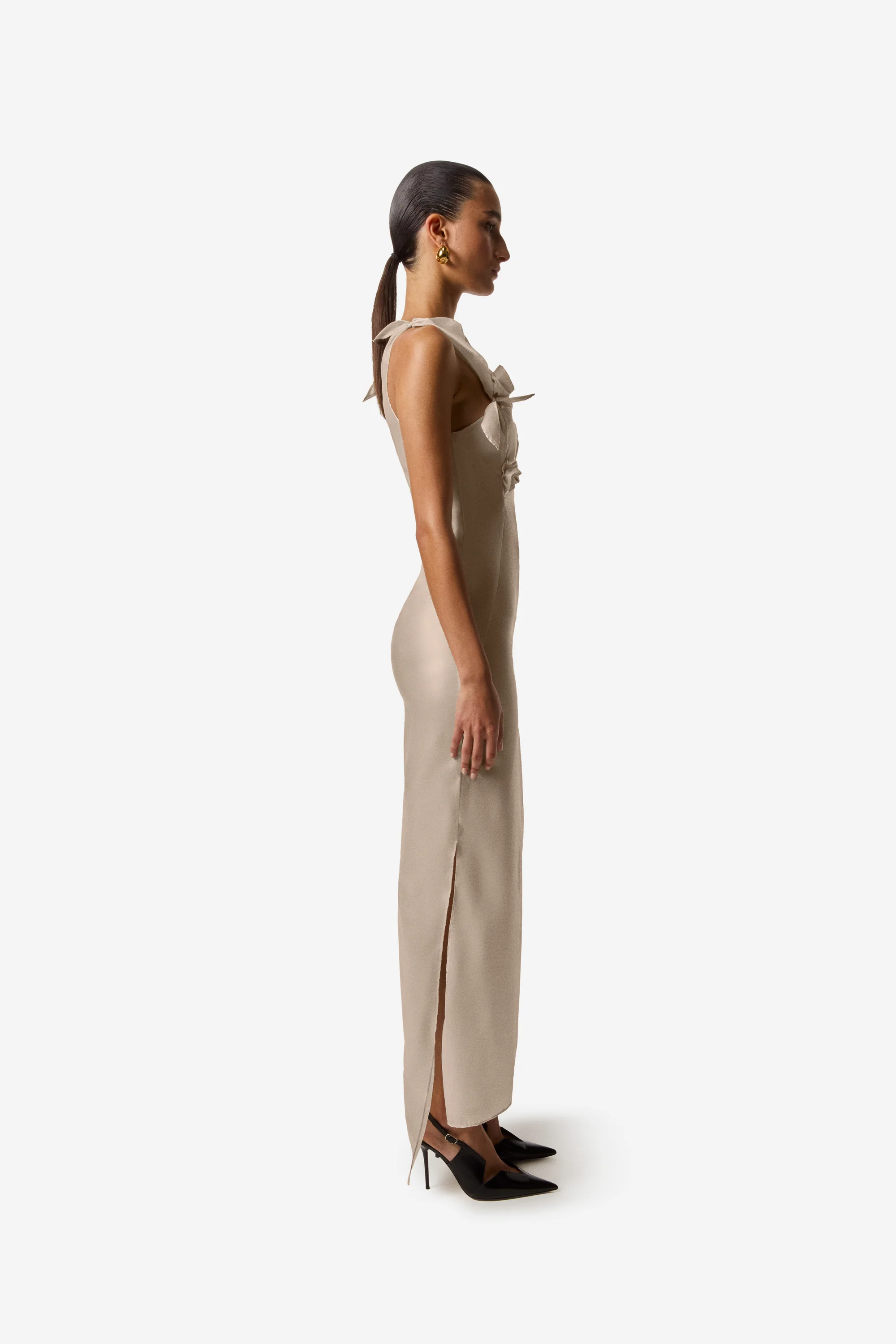 Cut with a subtle asymmetrical twist, this figure-sculpting gown is gently ruched and embellished with a deep front slit. Now a Coperni icon, the design comes in new colour ways and materials: here, in a shimmering beige stretch jersey that catches the light day and night. The dress has a dynamic cut-out neckline punctuated by three swirling fabric roses for a knotted effect.