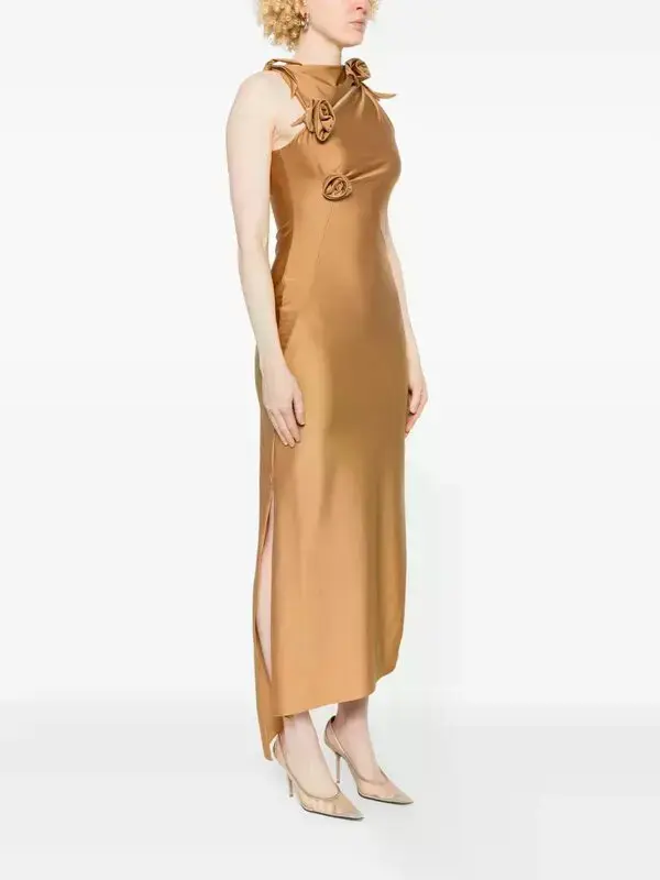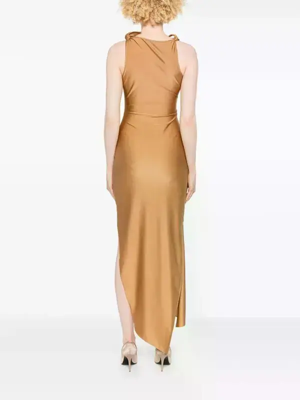 Cut with a subtle asymmetrical twist, this figure-sculpting gown is gently ruched and embellished with a deep front slit. Now a Coperni icon, the design comes in new colourways and materials: here, in a bright sapphire blue stretch jersey that commands attention day and night. The dress has a dynamic cut-out neckline punctuated by three swirling fabric roses for a knotted effect.