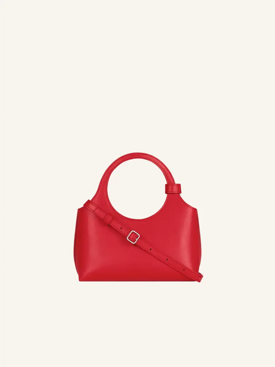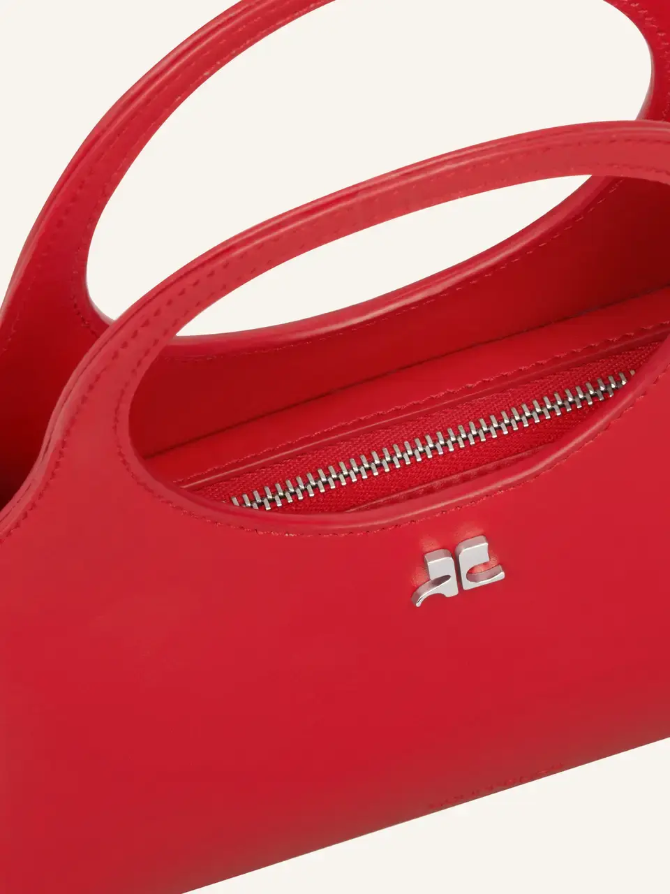 Mini Holy Day in smooth calf leather. Zipped closure and metallic AC logo. Embossed "Courrèges" logo on front. Buckle detail on handles and interior pocket. Adjustable and removable shoulder strap.