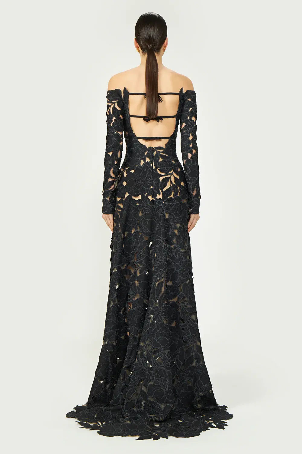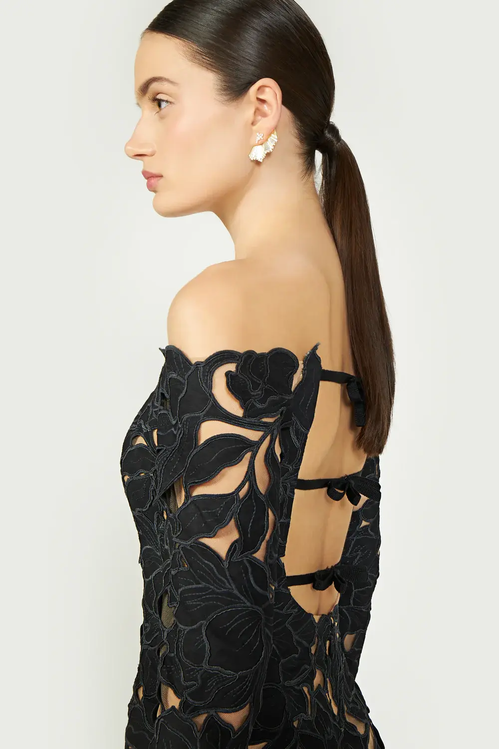 A mesmerizing off-shoulder gown crafted from intricate floral-cut corded lace. This design features exquisite scalloped edges, a dramatic cutout back, and refined ribbon and bow accents. The epitome of timeless sophistication and effortless allure.