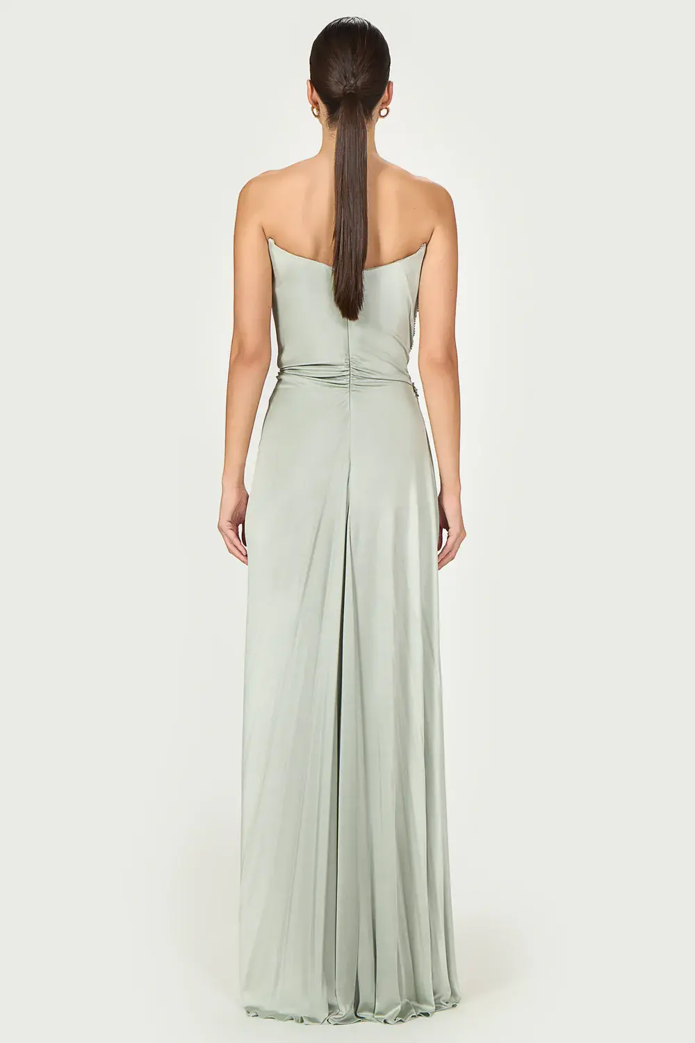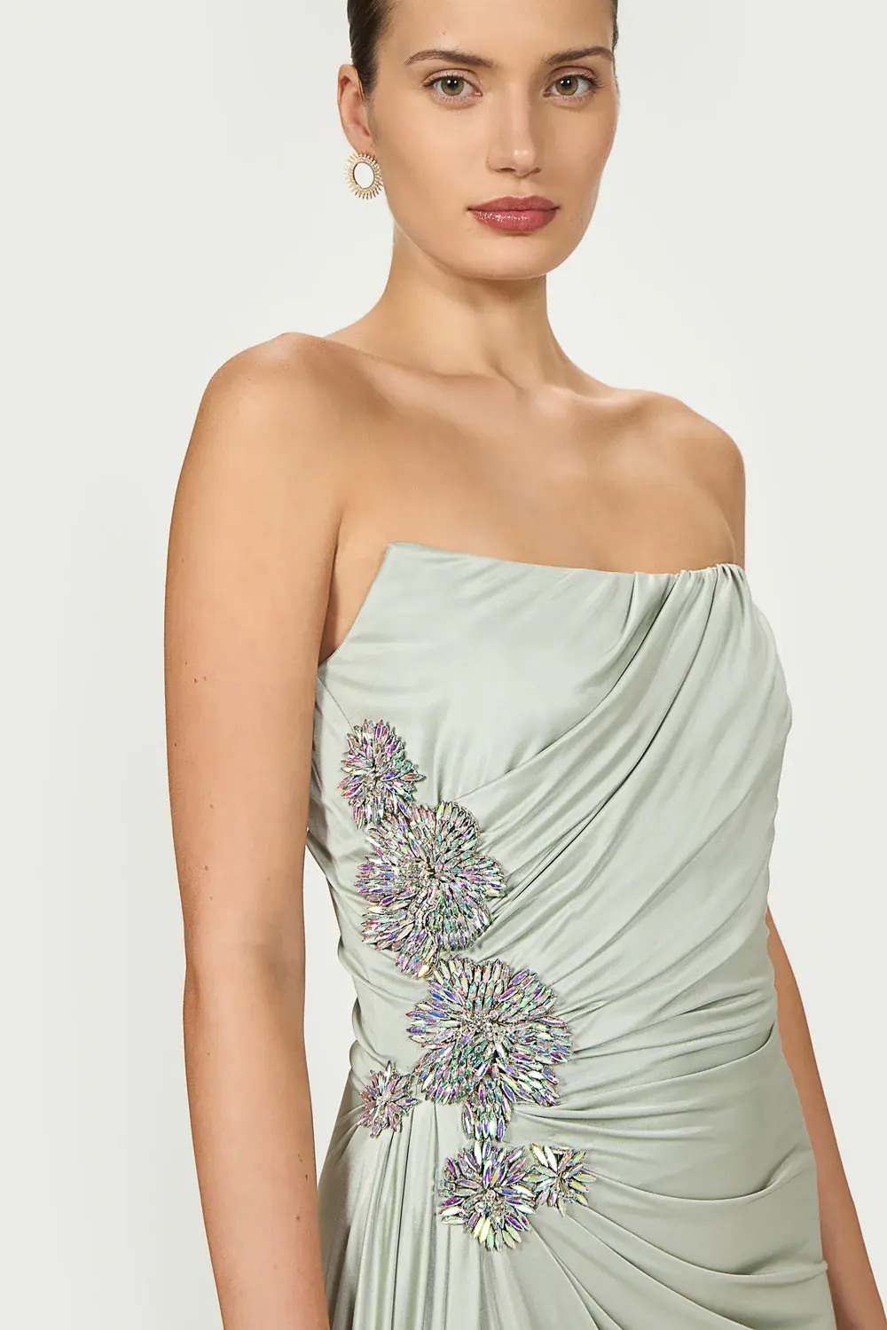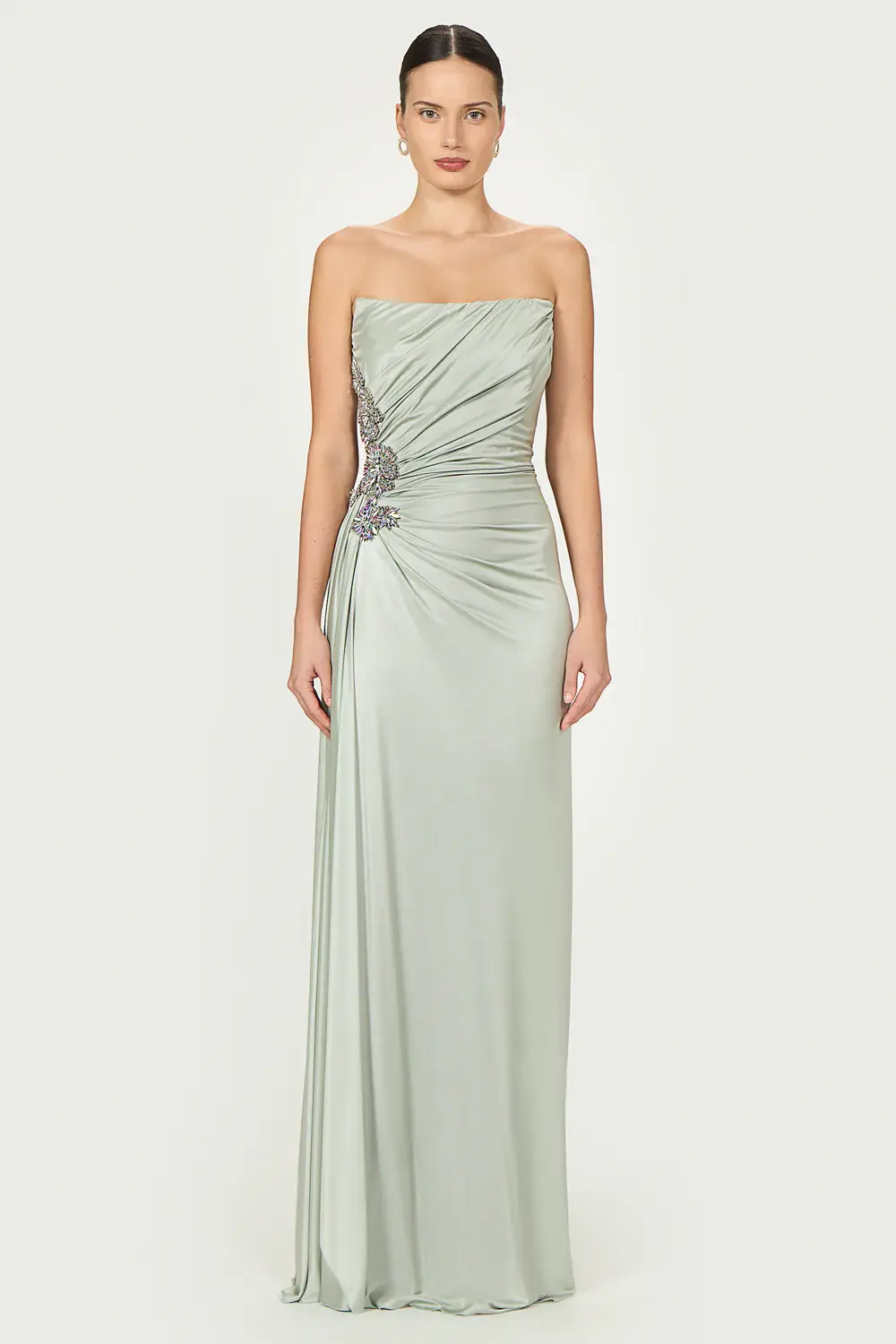 Stun in the Lorinne glossy jersey strapless gown, featuring boning for structure and embellished with an impressive side slit and intricate hand-beaded crystals on the side.