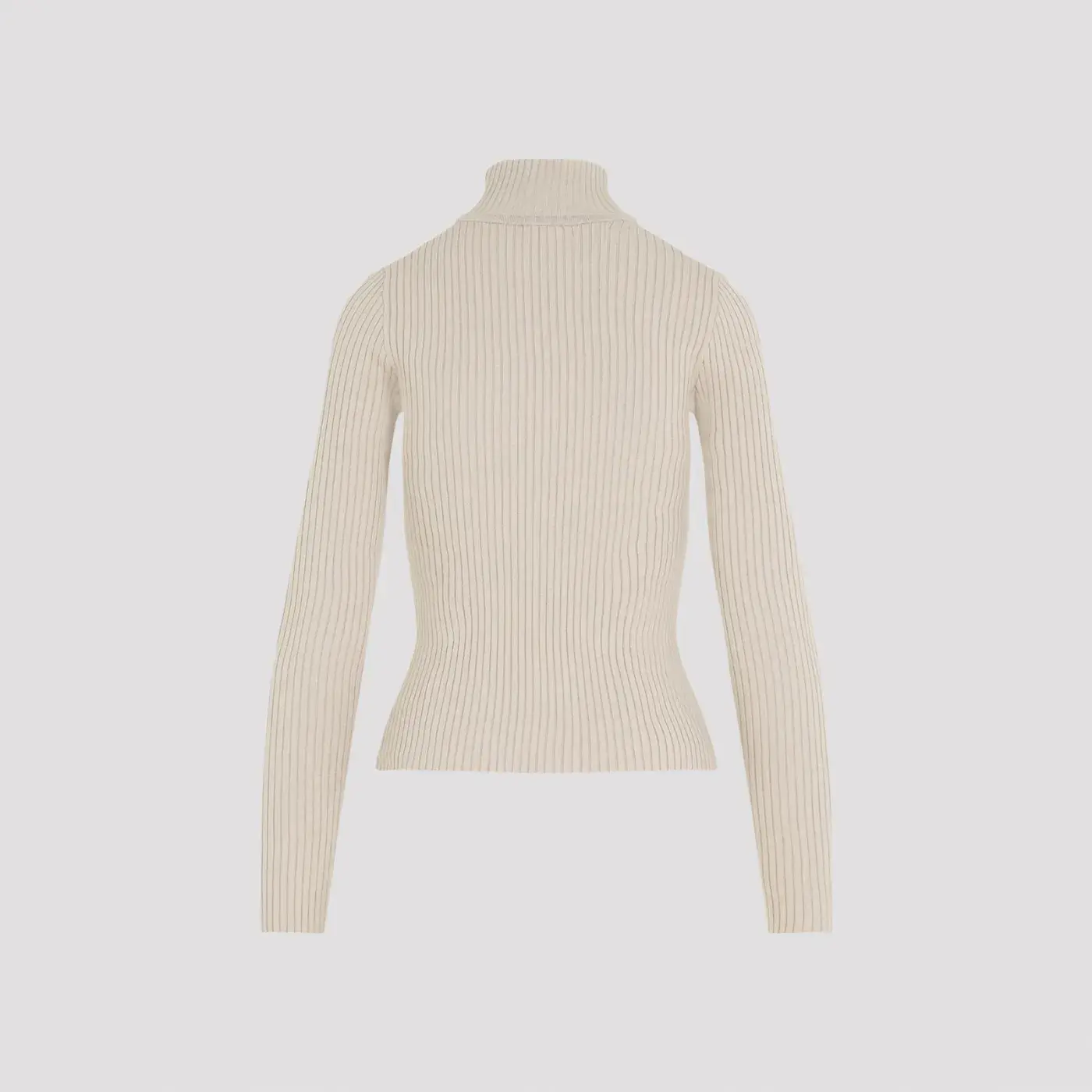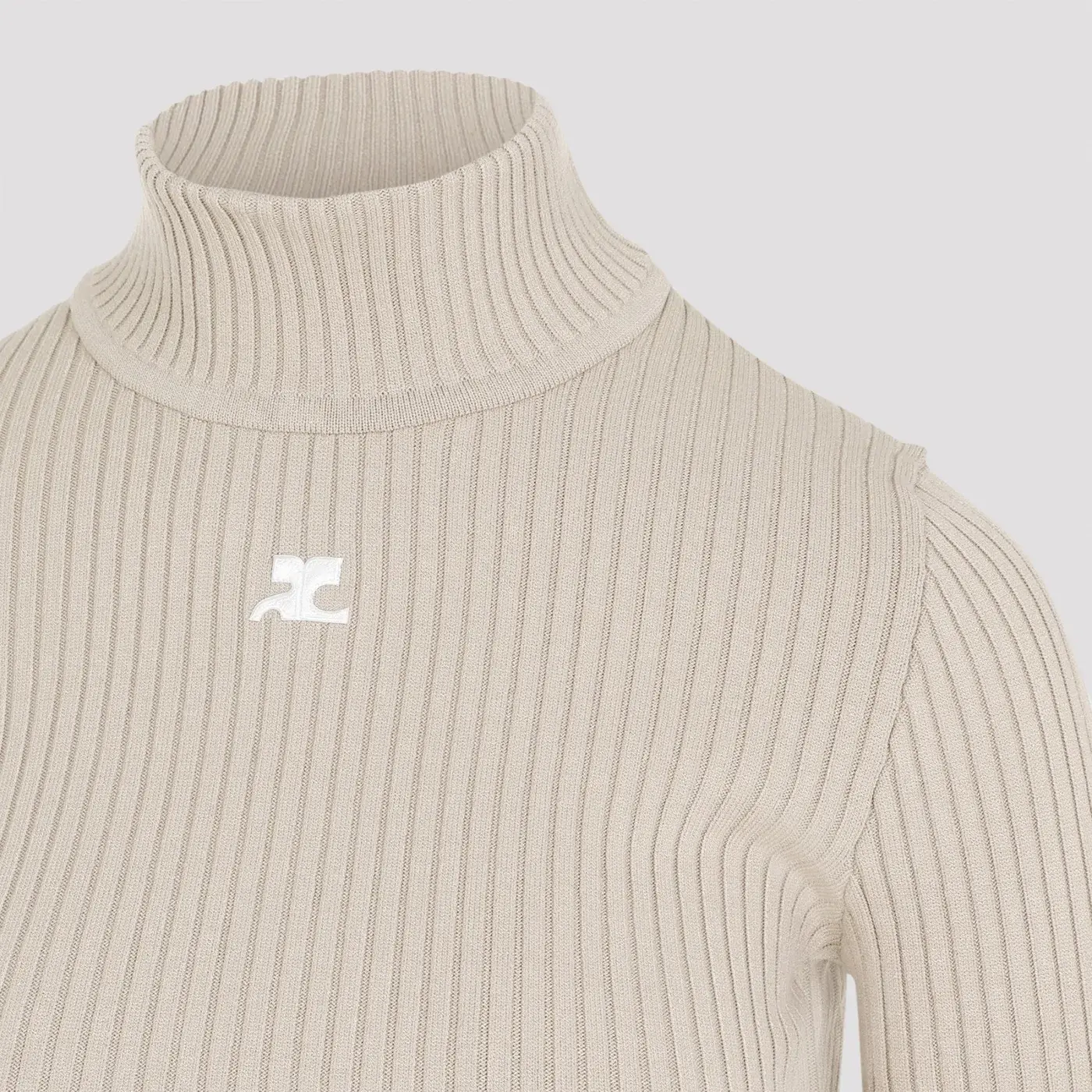 Courrèges Cappuccino Roll Neck Ribbed Jumper. Cappuccino viscose blend, ribbed knit, roll neck, long sleeves, embroidered logo on front in white, straight hem.